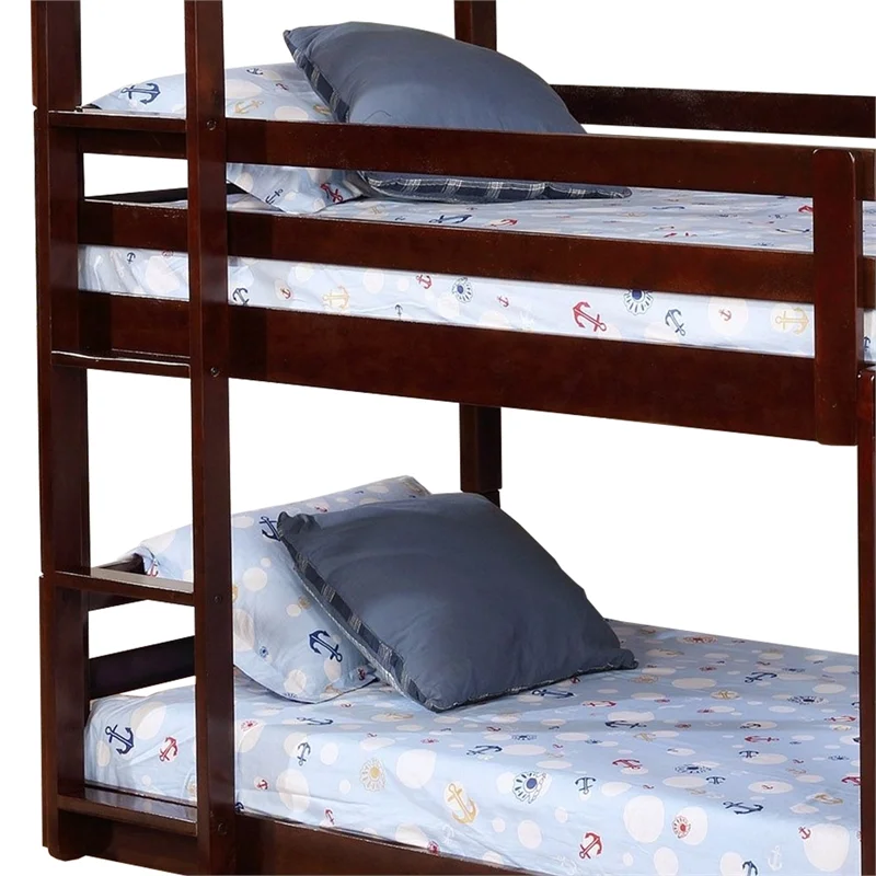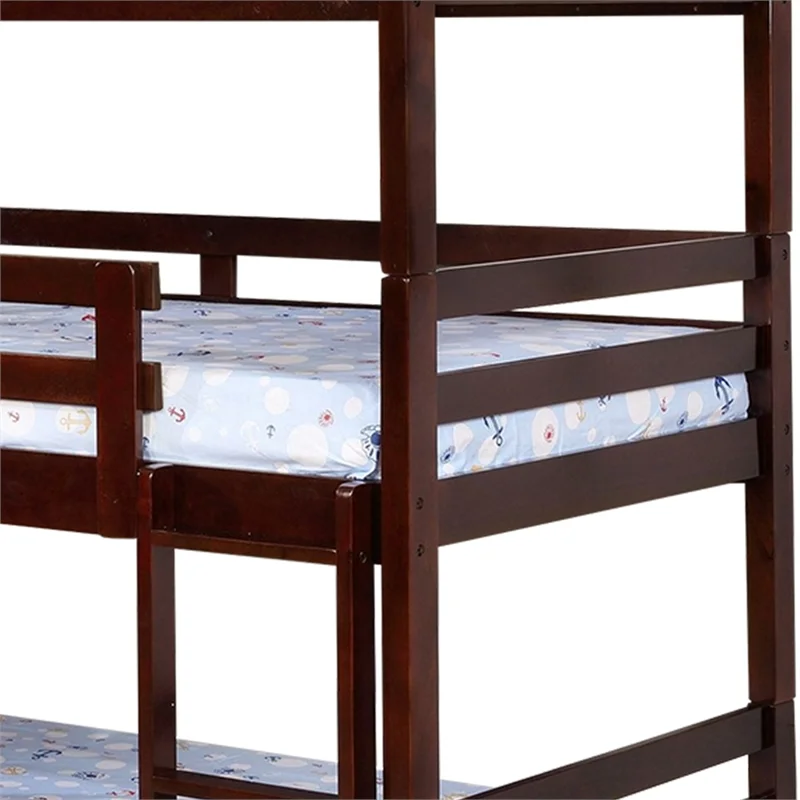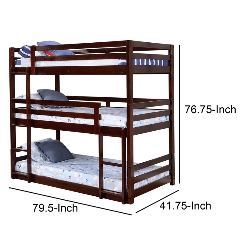 3 Tier Design Wooden Twin Size Bunk Bed with Attached Guardrails in Brown