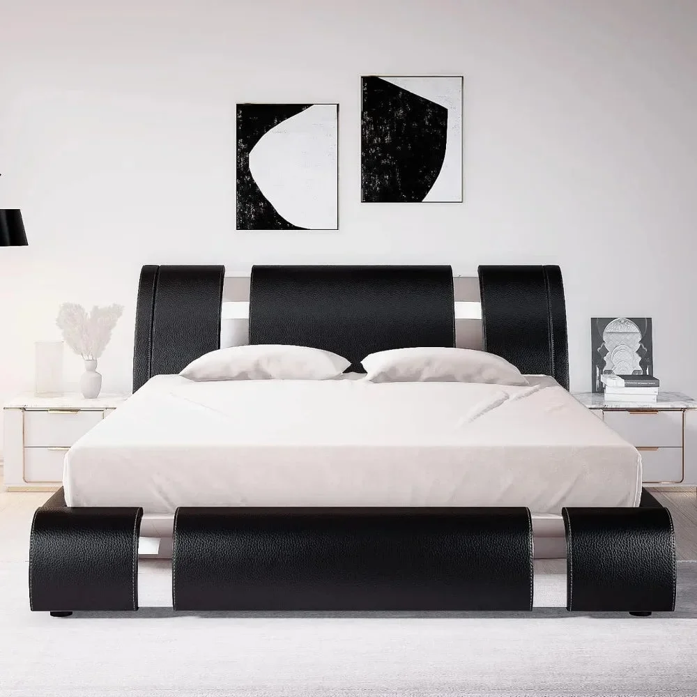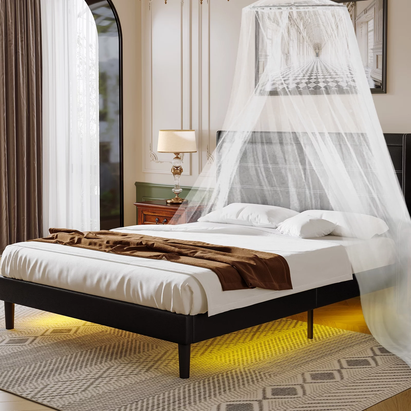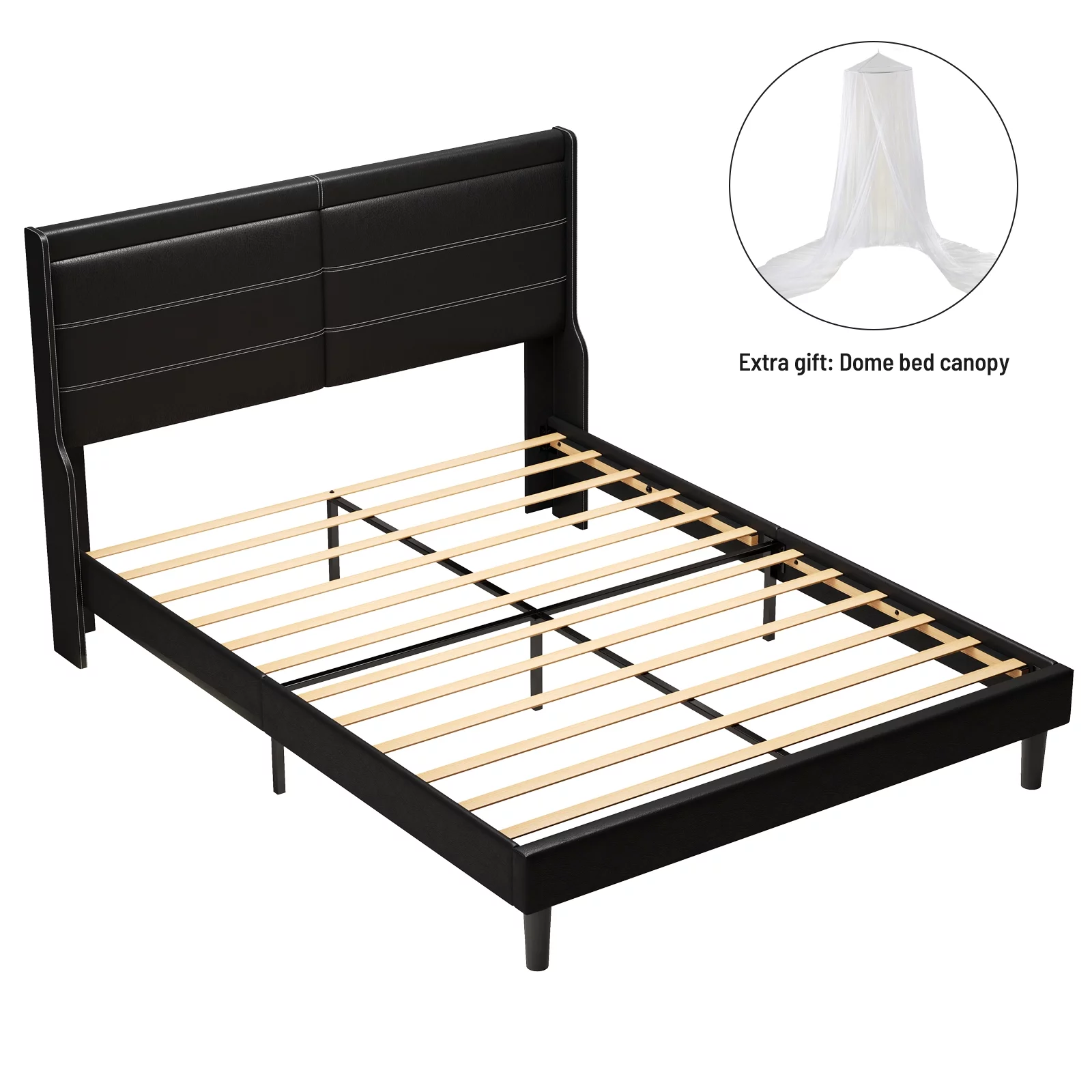 Andoer Queen Size Platform Bed with Under Bed Stripe PU Leather Padded Headboard Wooden Slats System Easy Assembly Black