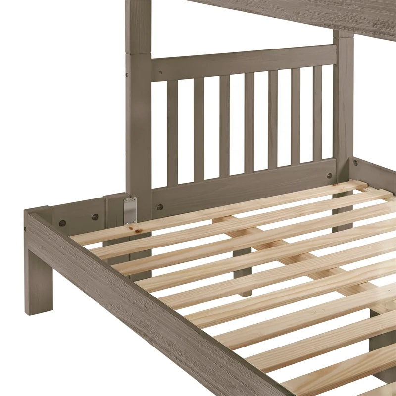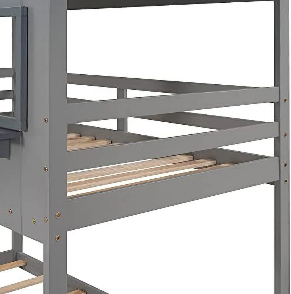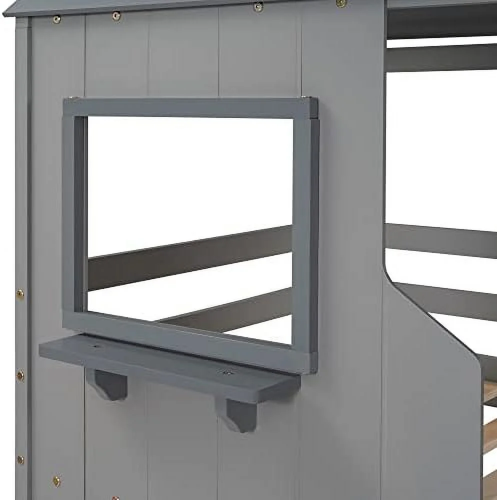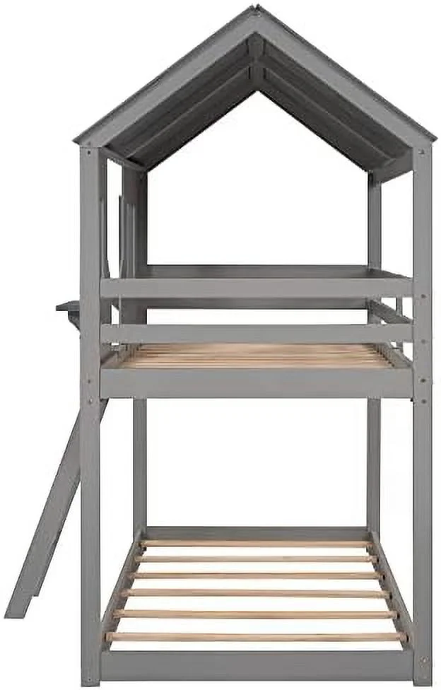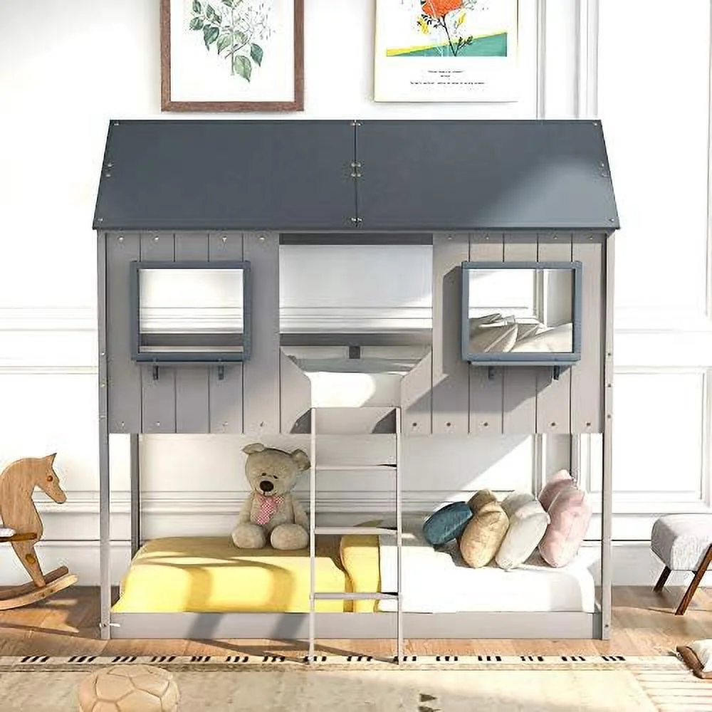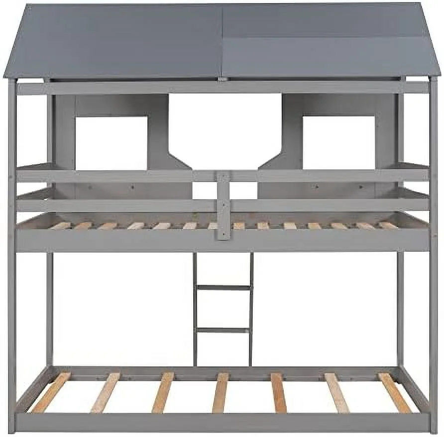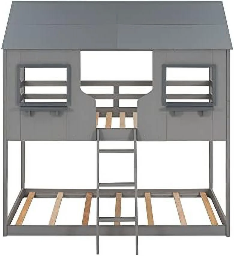 xrboomlife Twin-Over-Twin Wooden House Bed Bunk Bed with Playhouse Farmhouse Ladder and Guardrails/Grey