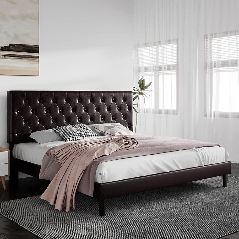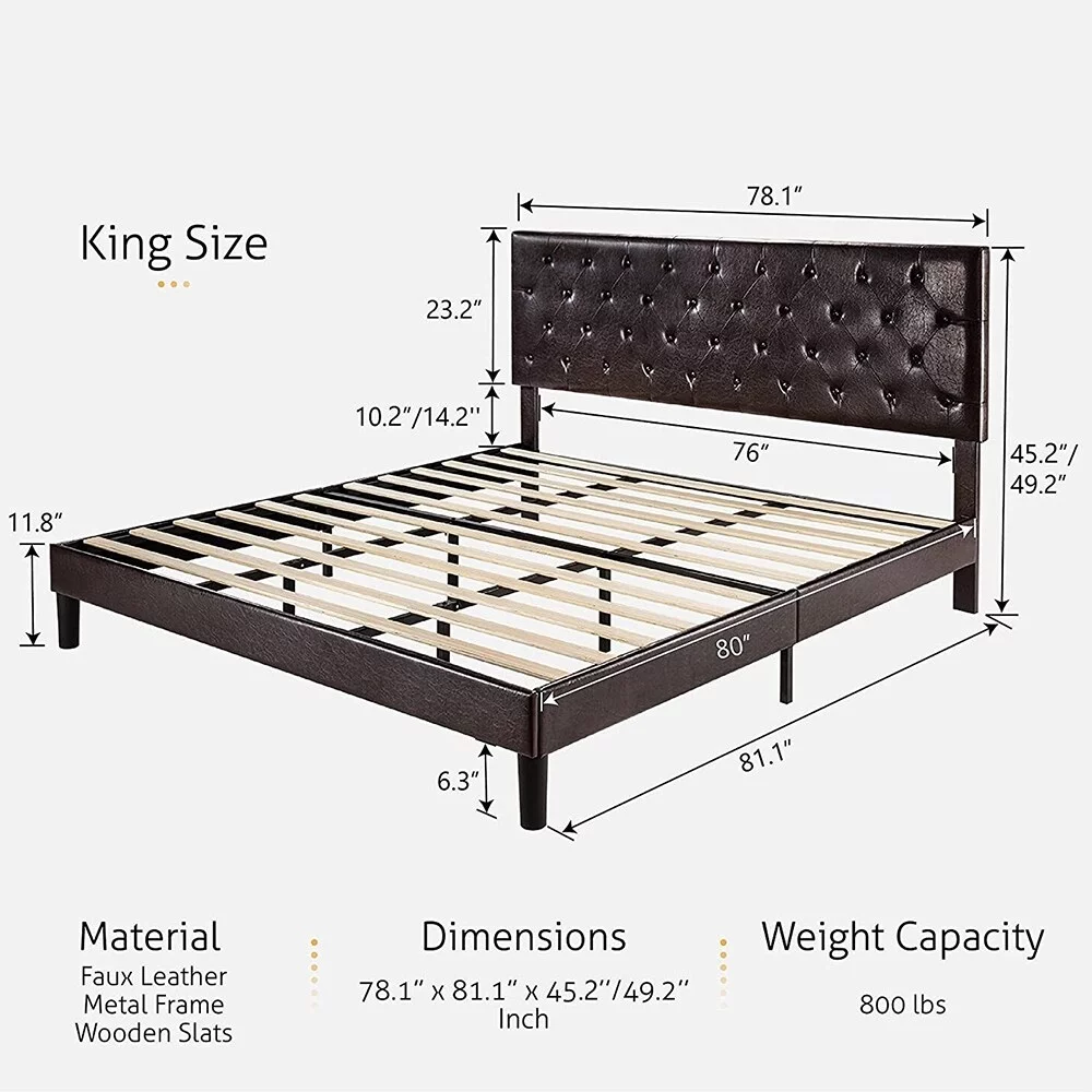 Bed frame, faux leather padded table bed with adjustable headboard, supported by wooden boards, oversized bed frame