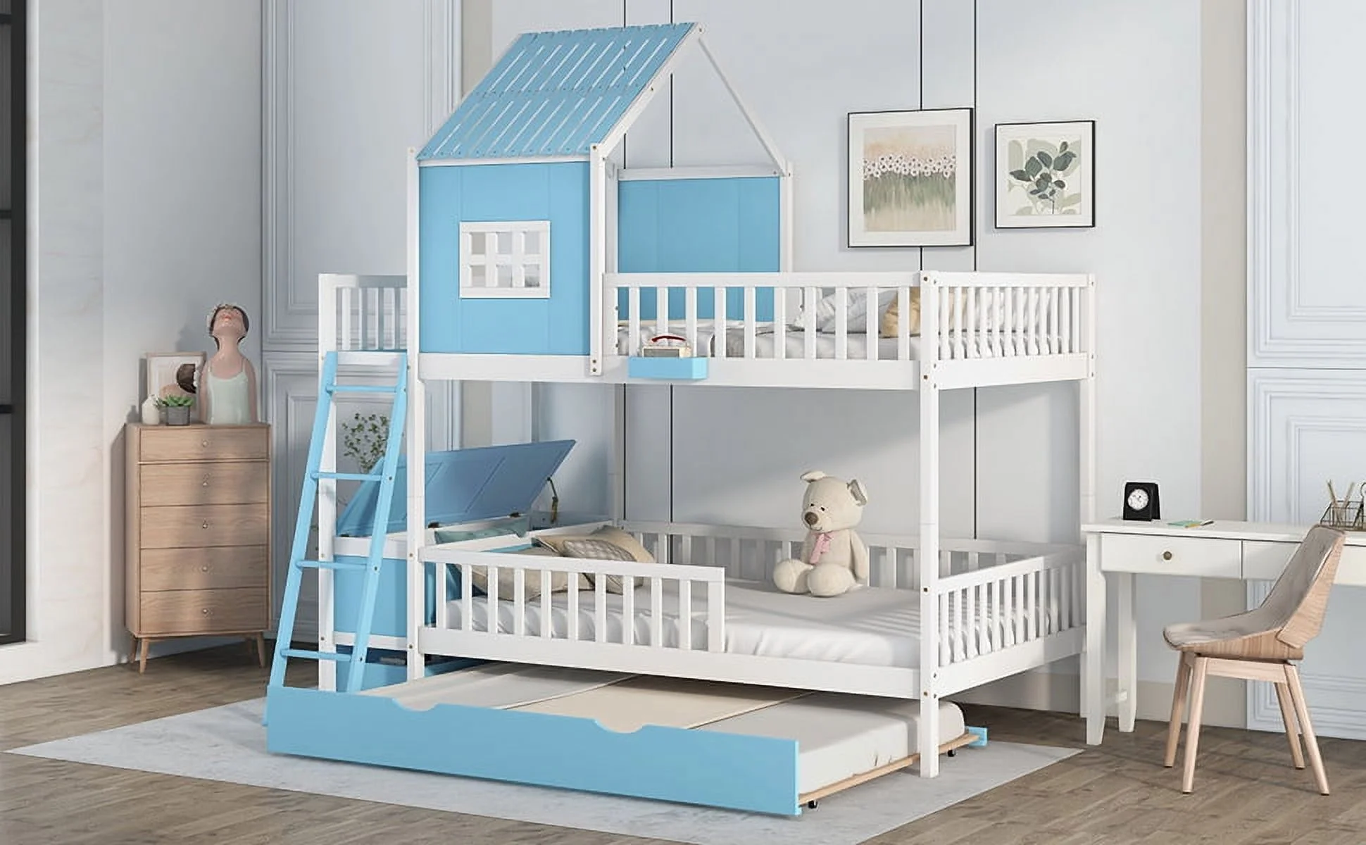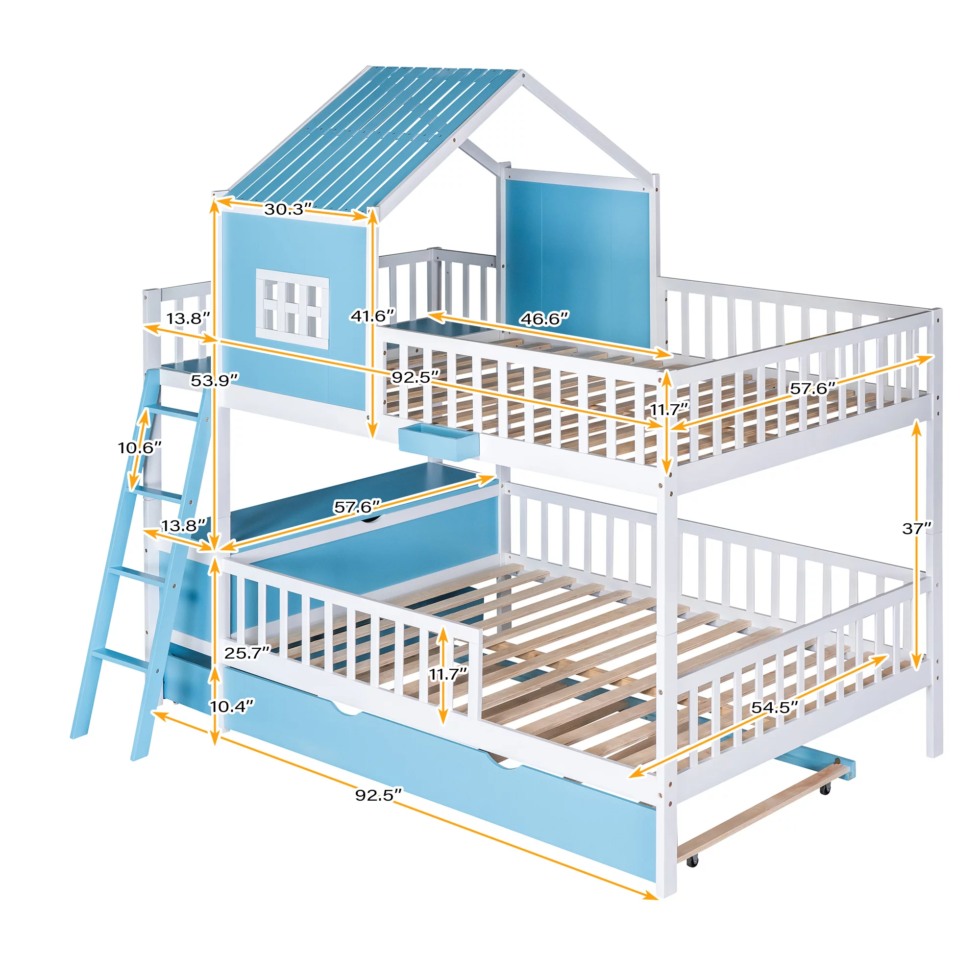 LANTRO JS Full over Full Bunk Bed with Twin Size Trundle, Farmhouse Bed with Storage Box and Drawer Blue