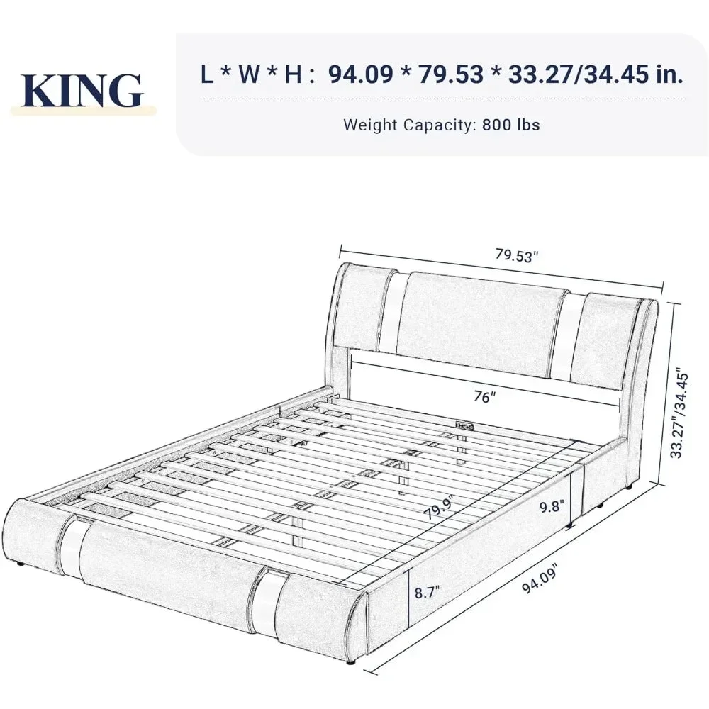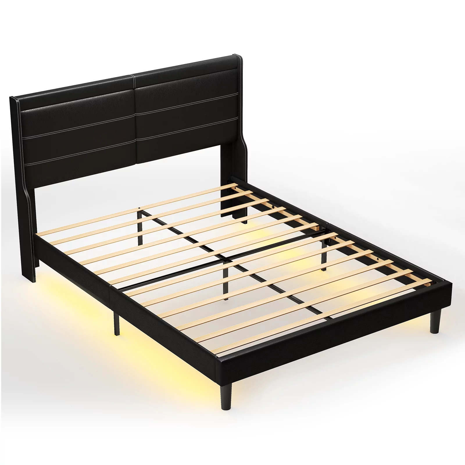 Queen Size Platform Bed with Under Bed Light Stripe PU Leather Padded Headboard Wooden Slats System Easy Assembly Black