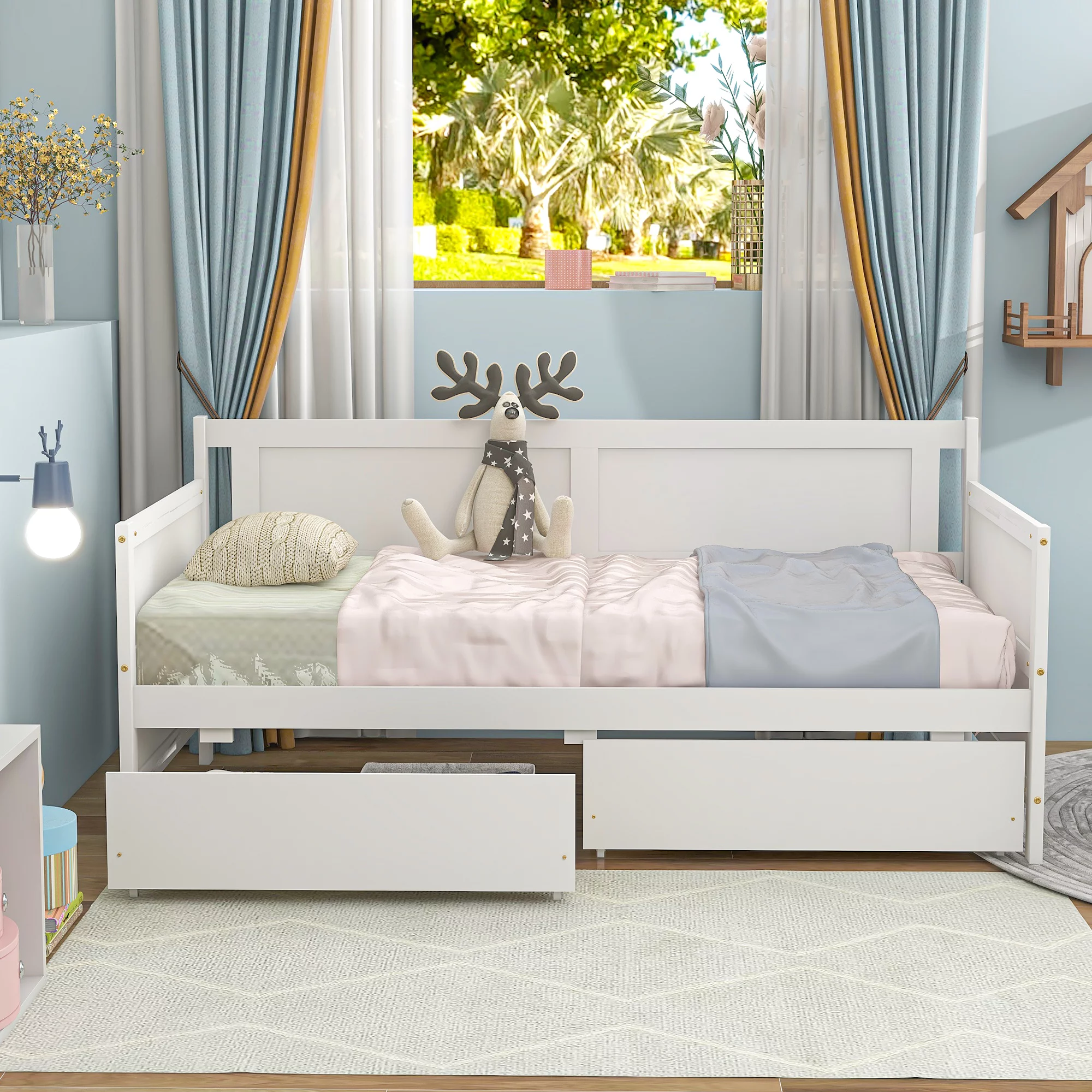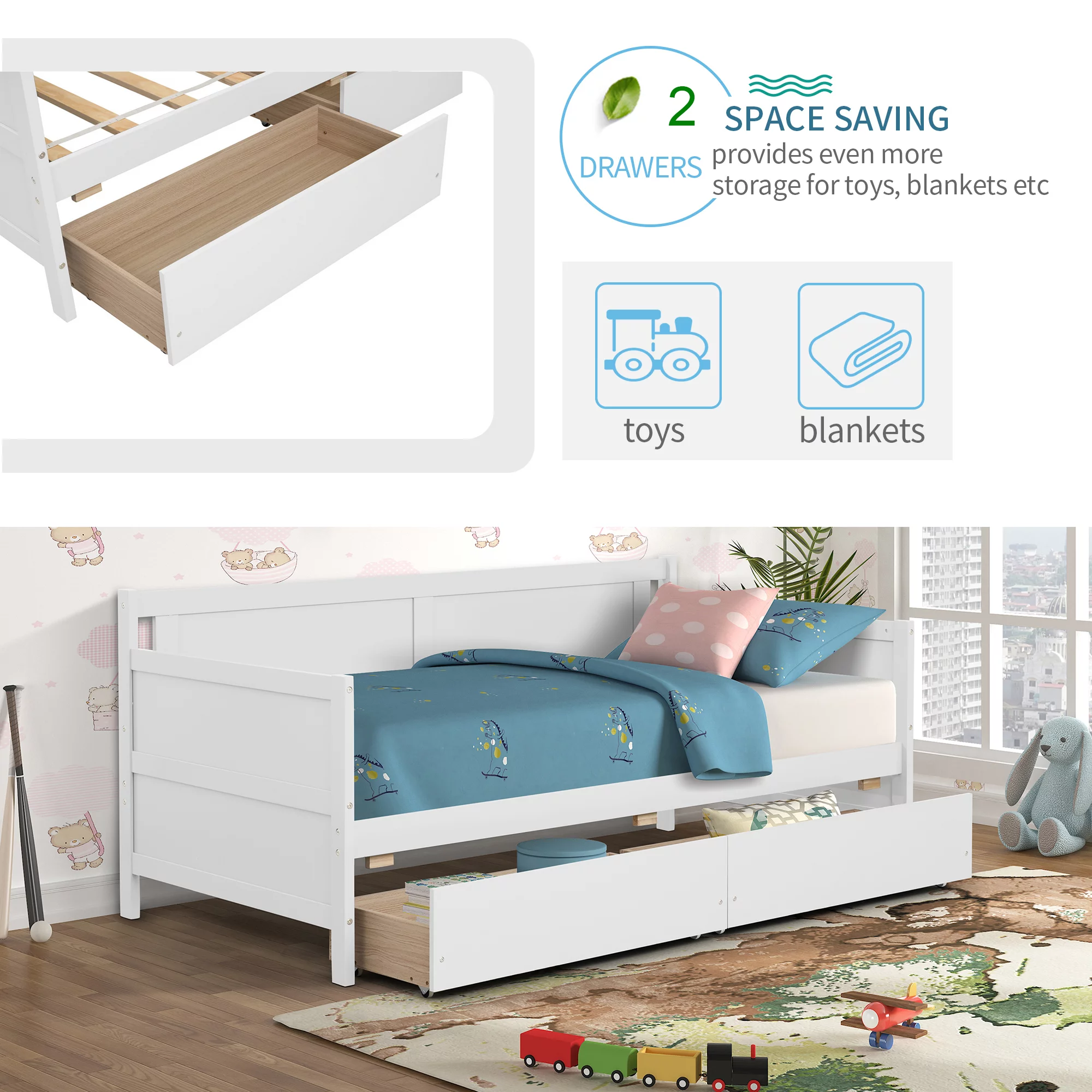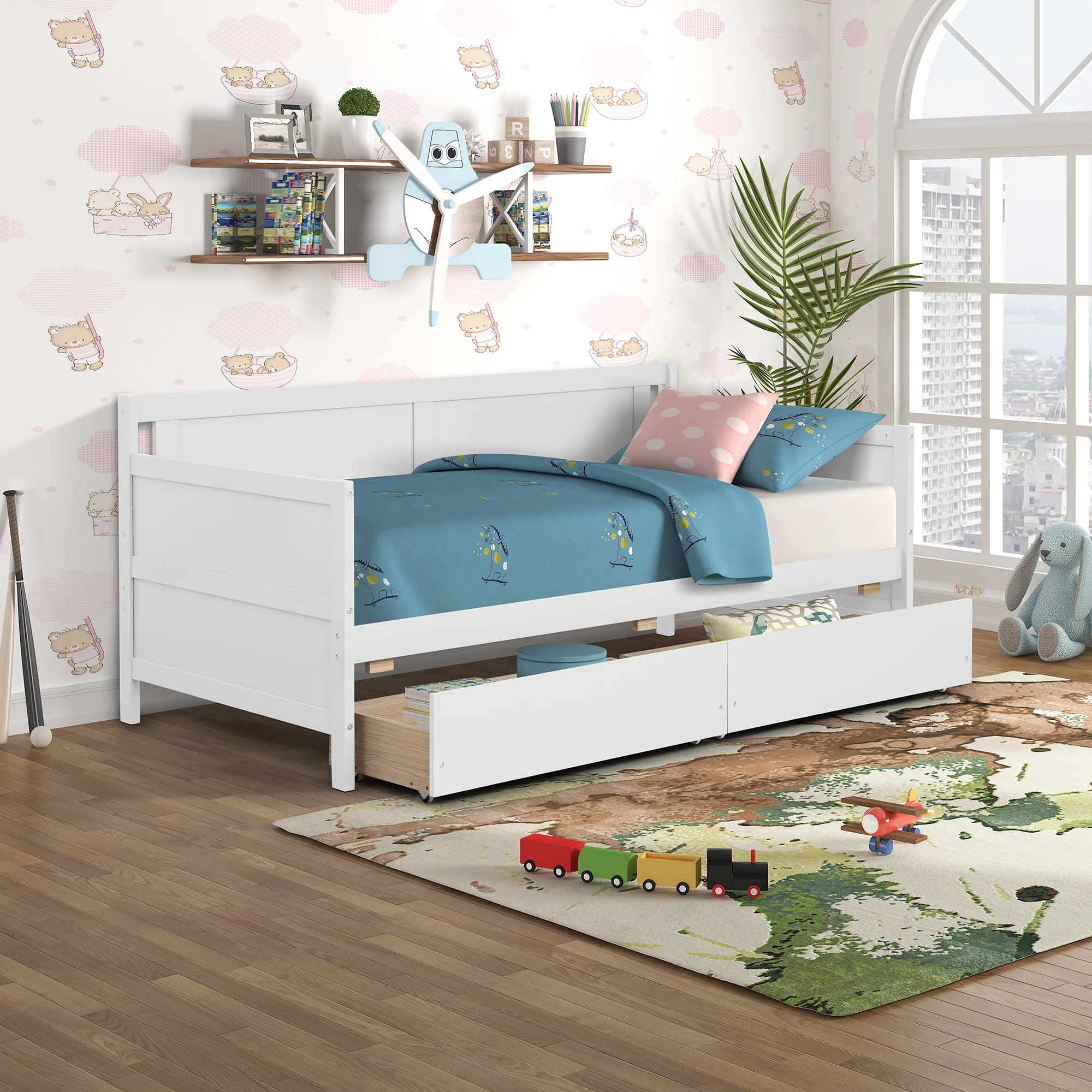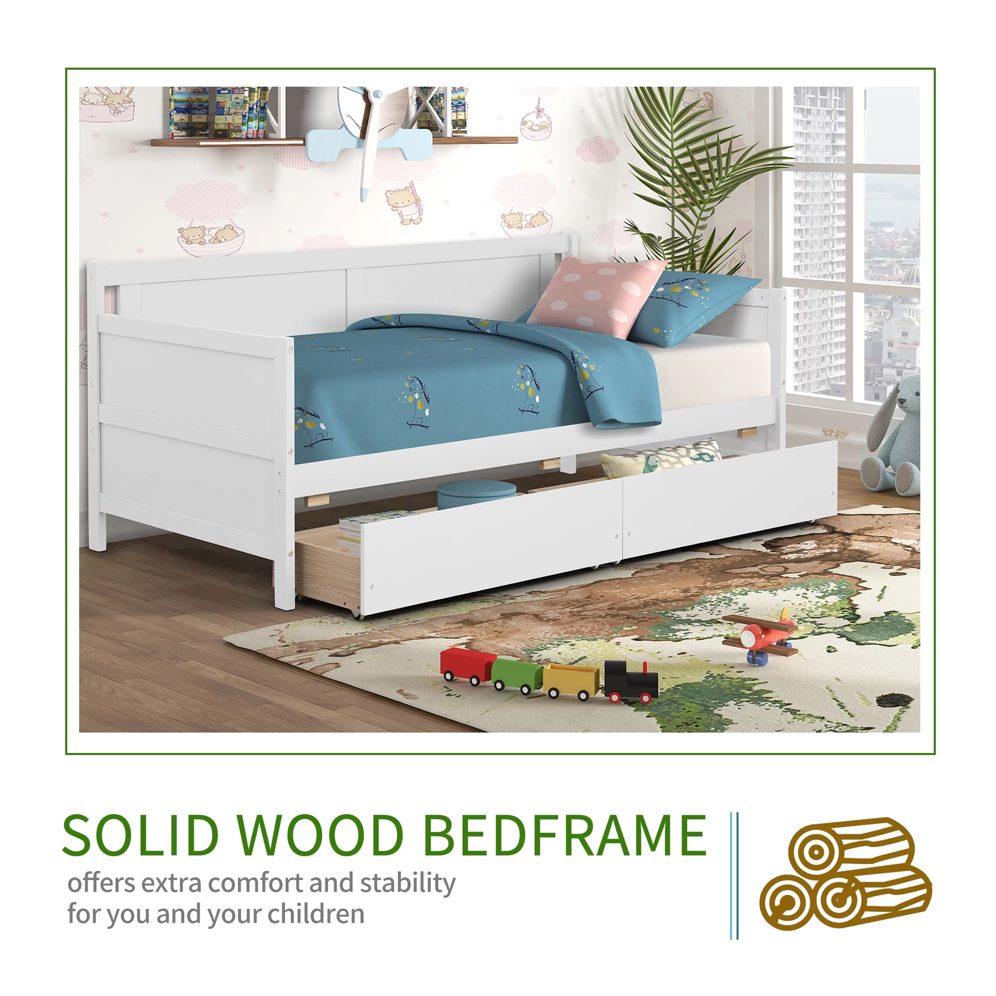 2 Pieces Wooden Captain Bedroom Set Full Bed with Trundle and Nightstand,White+Walnut