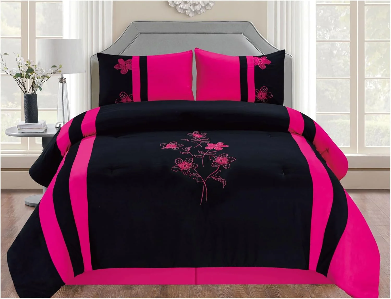 Fashion & Furtniture Embroidered Floral And Black Comforter Set - Complete Bedding Set With Sheet Set (Queen)