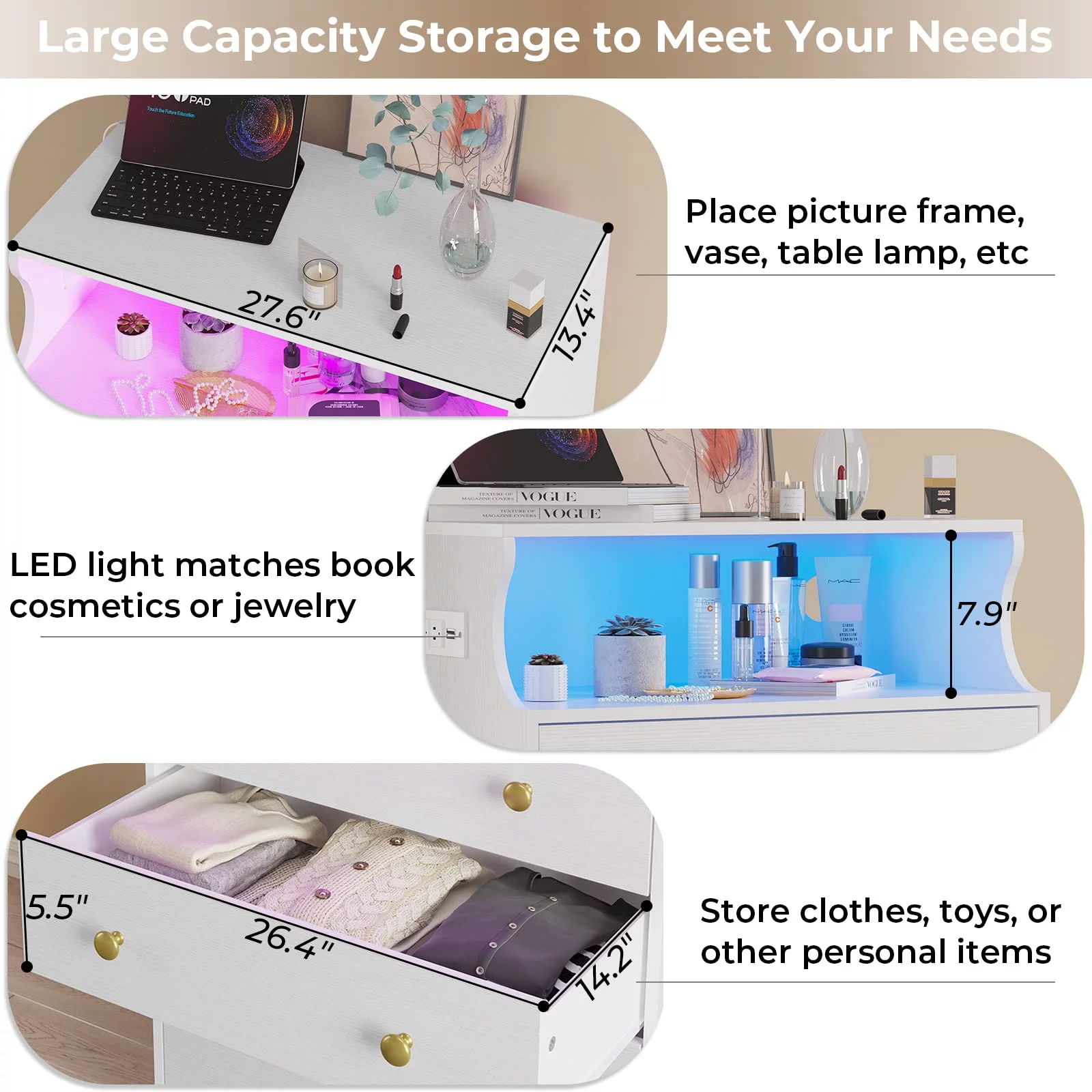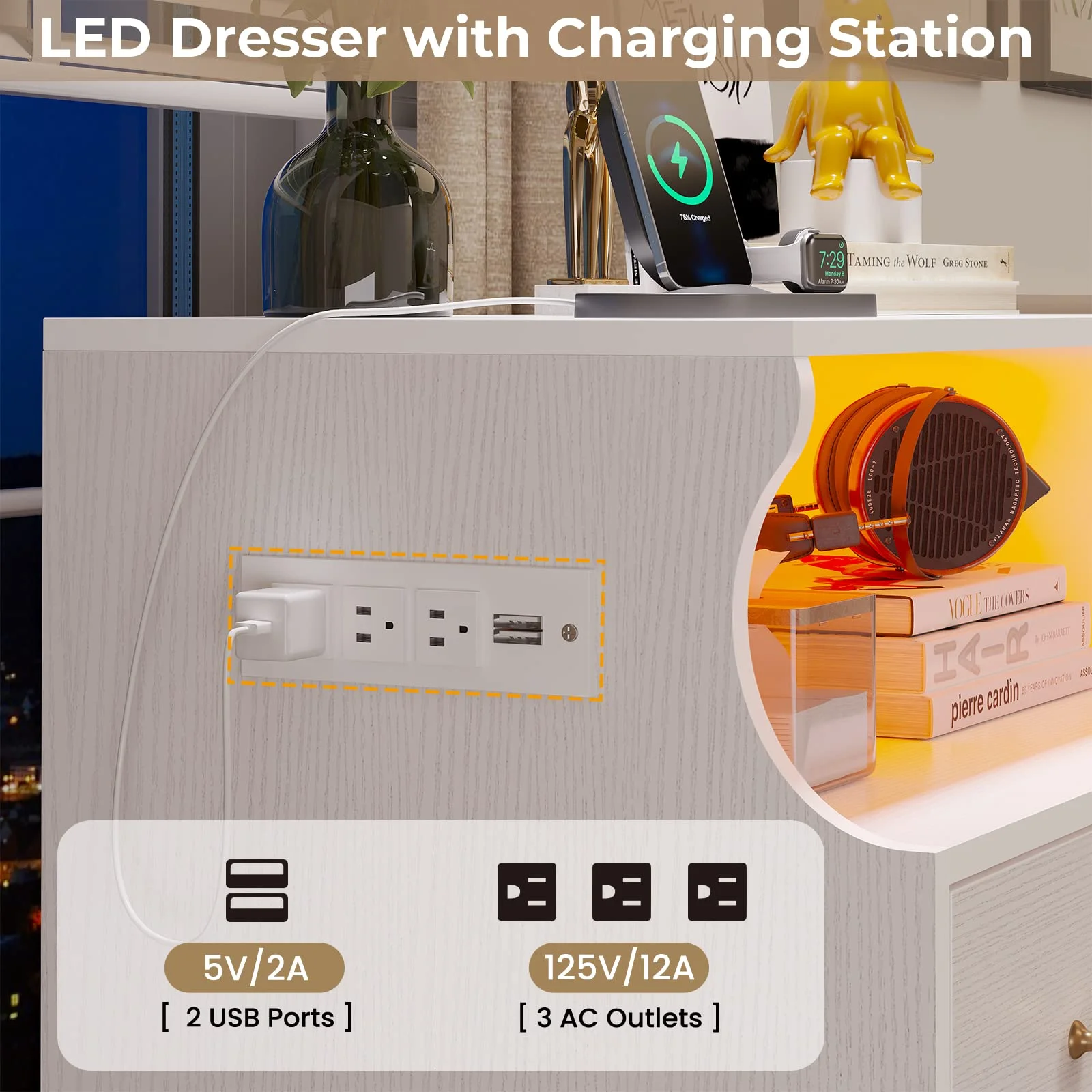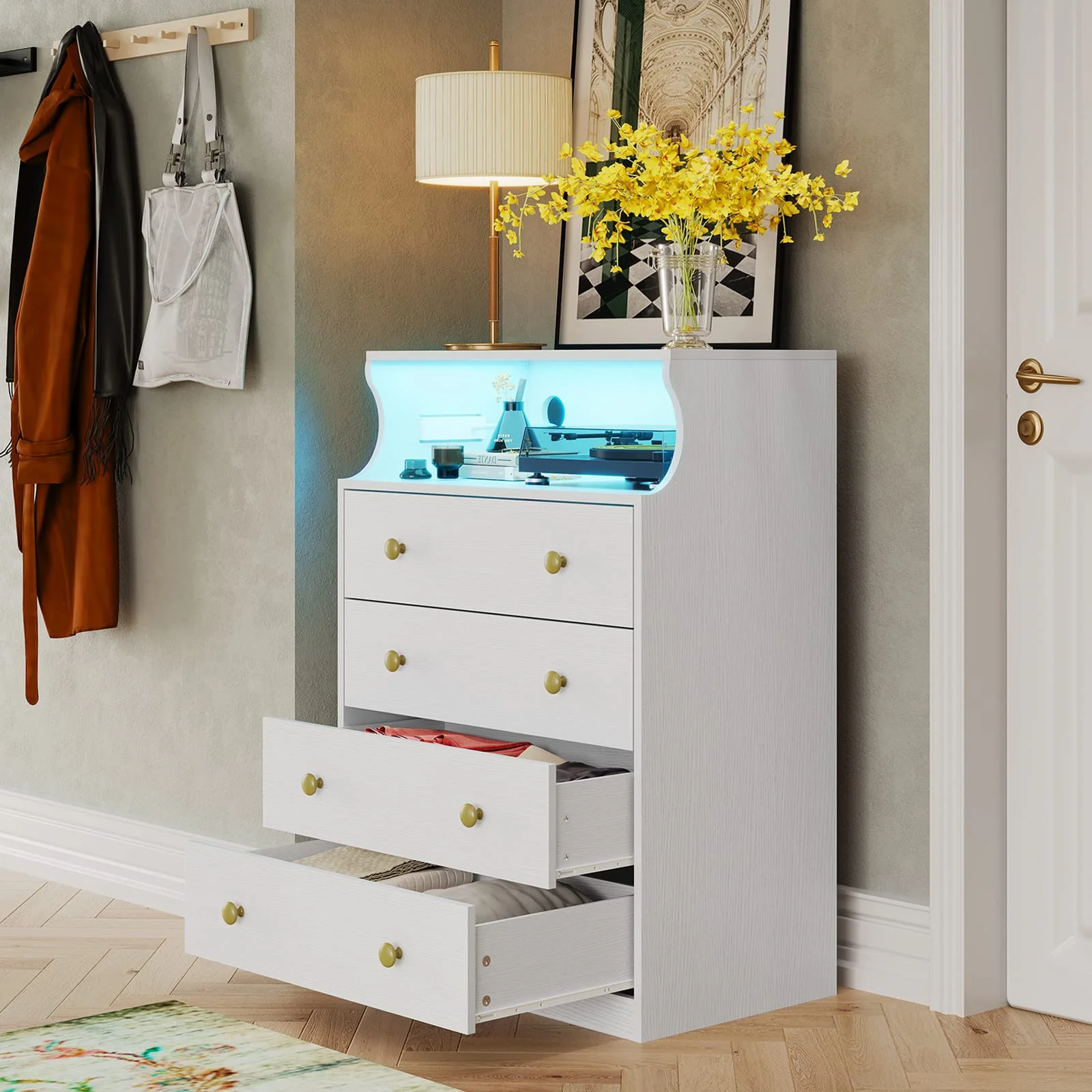 EPHEX White Led Dresser with Charging Station, 4 Drawers Dresser for Bedroom, Chest of Drawers with Open Space