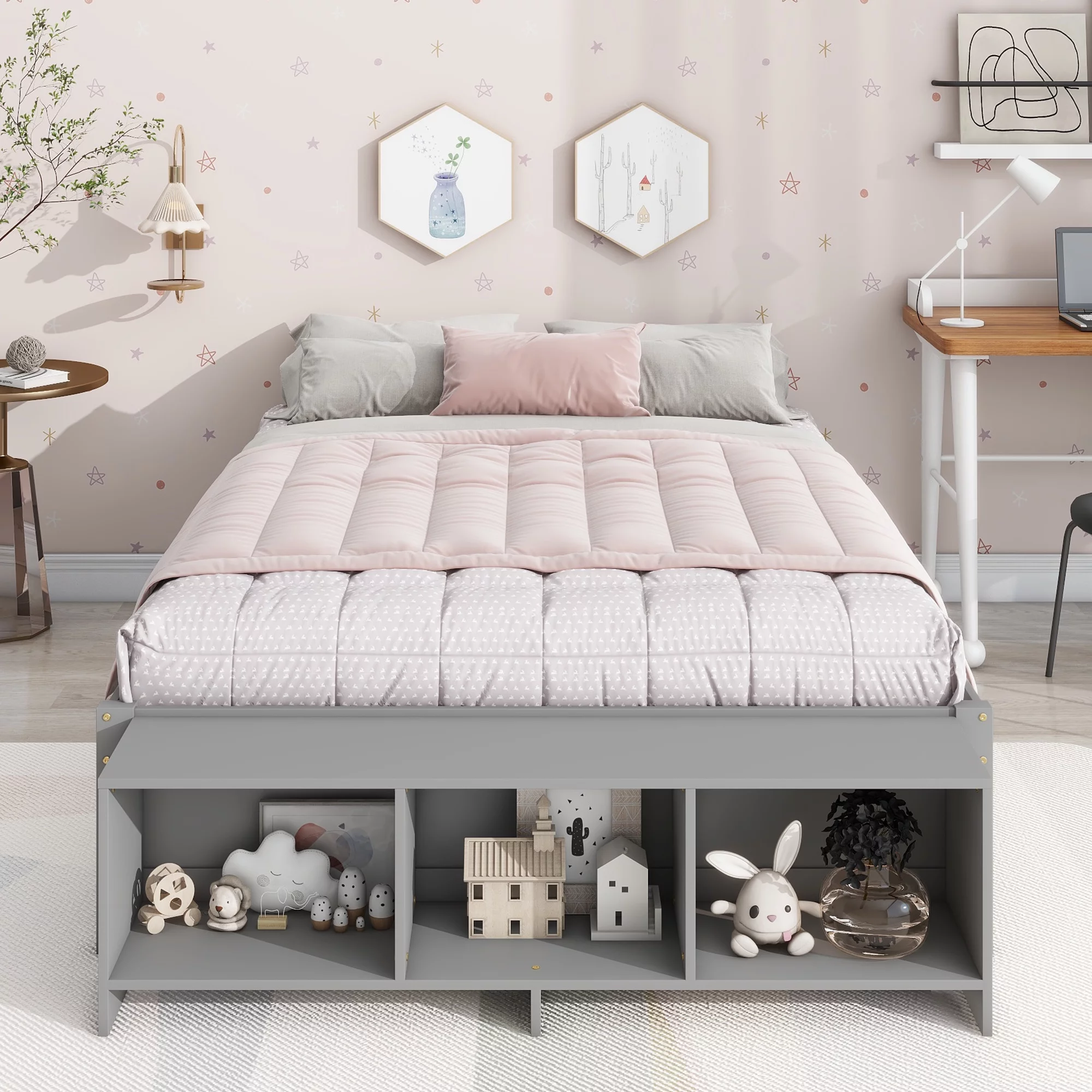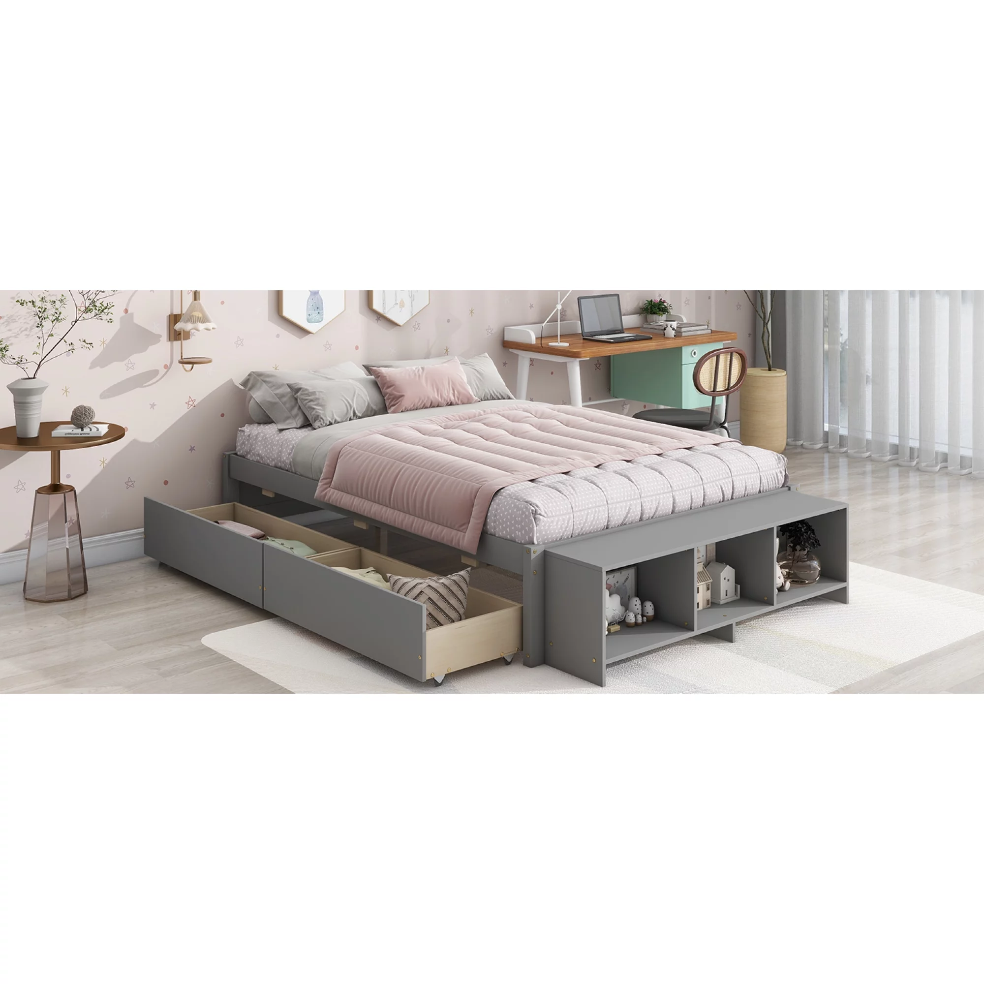 Full Size Bed with Storage Case, 2 Storage drawers, Lengthwise Support Slat,Grey