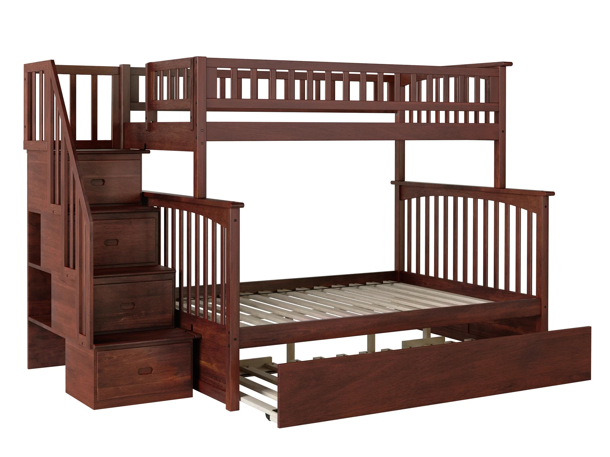 Columbia Staircase Bunk Bed Twin over Full with Full Size Urban Trundle Bed in Walnut