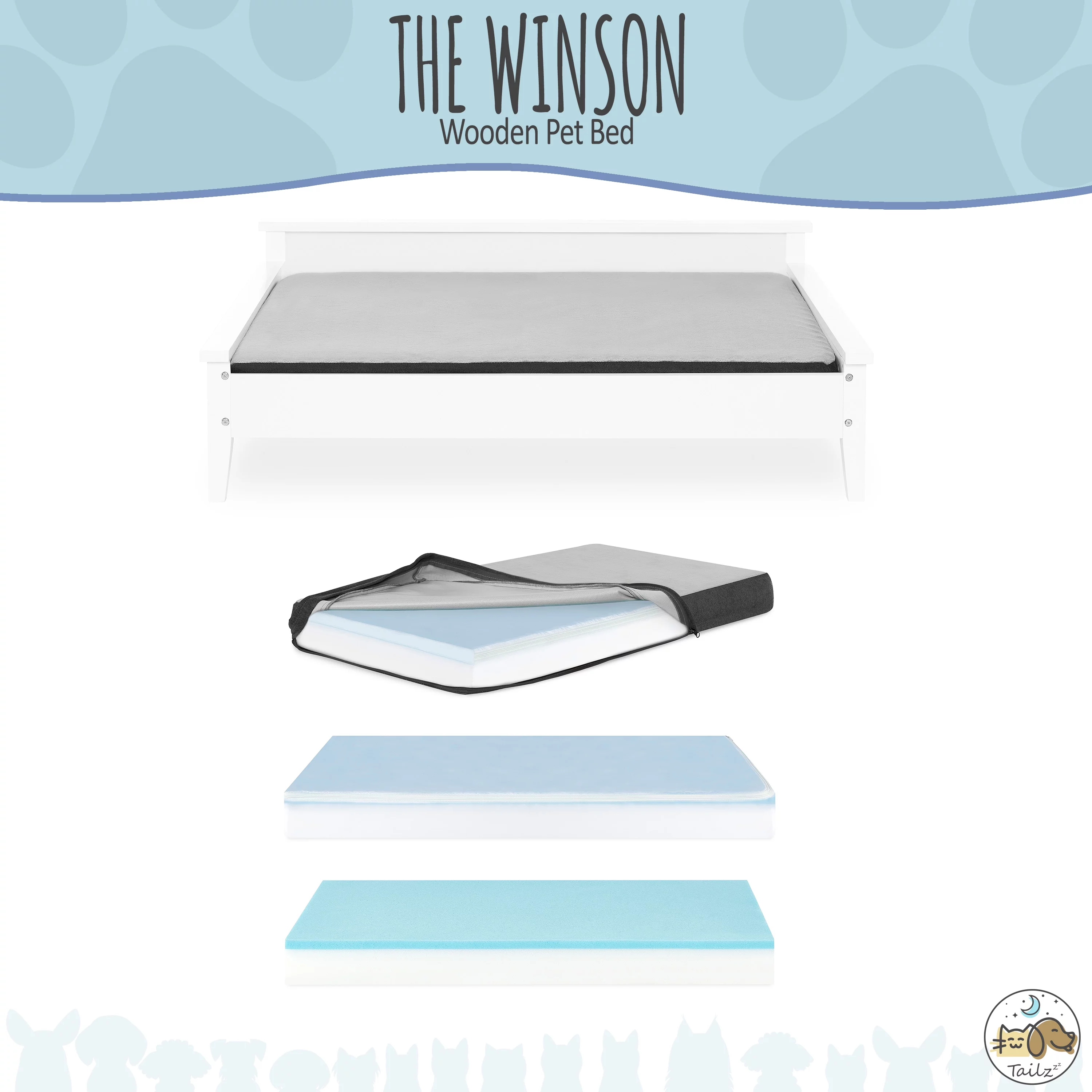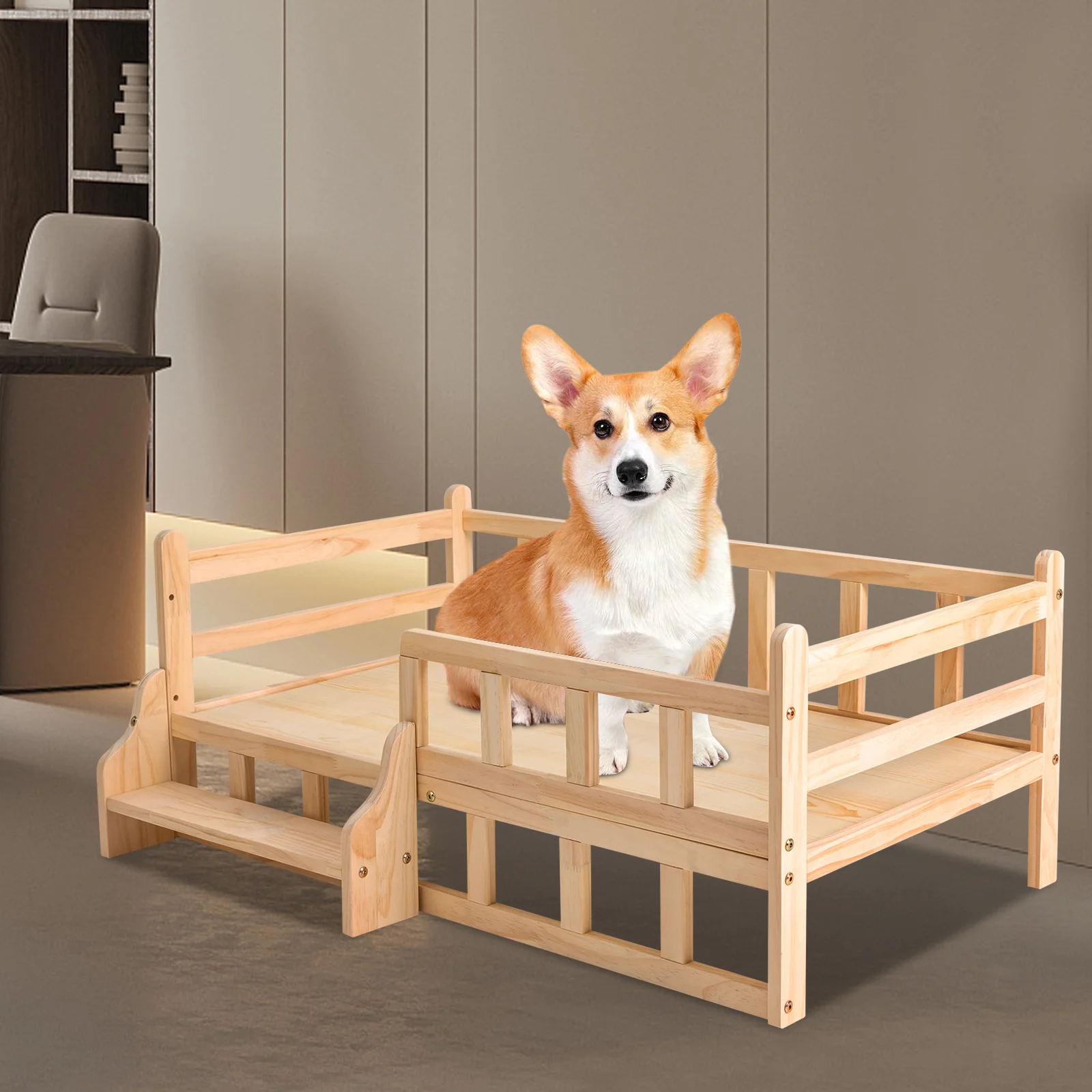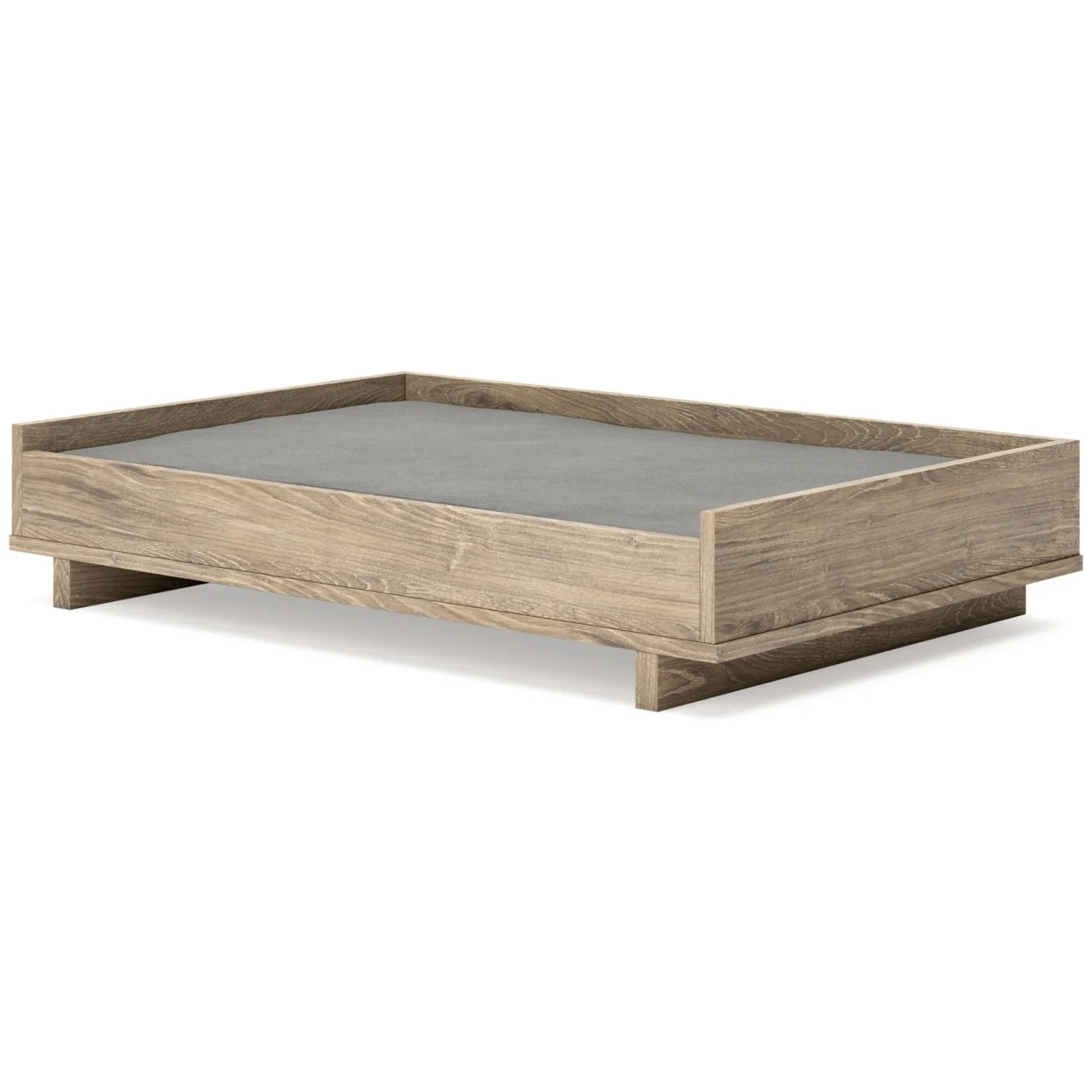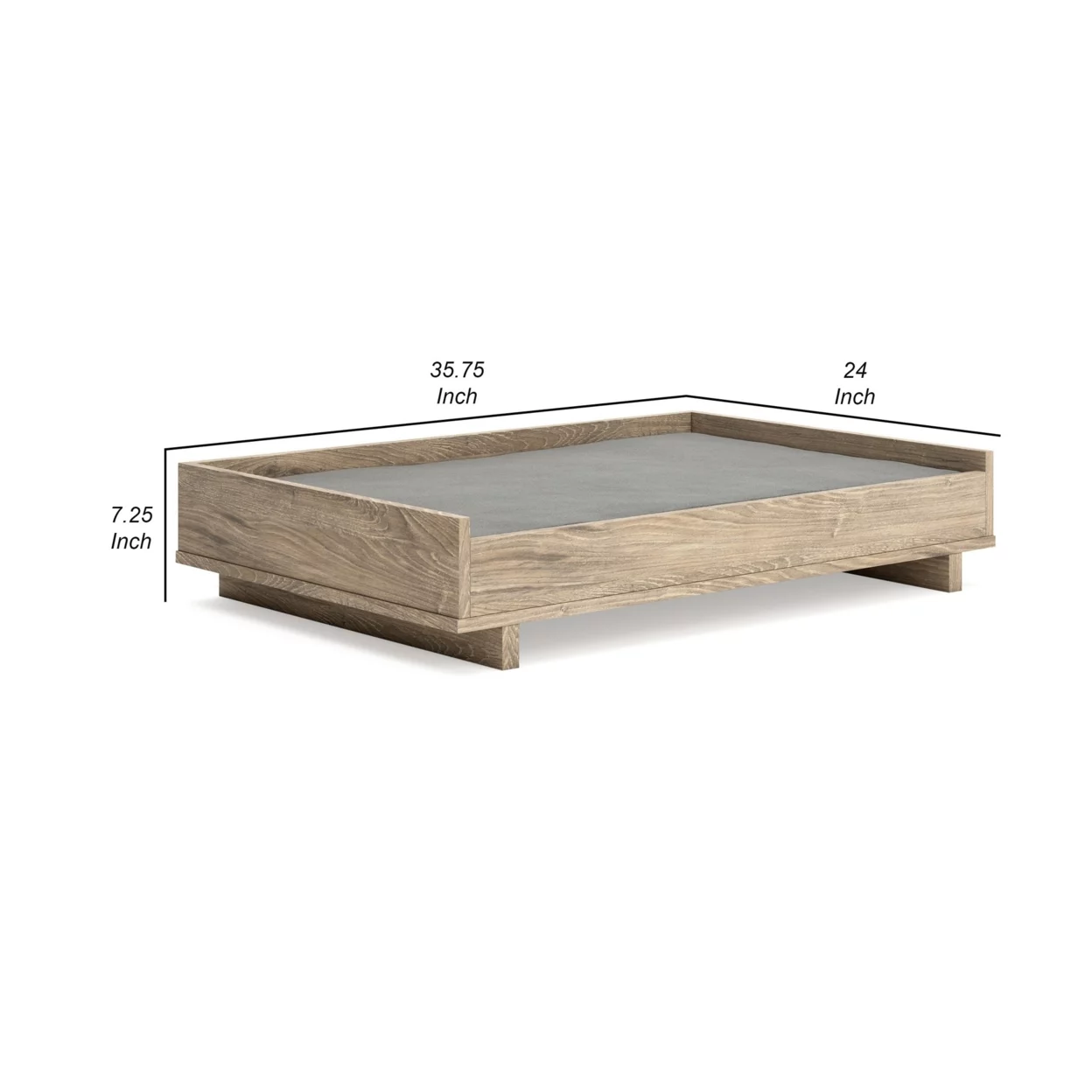 36 Inch Pet Bed Frame Natural Brown Wood Removable Cover Gray Upholstery
