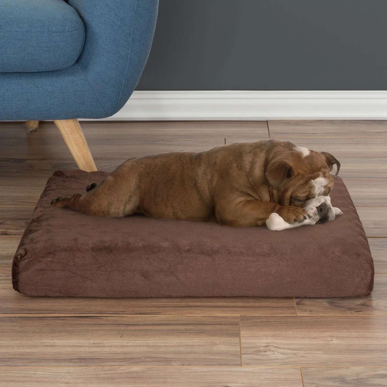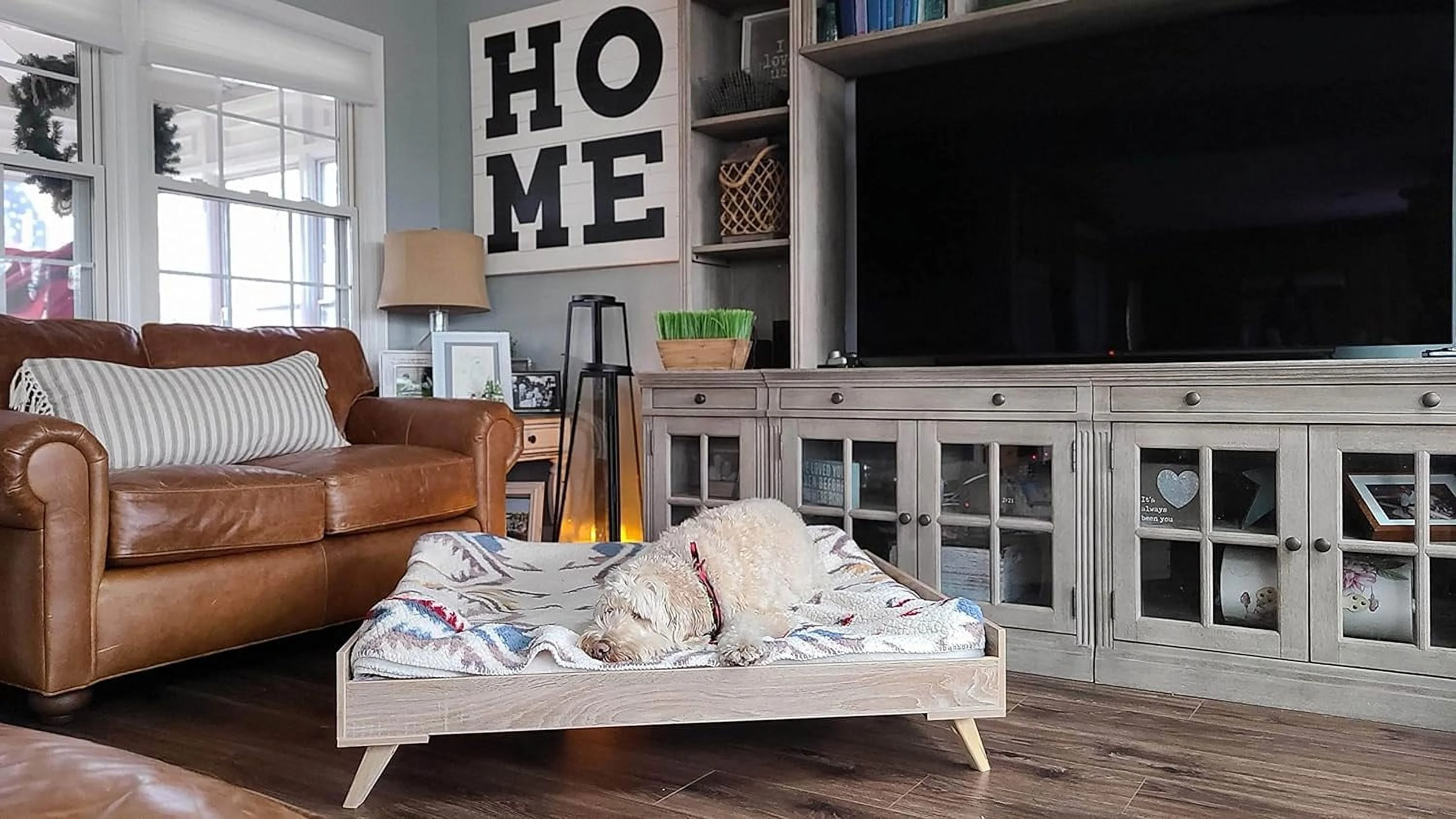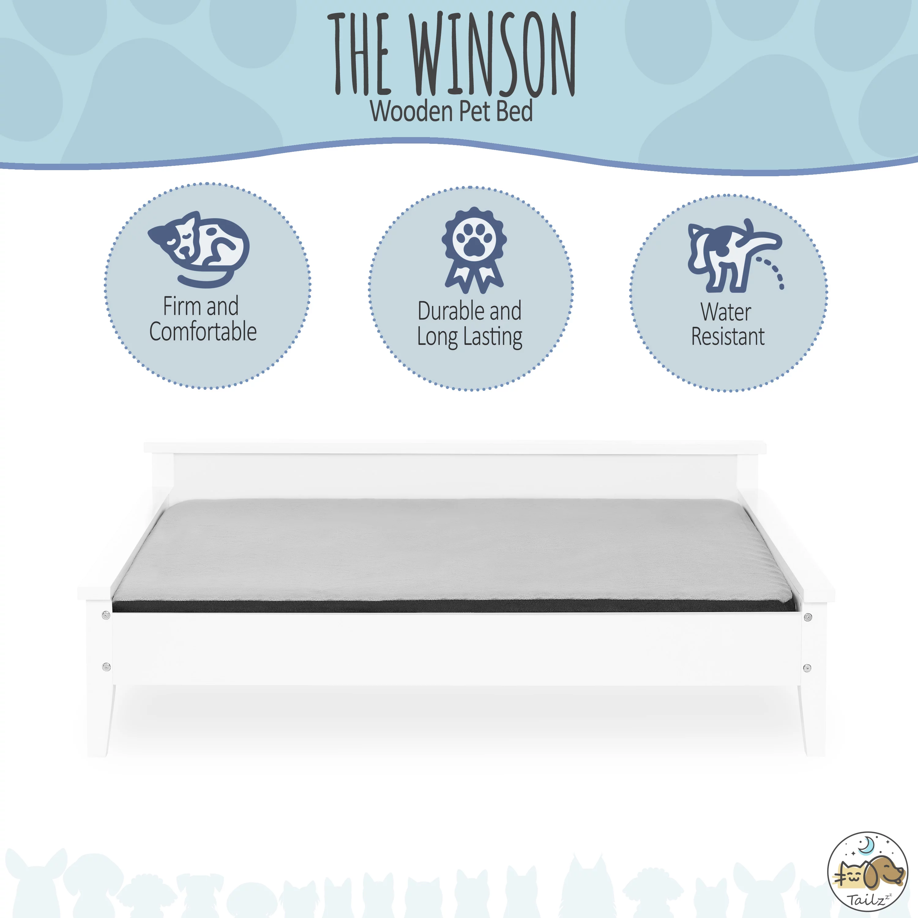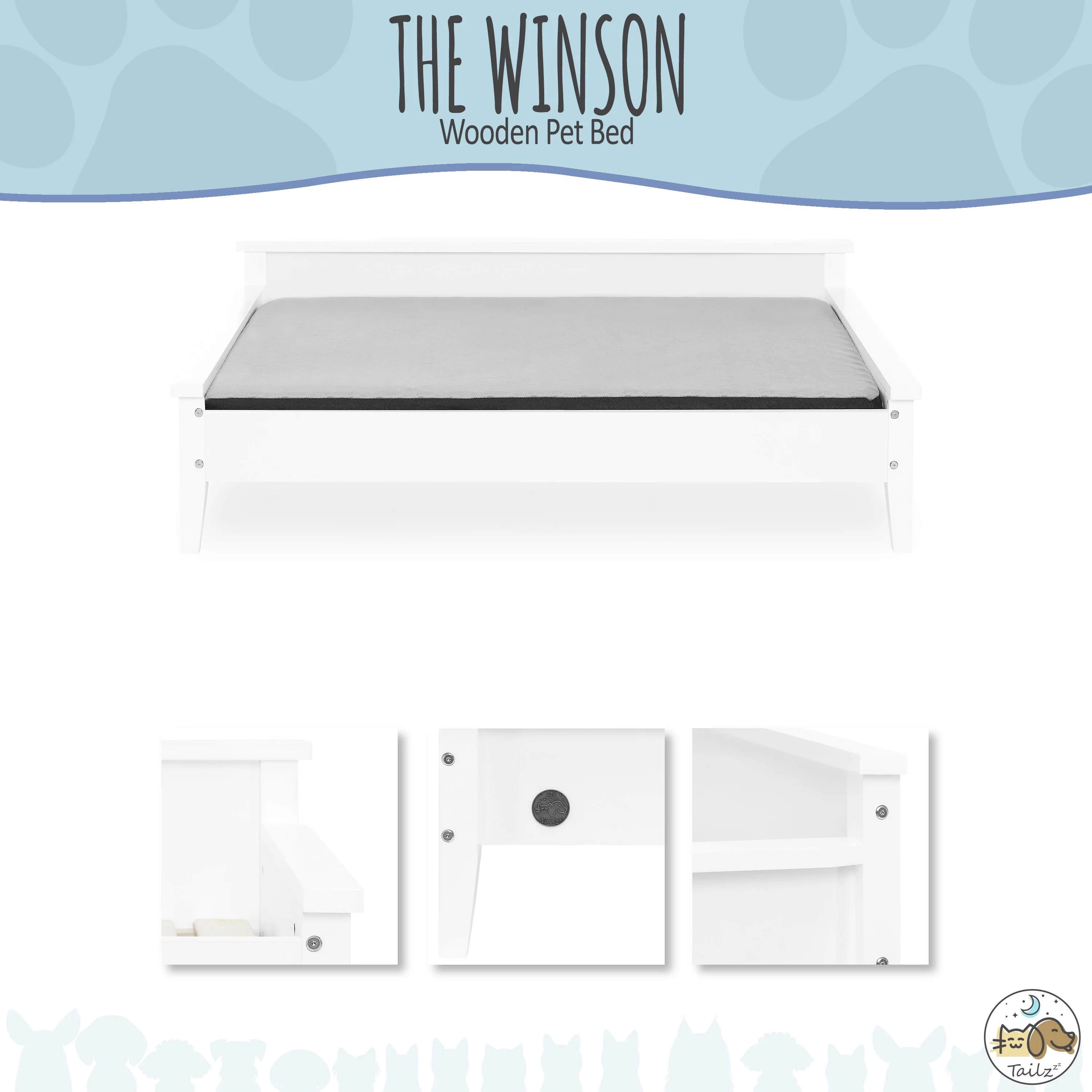 36 Inch Pet Bed Frame Natural Brown Wood Removable Cover Gray Upholstery