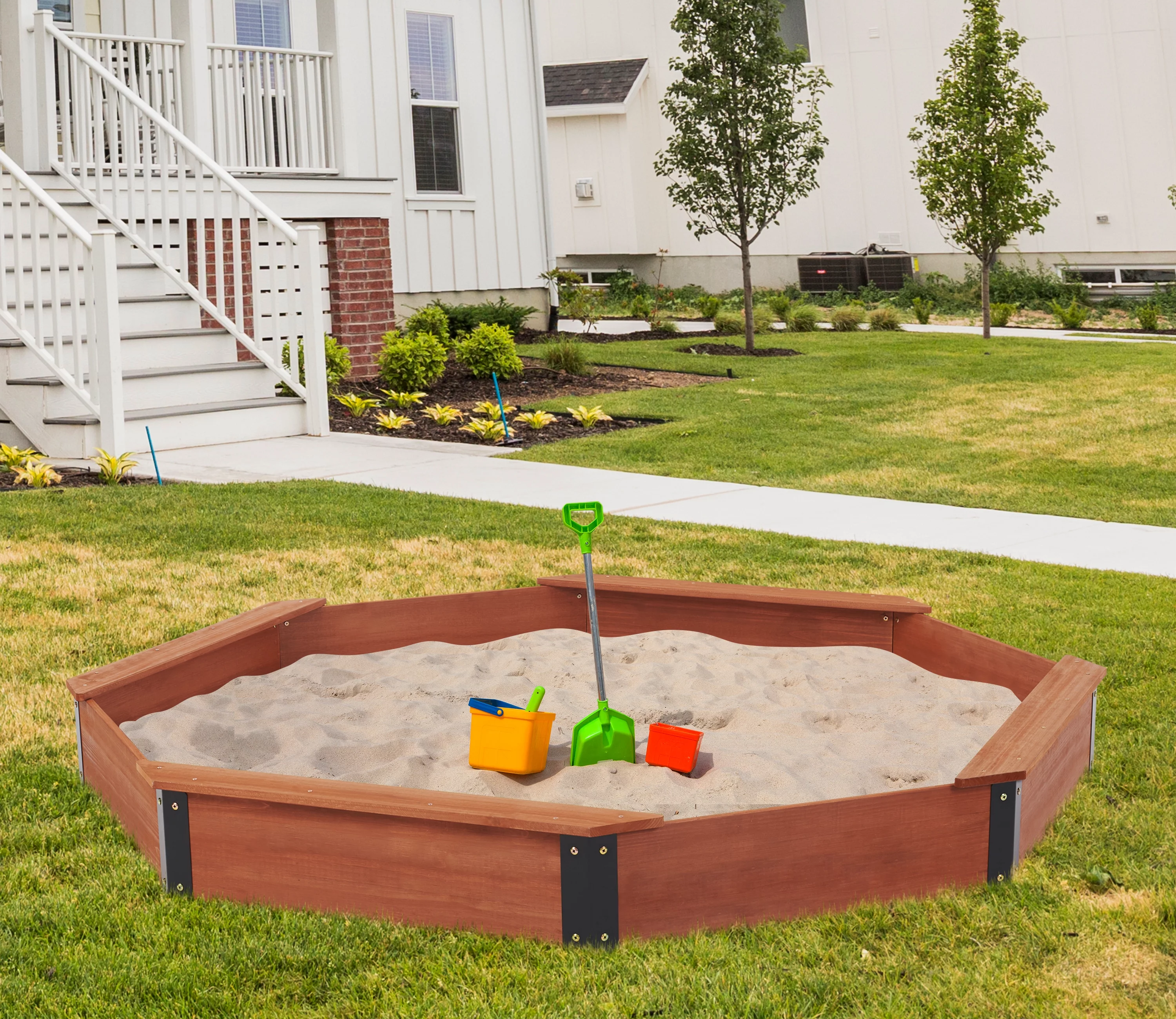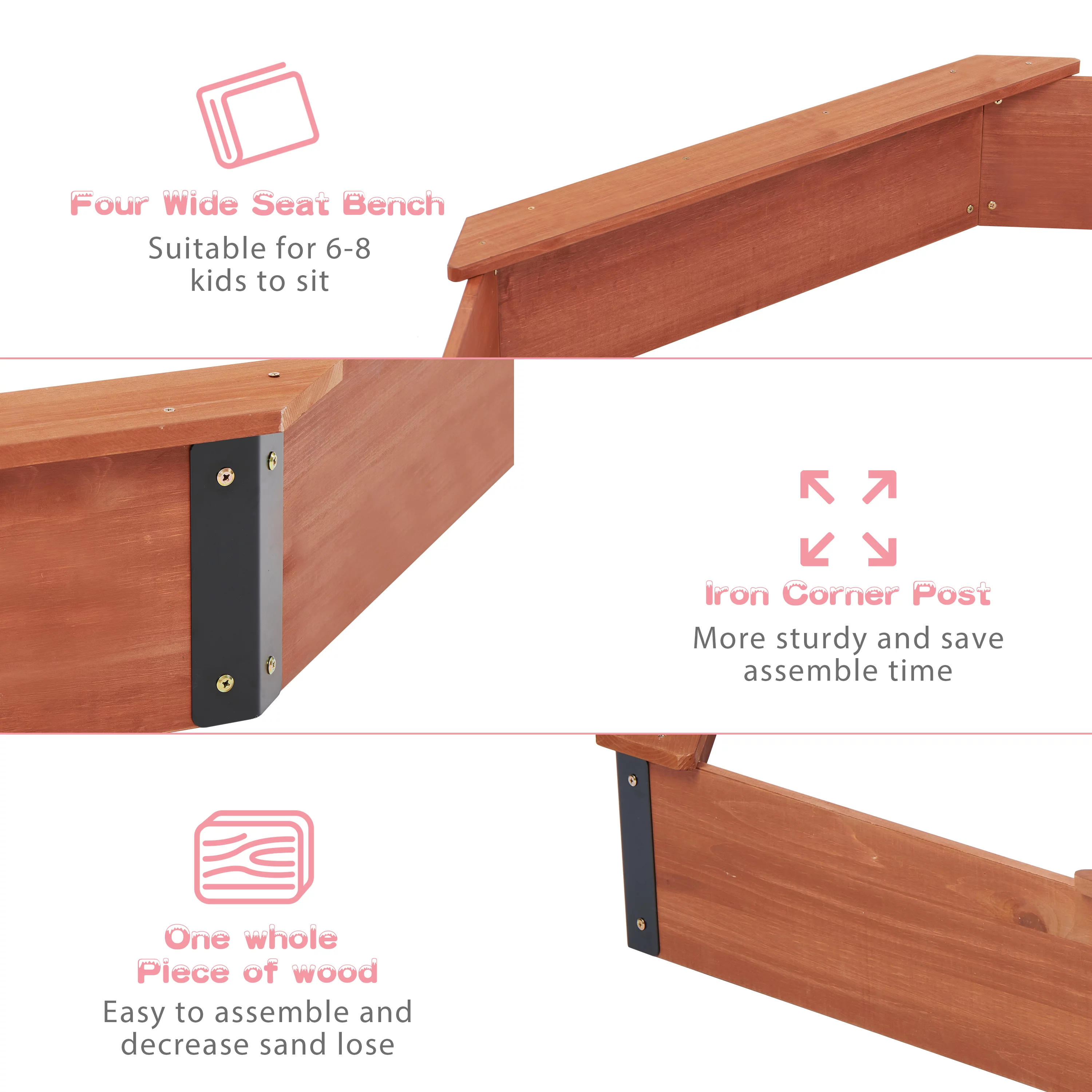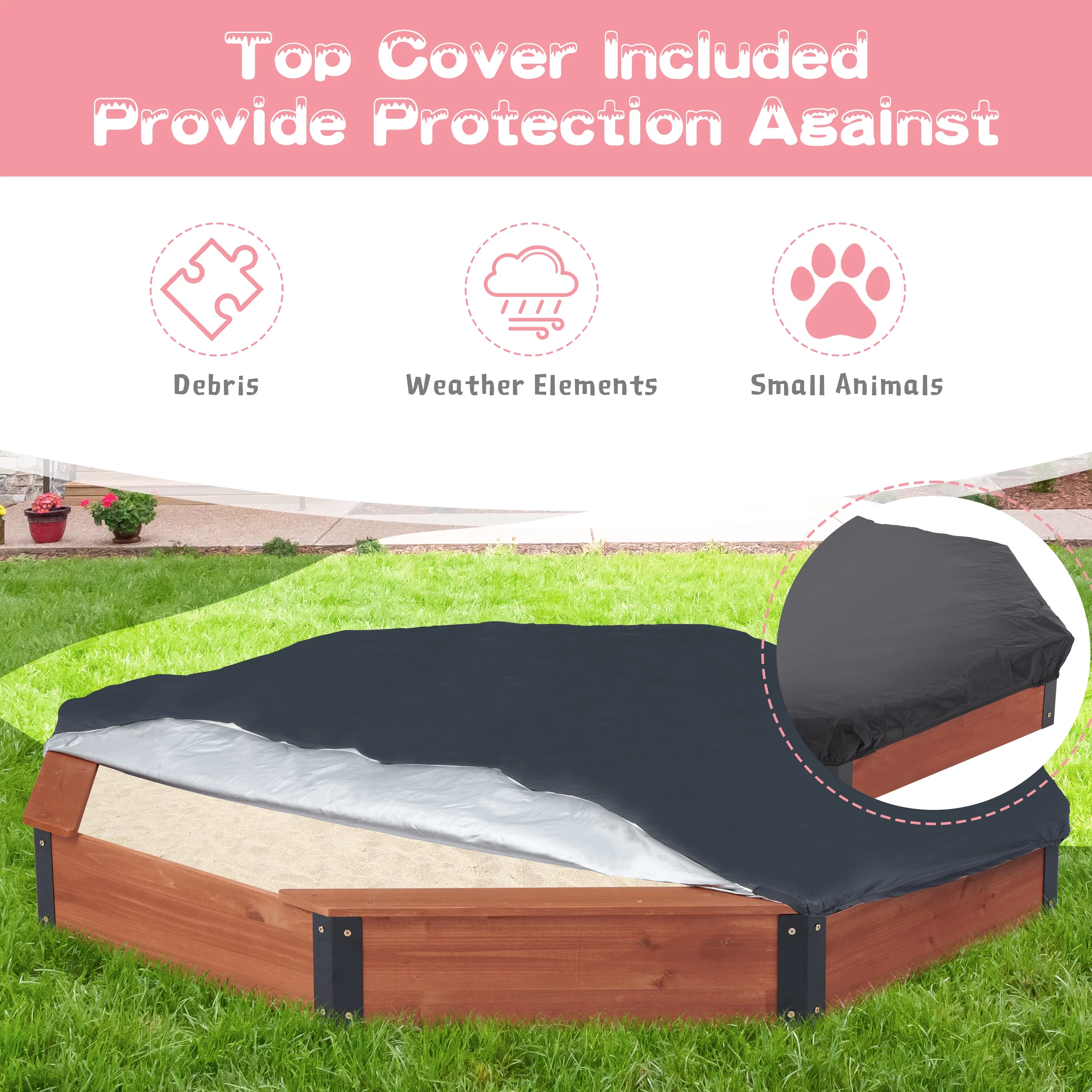 D-road Outdoor Wooden Kids Octagon Sandbox W/ Cover, Bottomless W/ Liner for Backyard Garden Play, Brown
