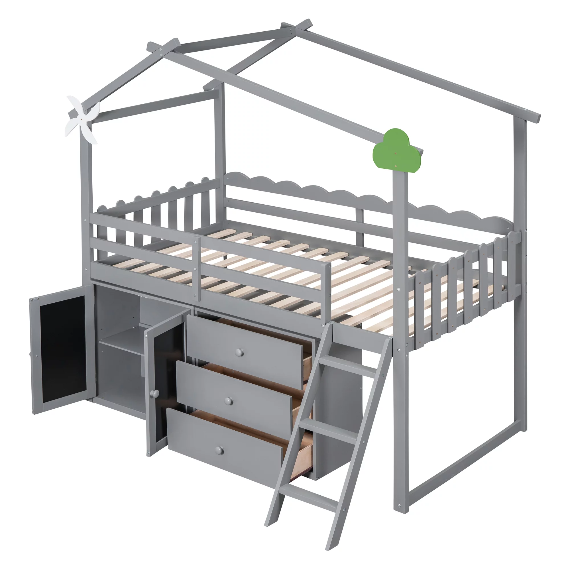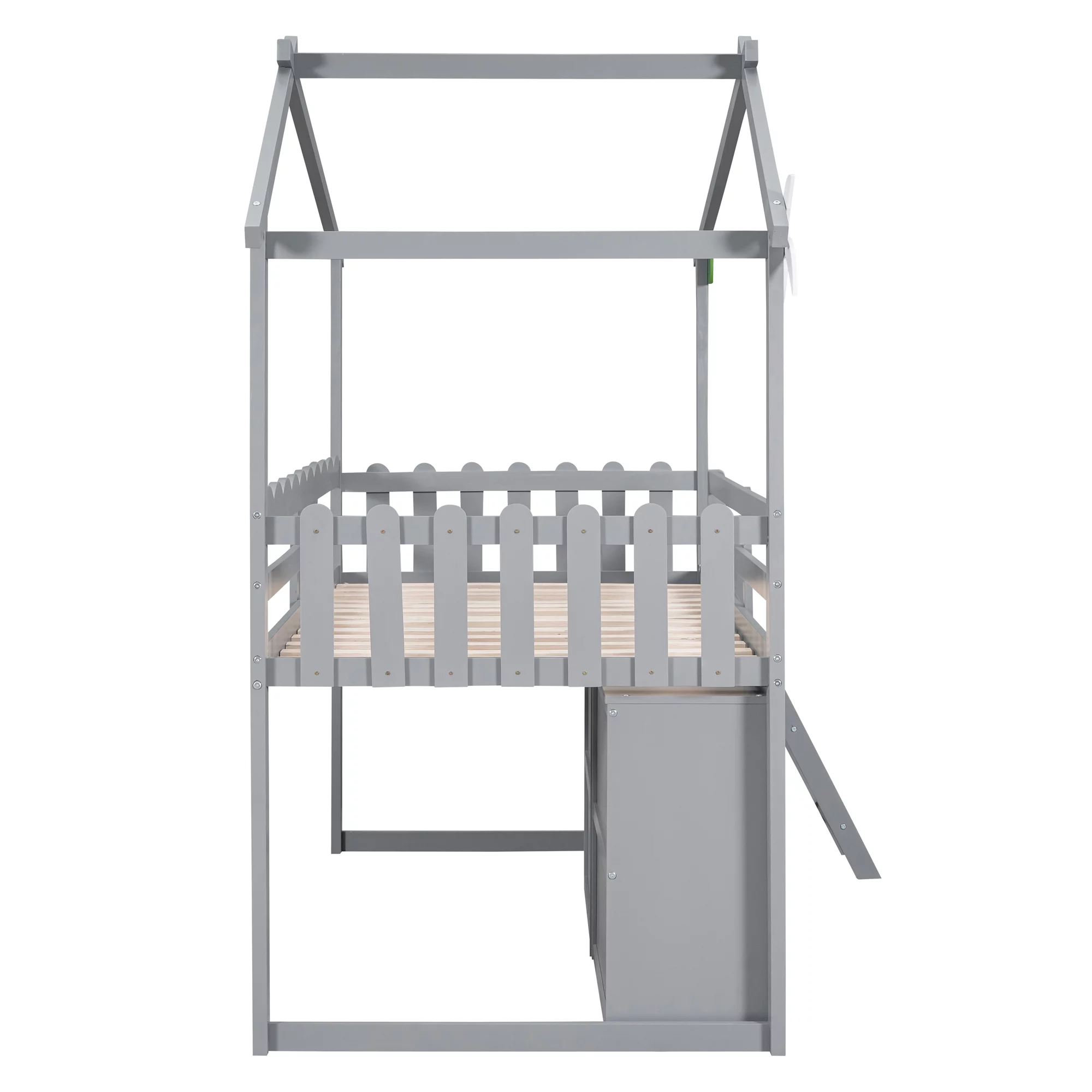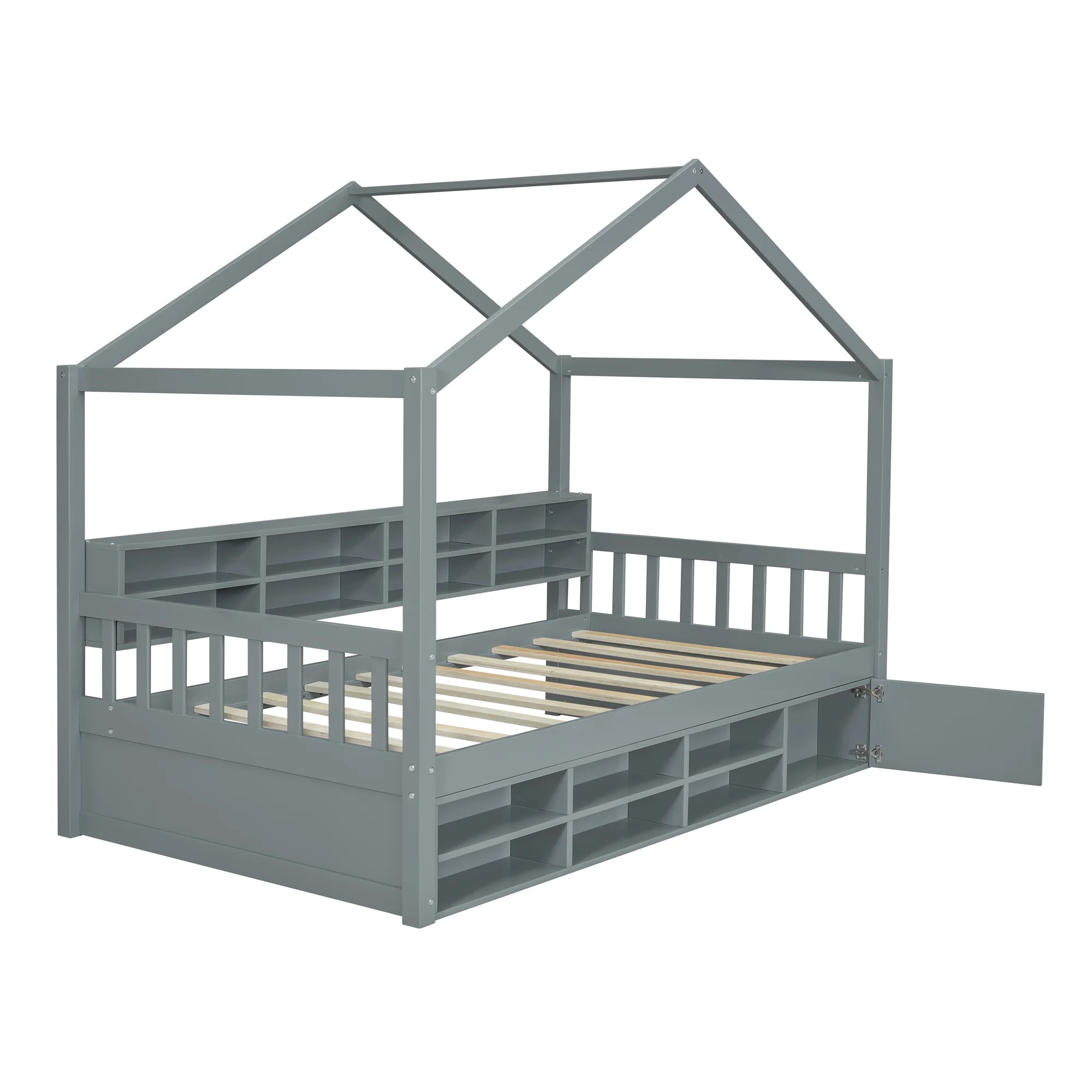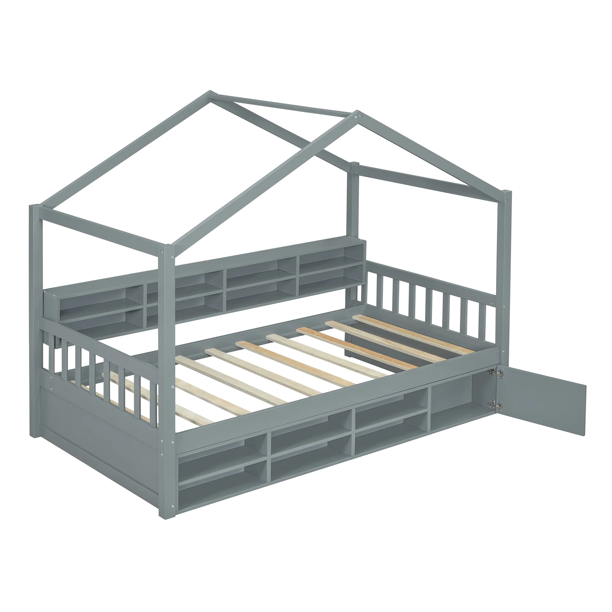 CoSoTower Twin Size Wooden House Bed with Shelves and A Mini-Cabinet, Gray