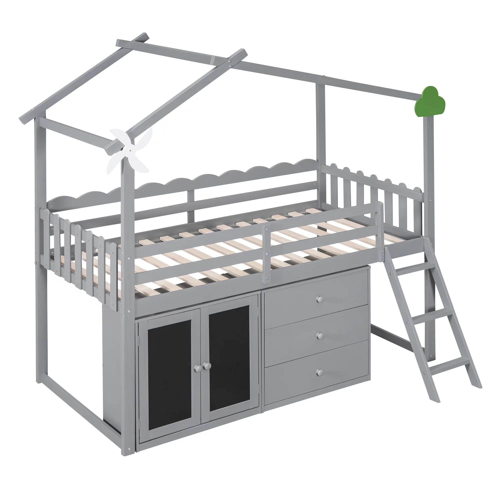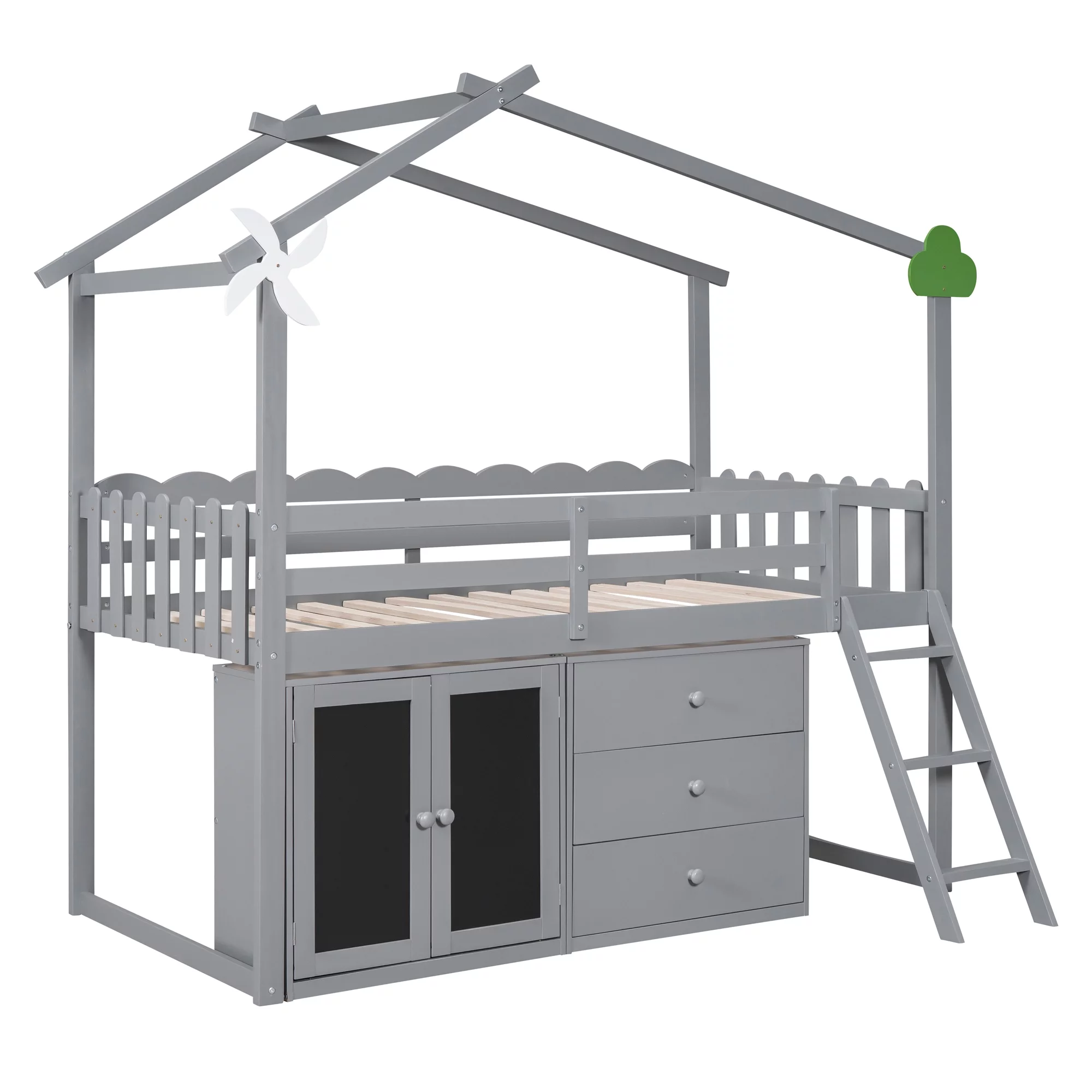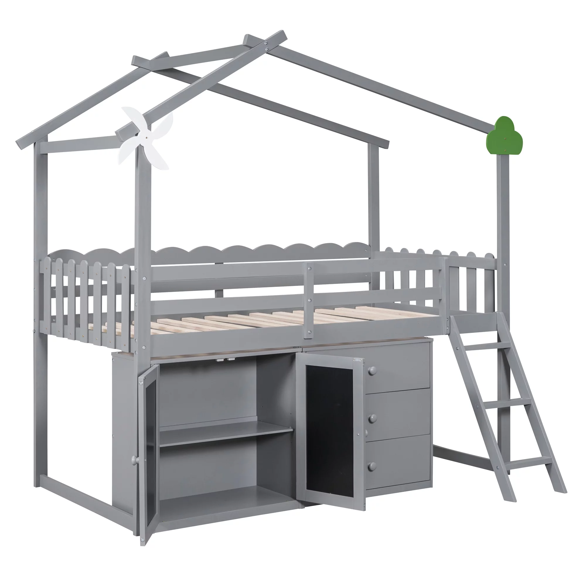CoSoTower Twin Size Wooden House Bed with Shelves and A Mini-Cabinet, Gray