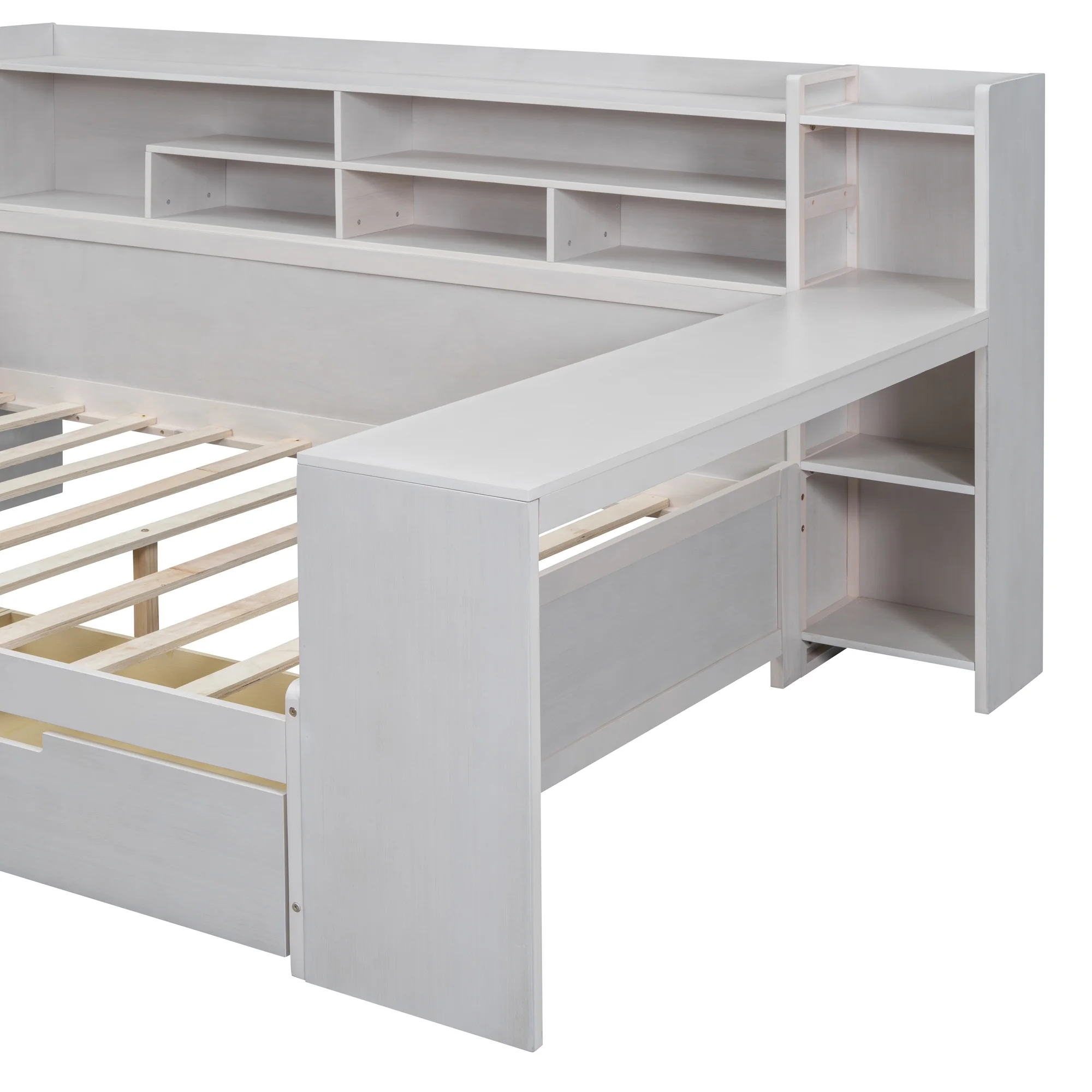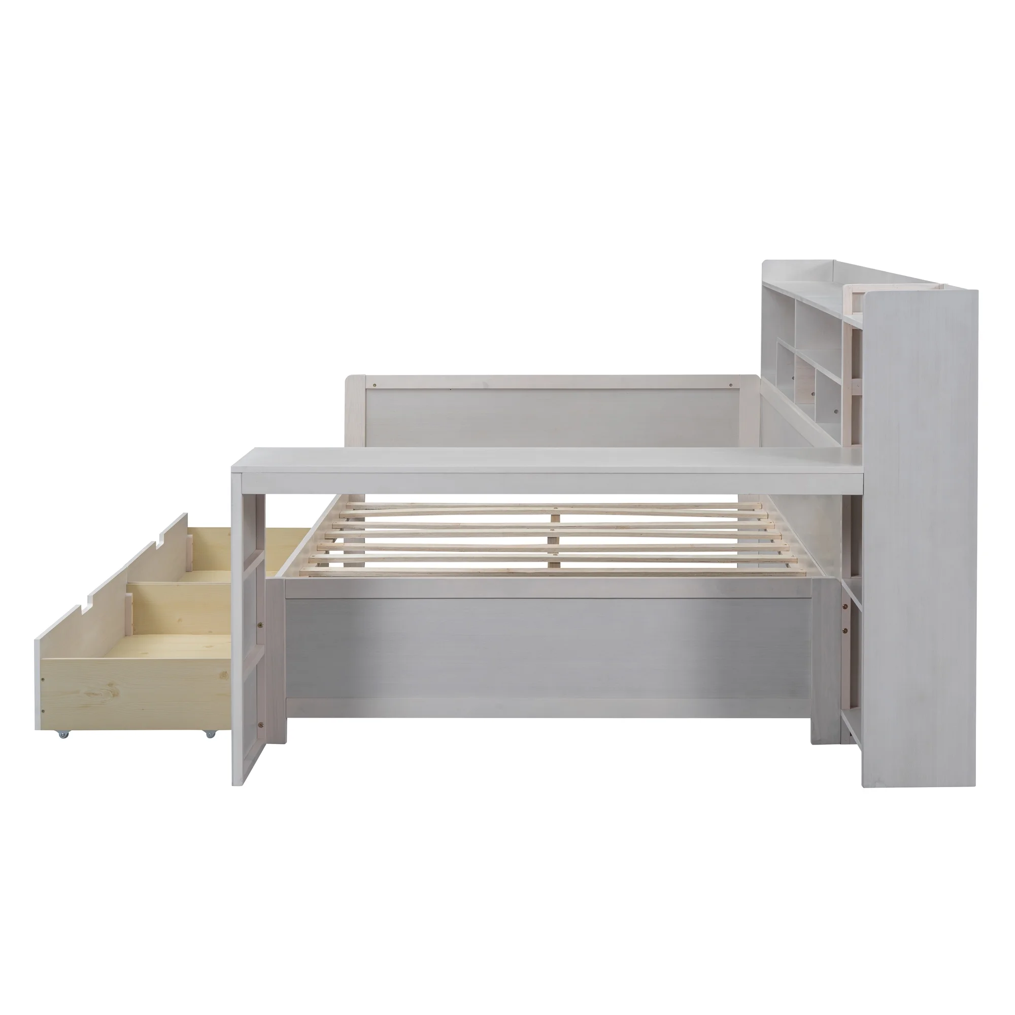 Wooden Full Size Daybed with Storage Shelves, Multi-functional Bed with Two Storage Drawers and Study Desk, Antique White