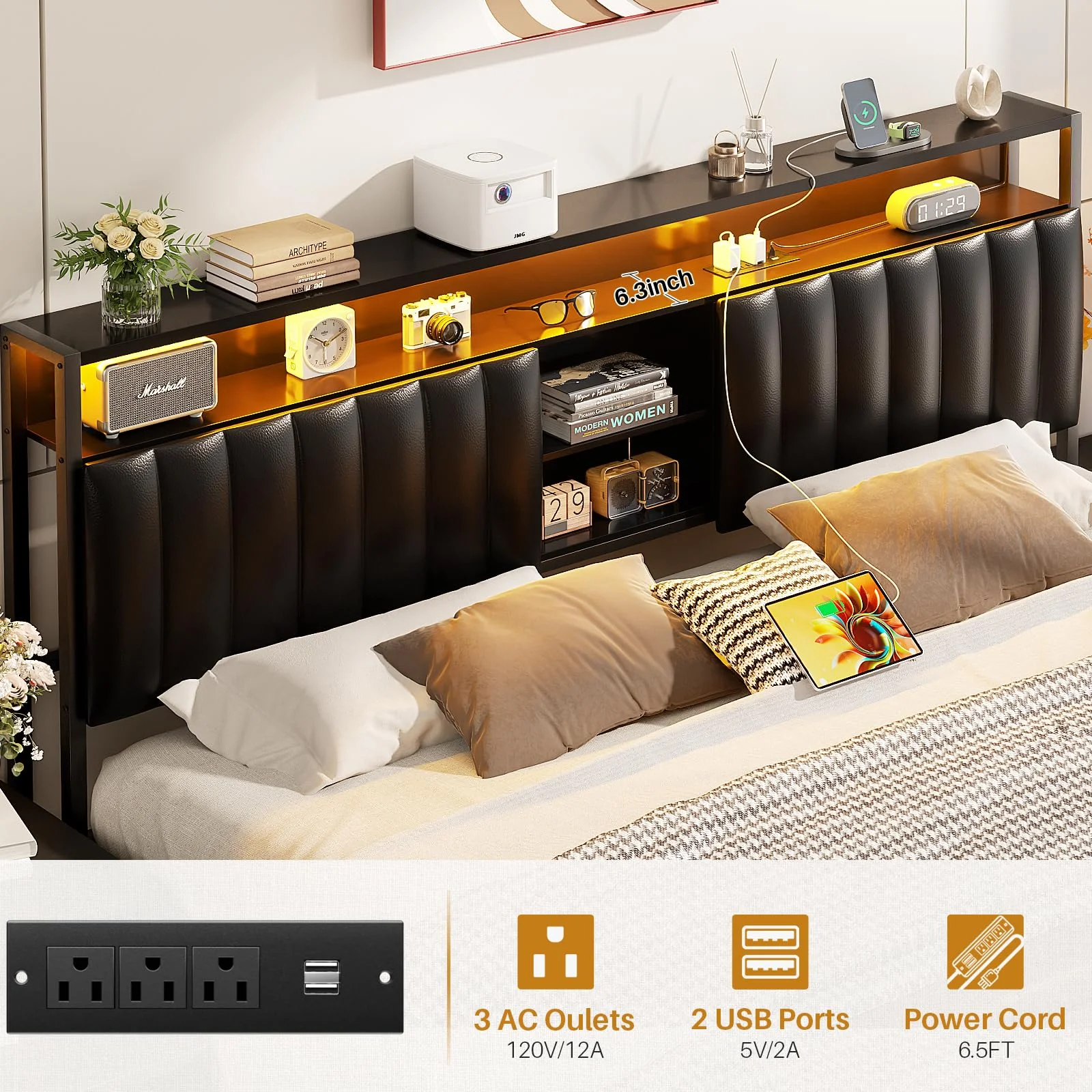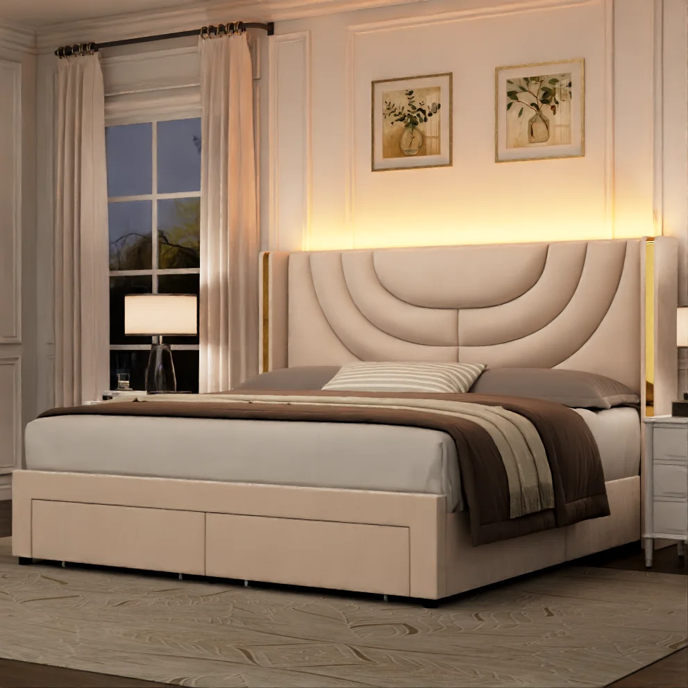 Homfa King Size Platform Bed Frame with Led Headboard, Velvet Upholstered Bed Frame with 2 Drawers, Off-White