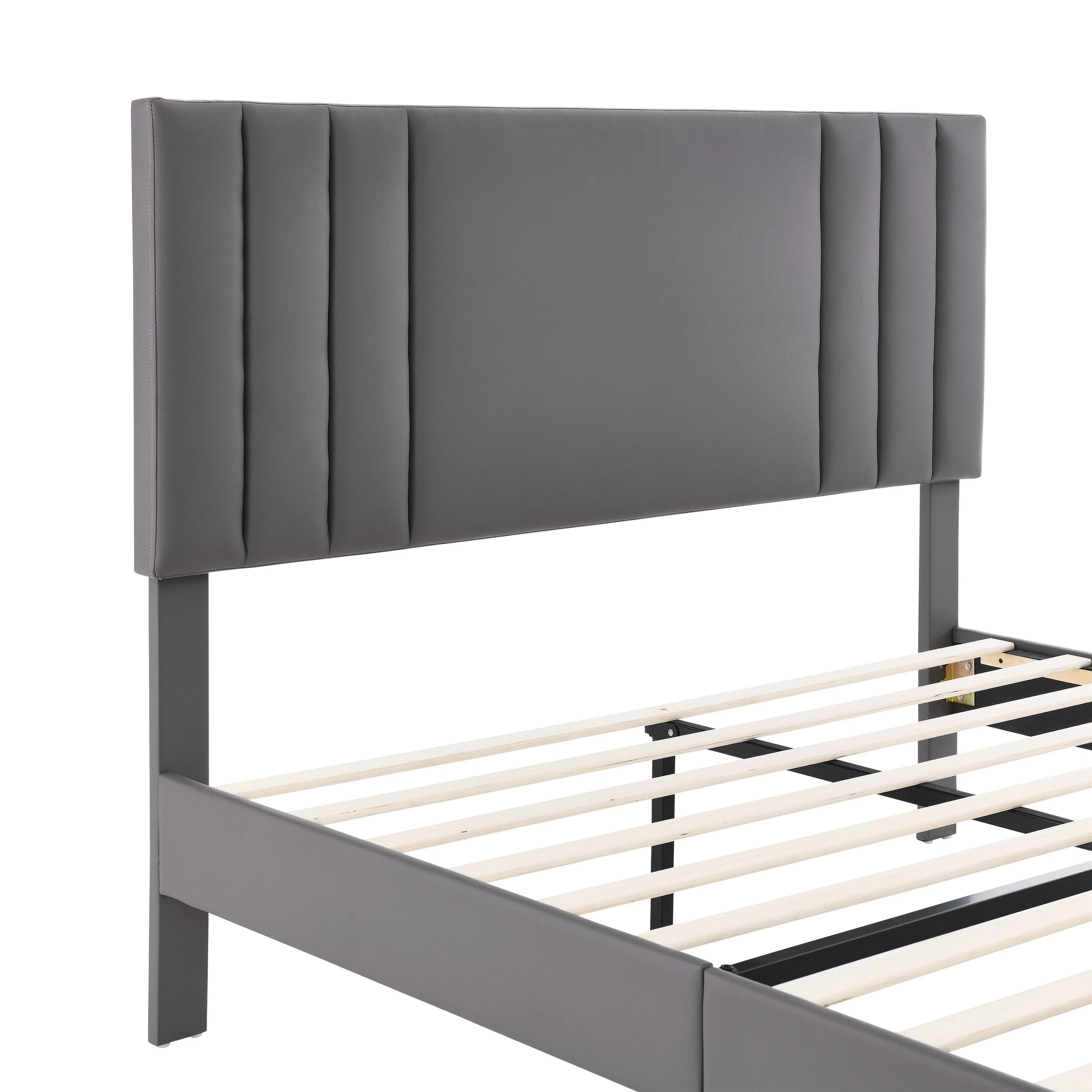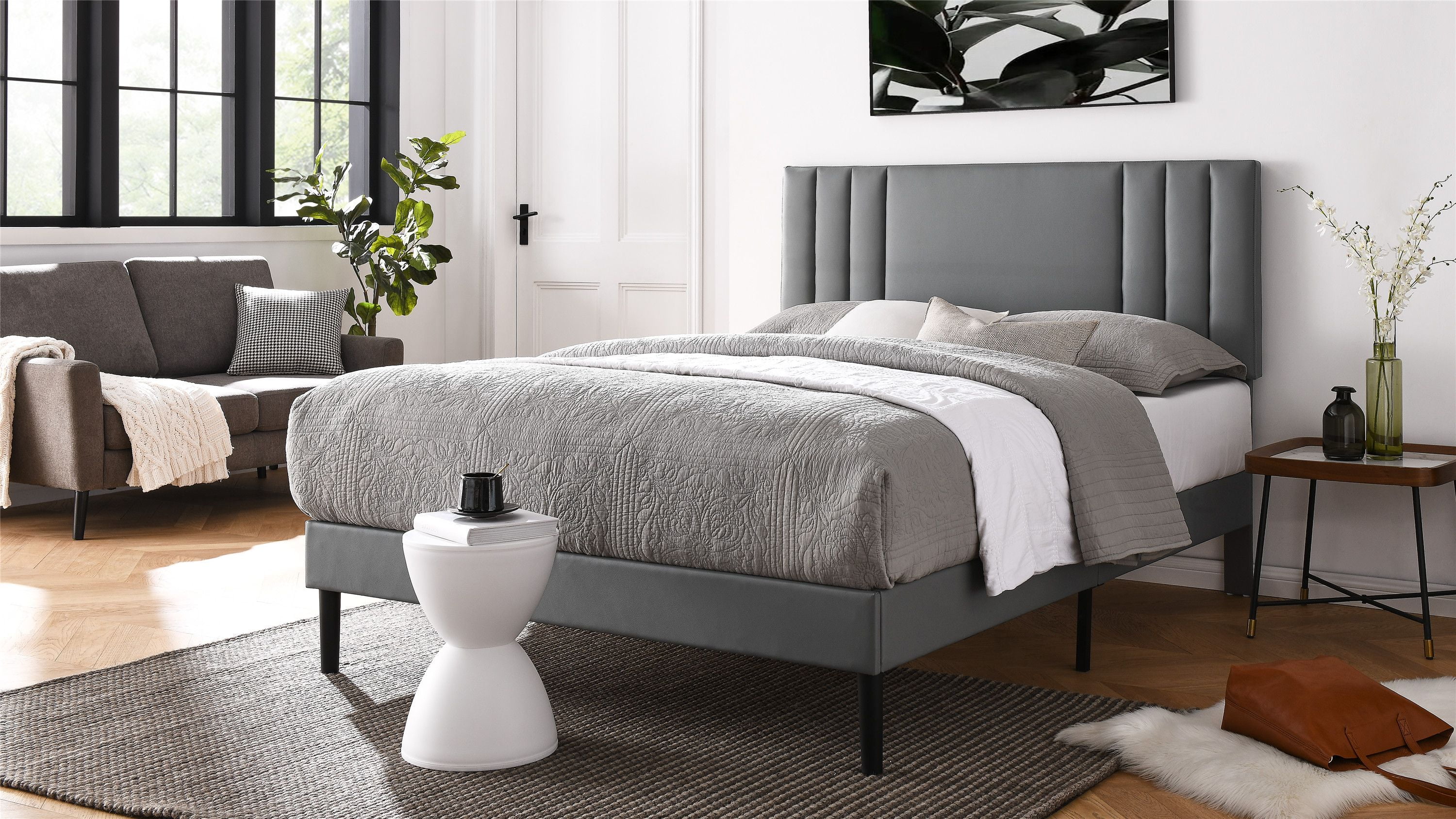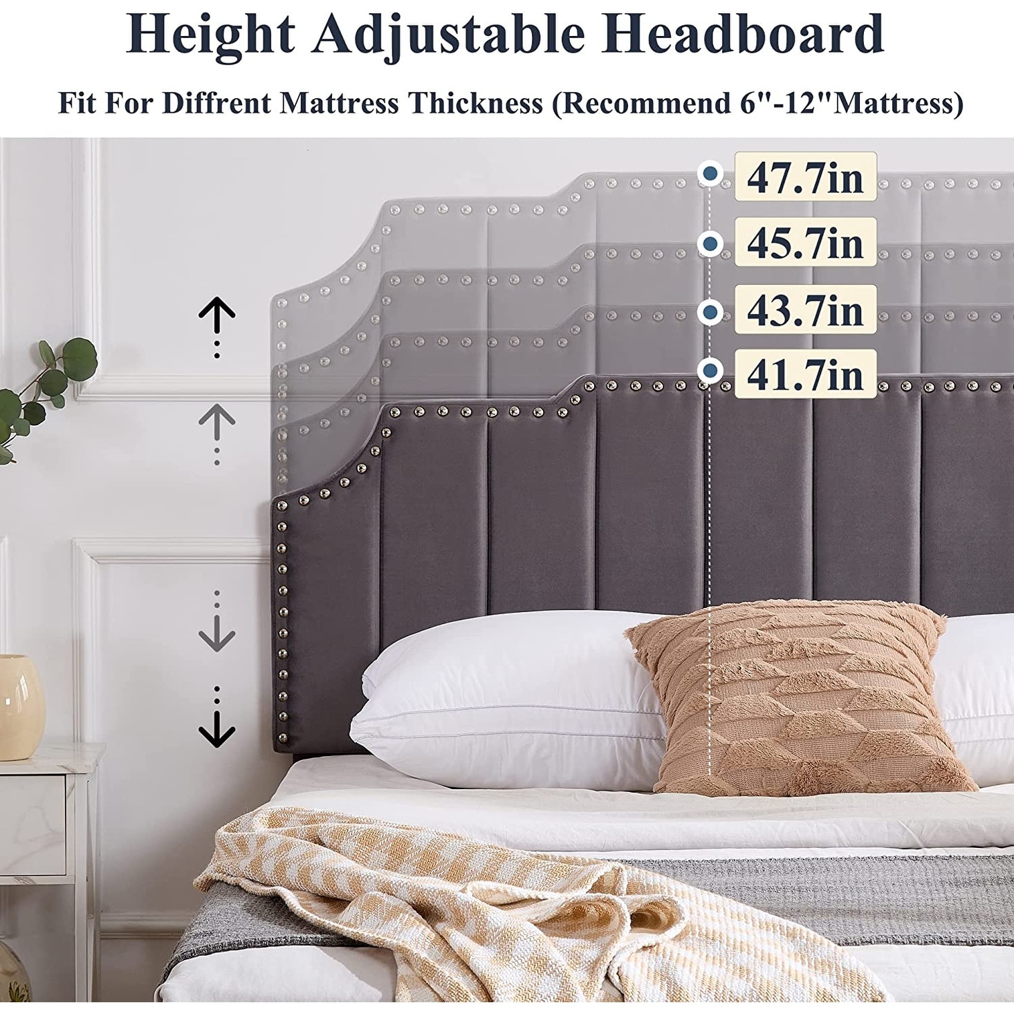 Javlergo Upholstered Platform Bed Frame with Nailhead Trimmed Adjustable Height Headboard Grey - Queen