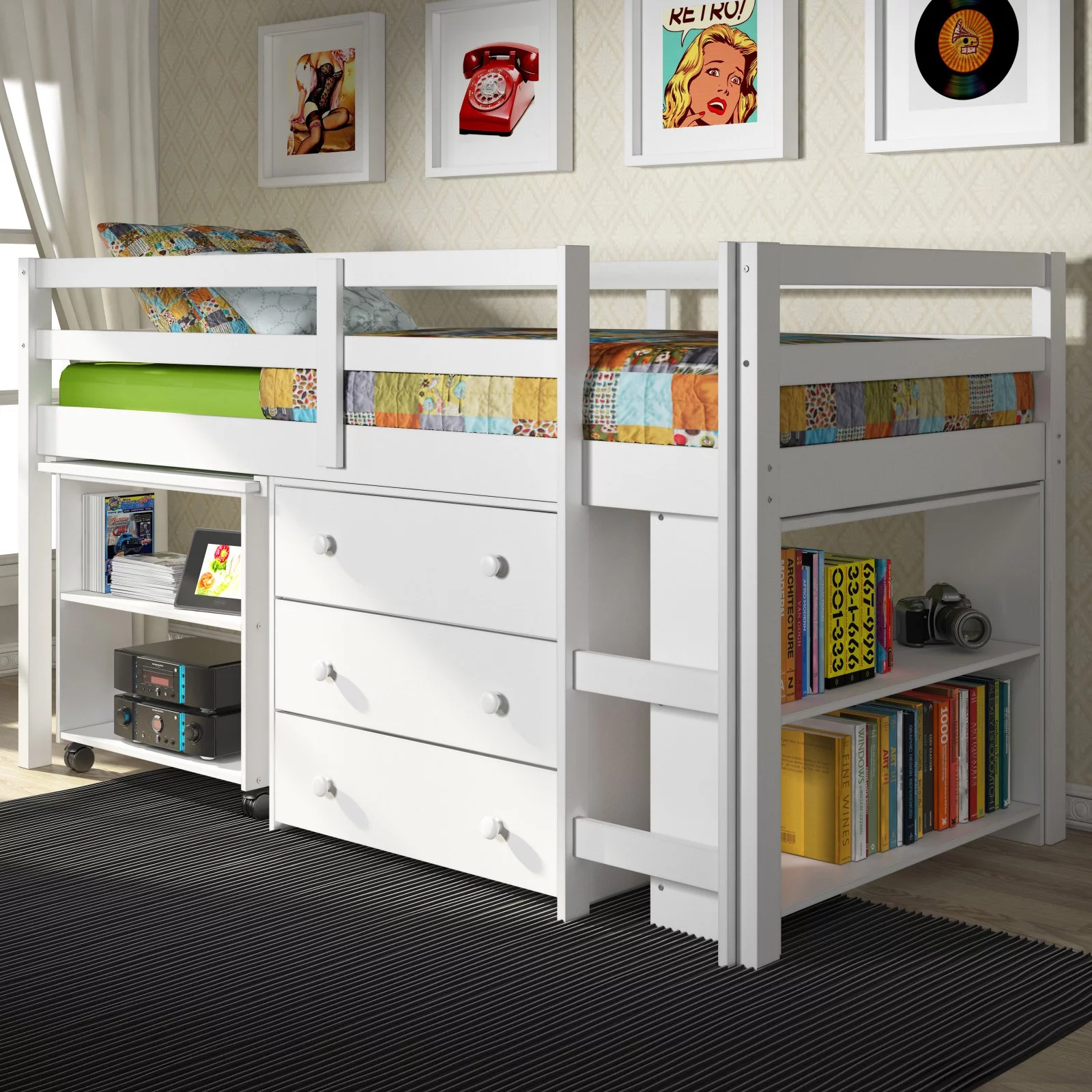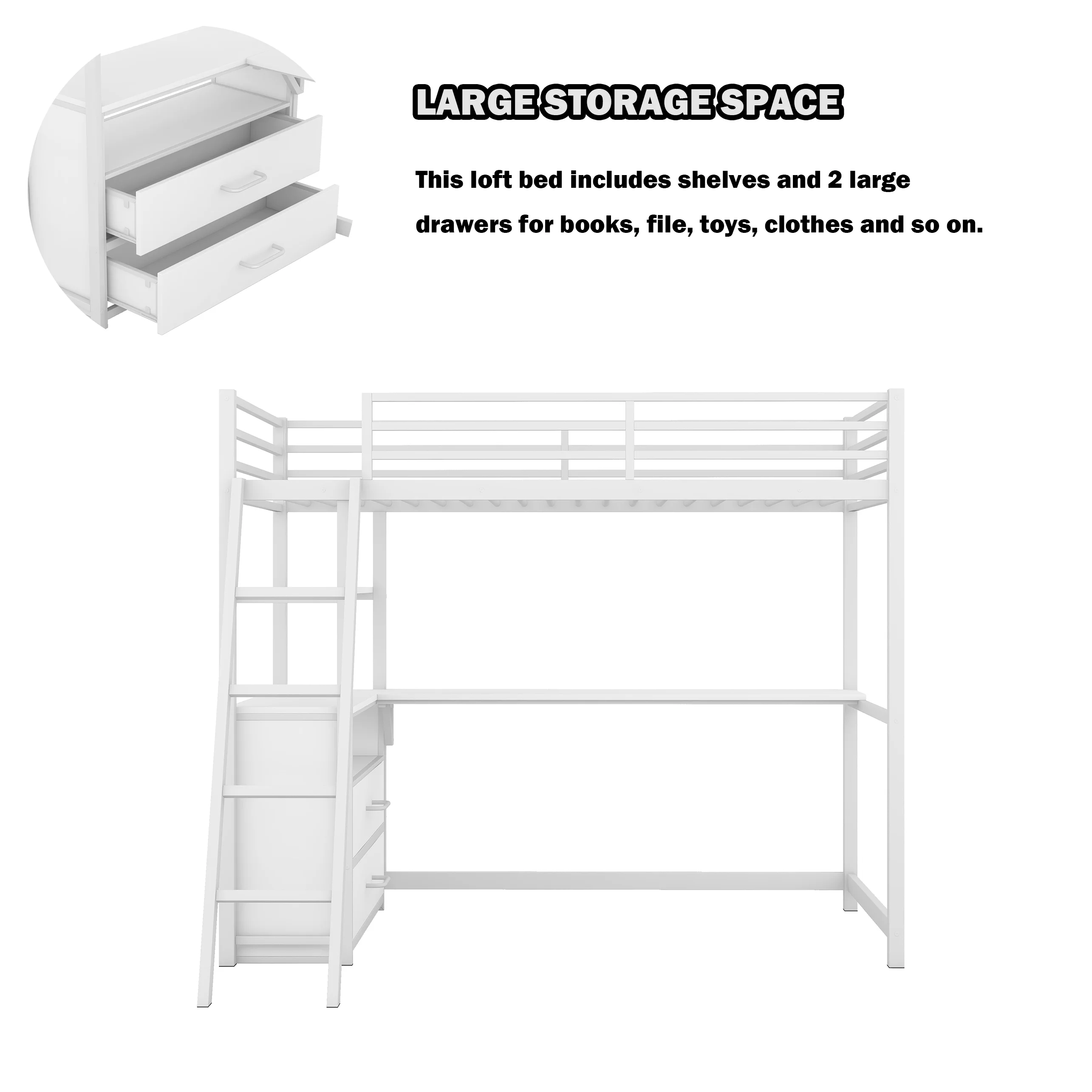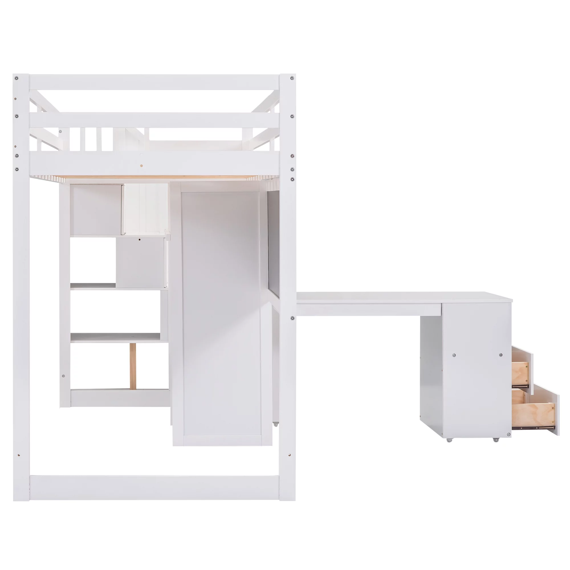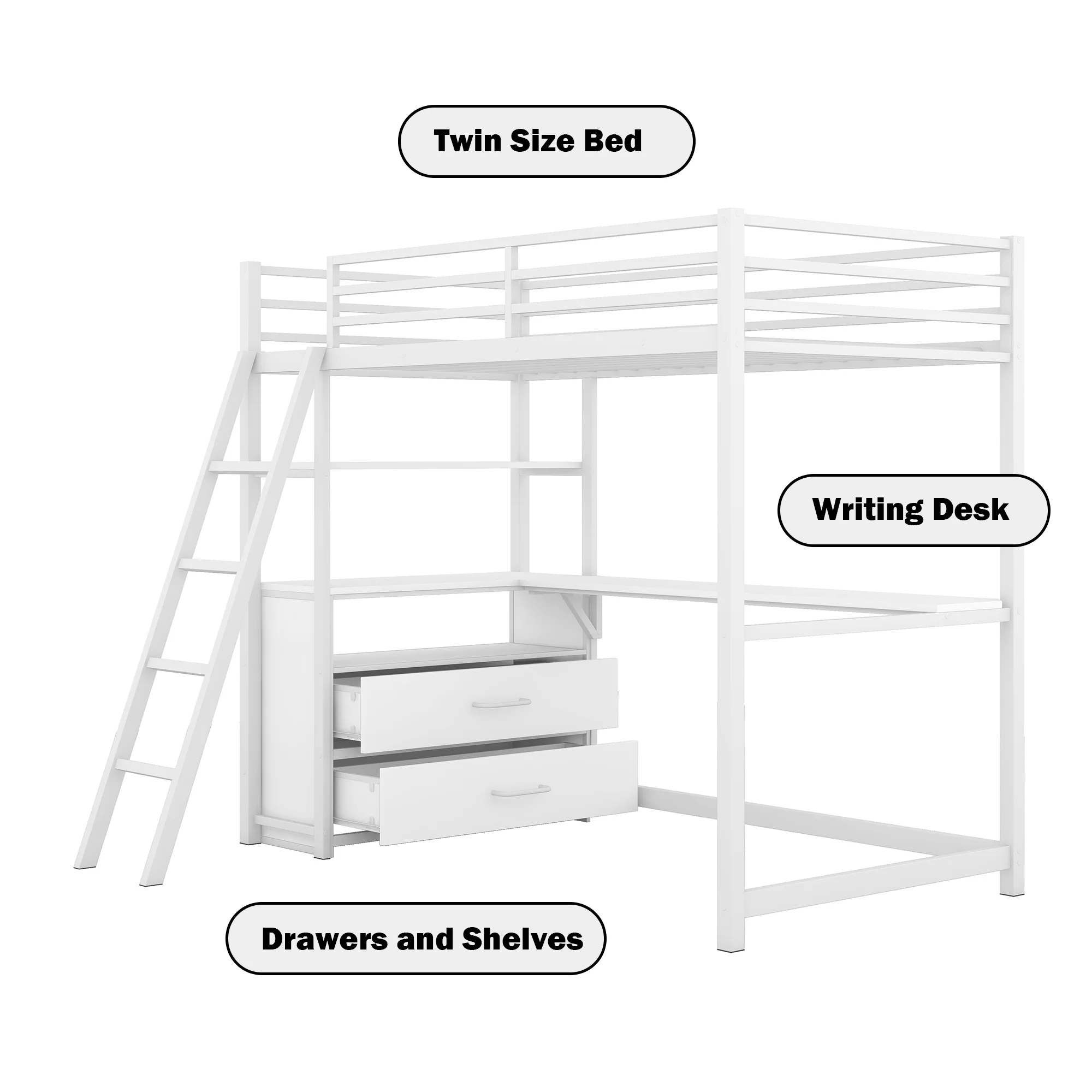 Rosebery Kids Modern Wood Loft Bed with Chest and Twin Lower Bed in White