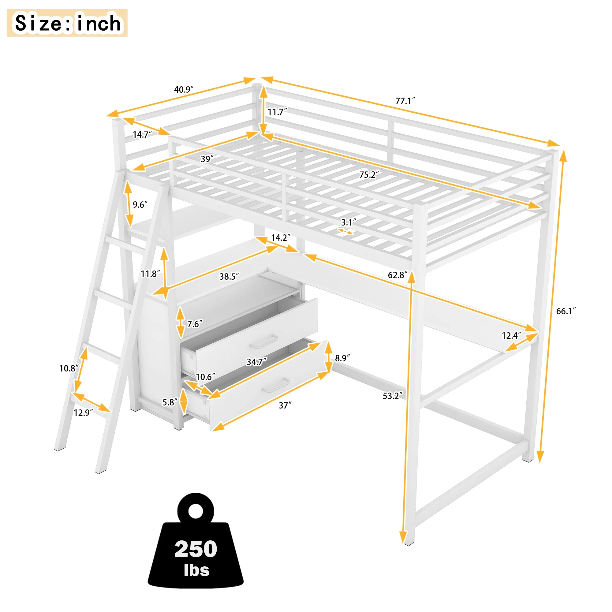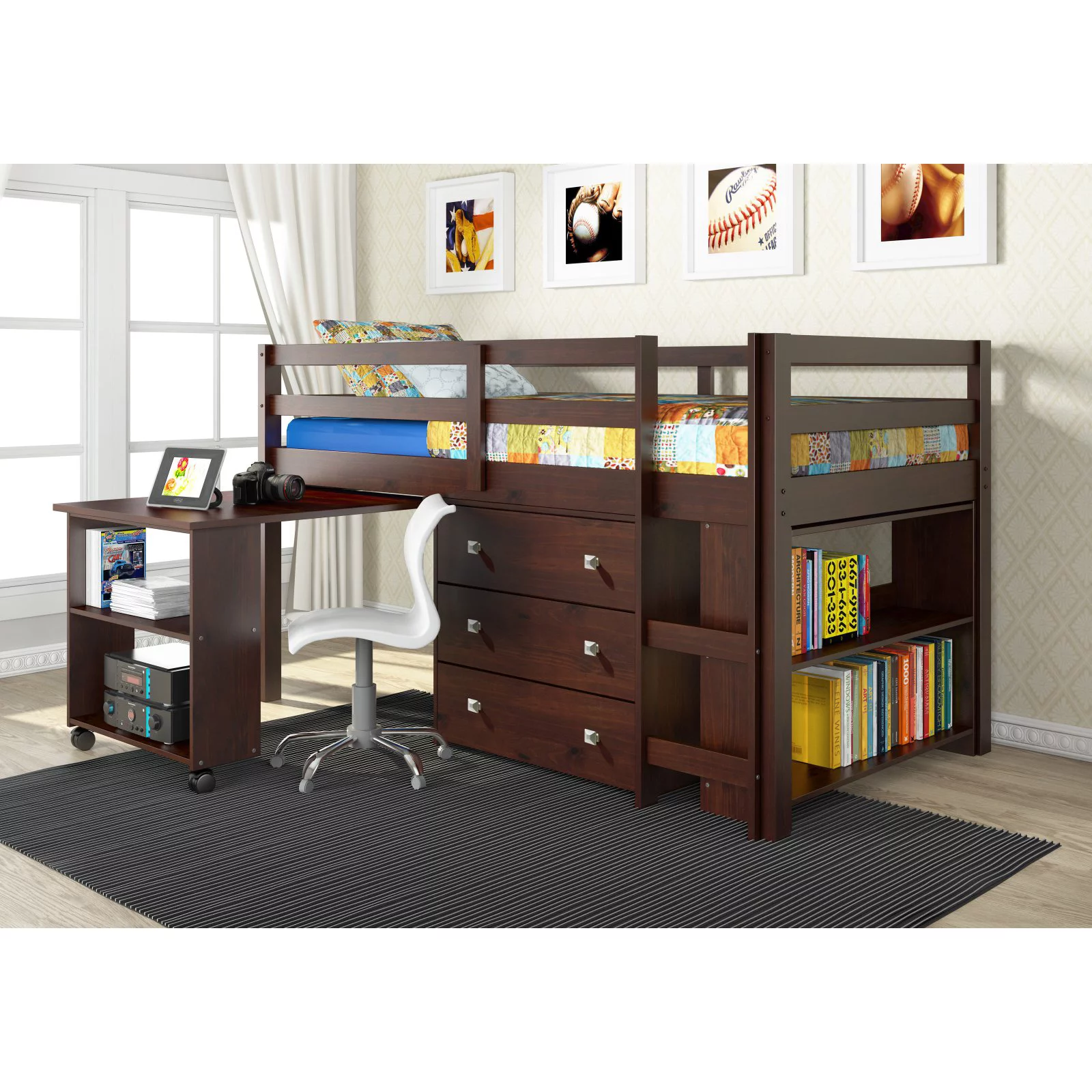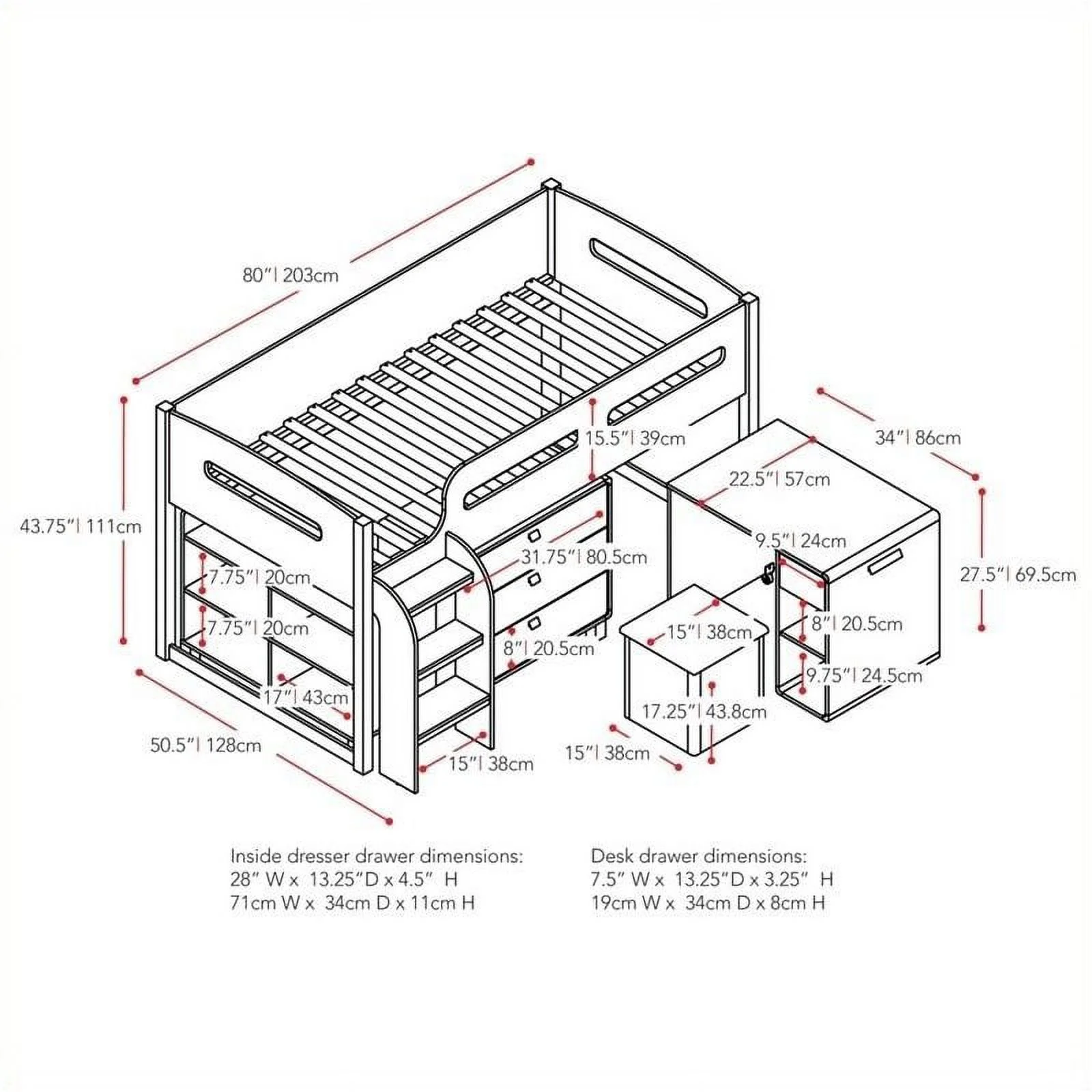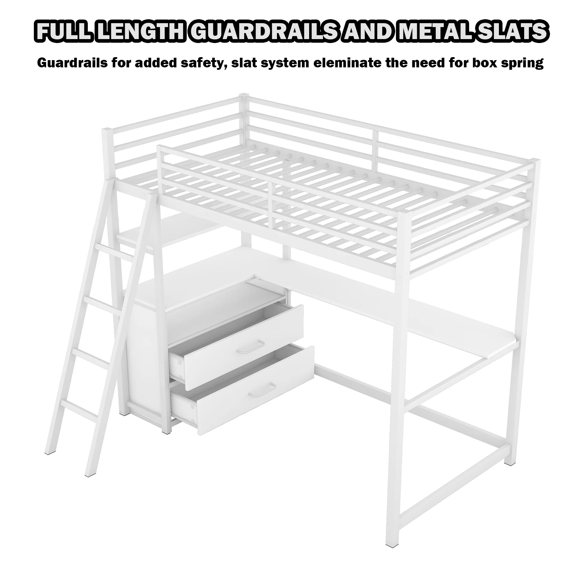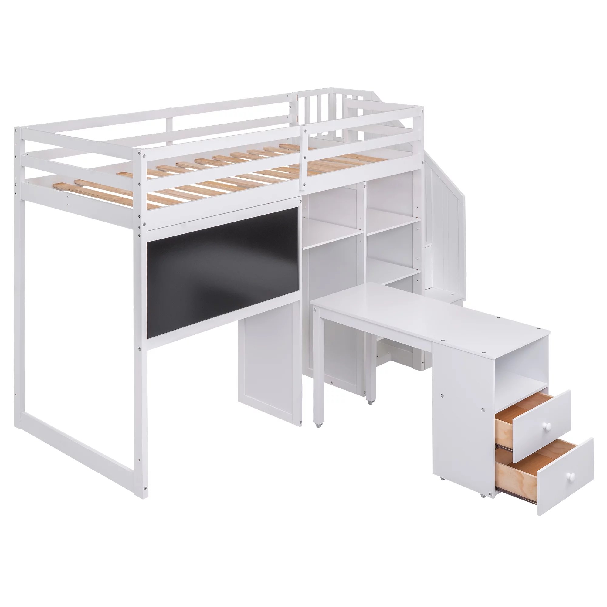 Rosebery Kids Modern Wood Loft Bed with Chest and Twin Lower Bed in White