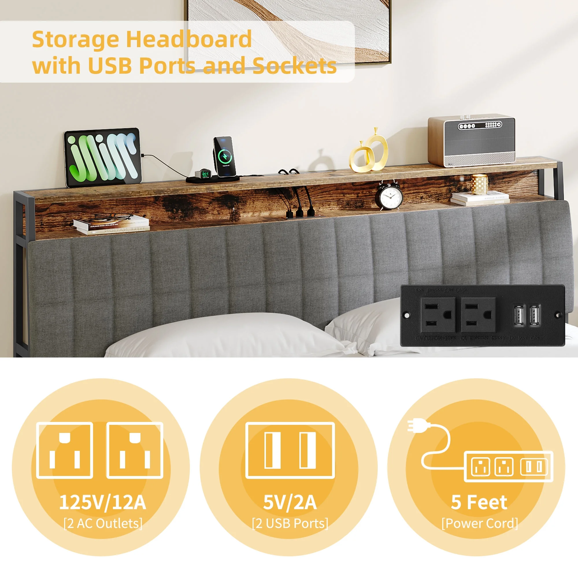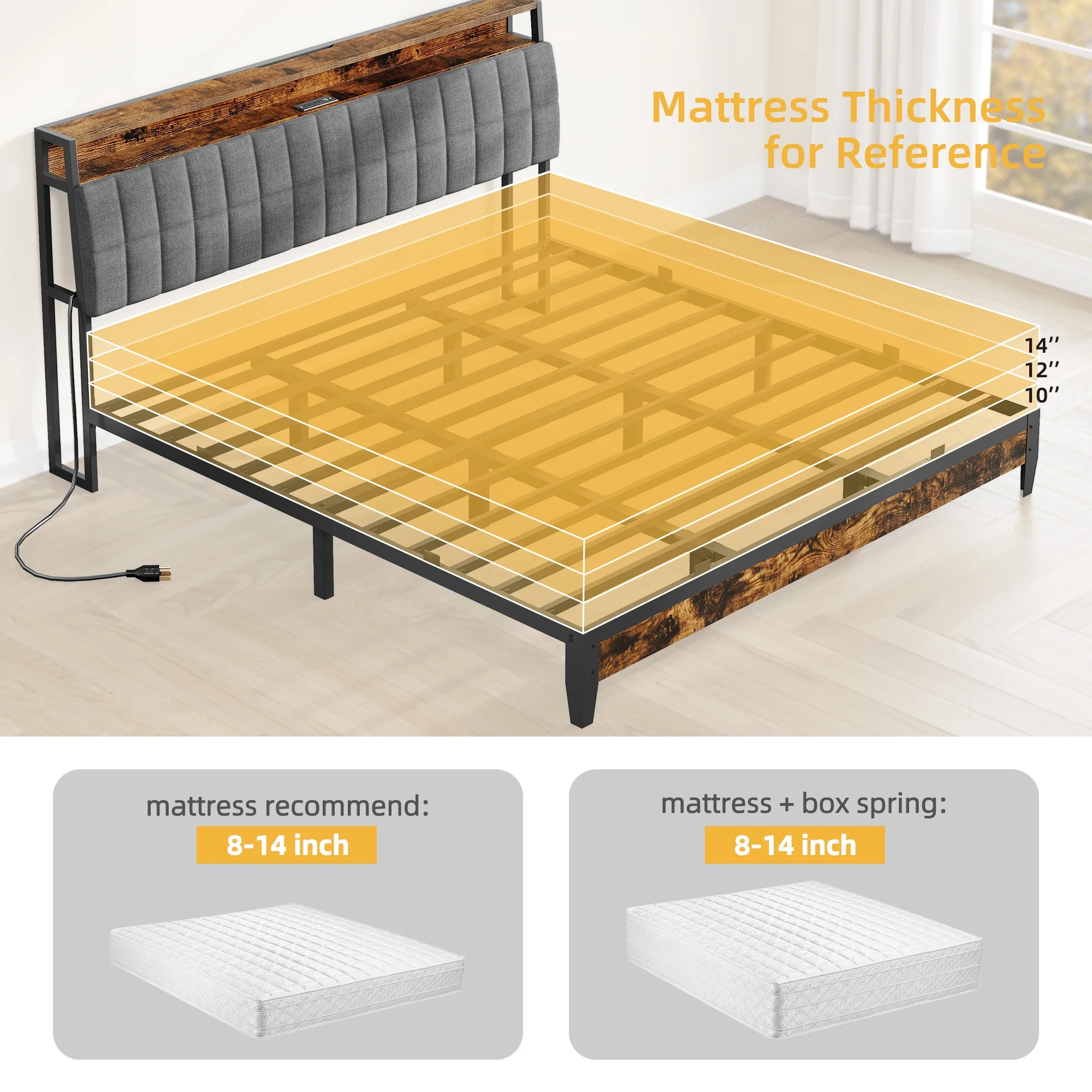DWVO King Bed Frame with Charging Station, Platform Metal Bed with Upholstered Headboard, Rustic Brown and Gray