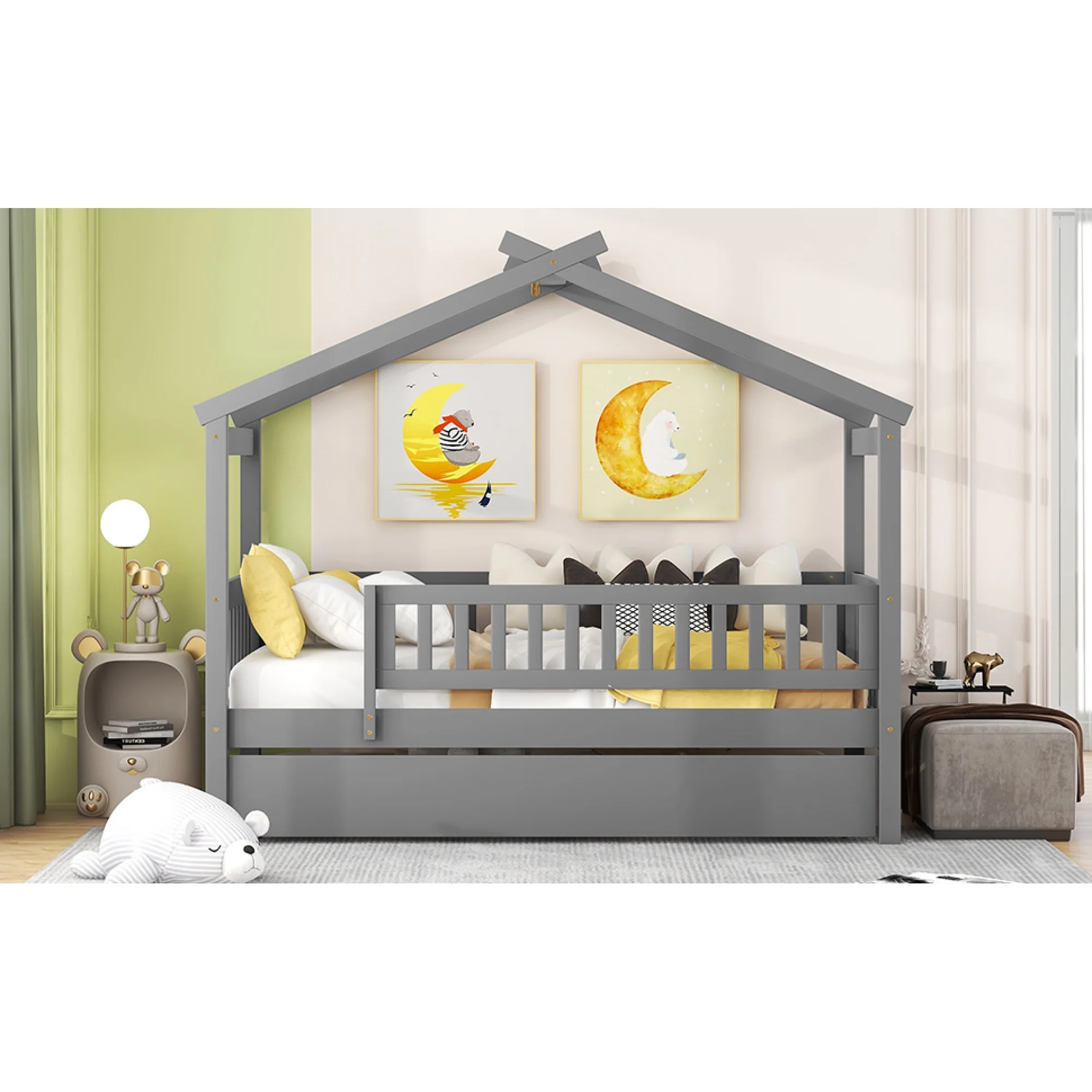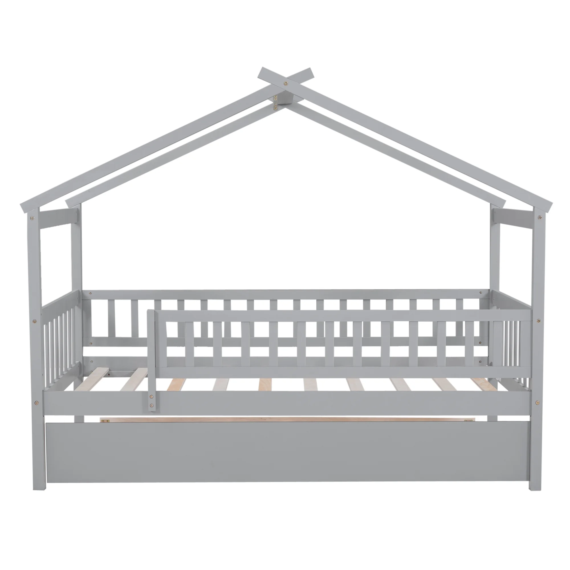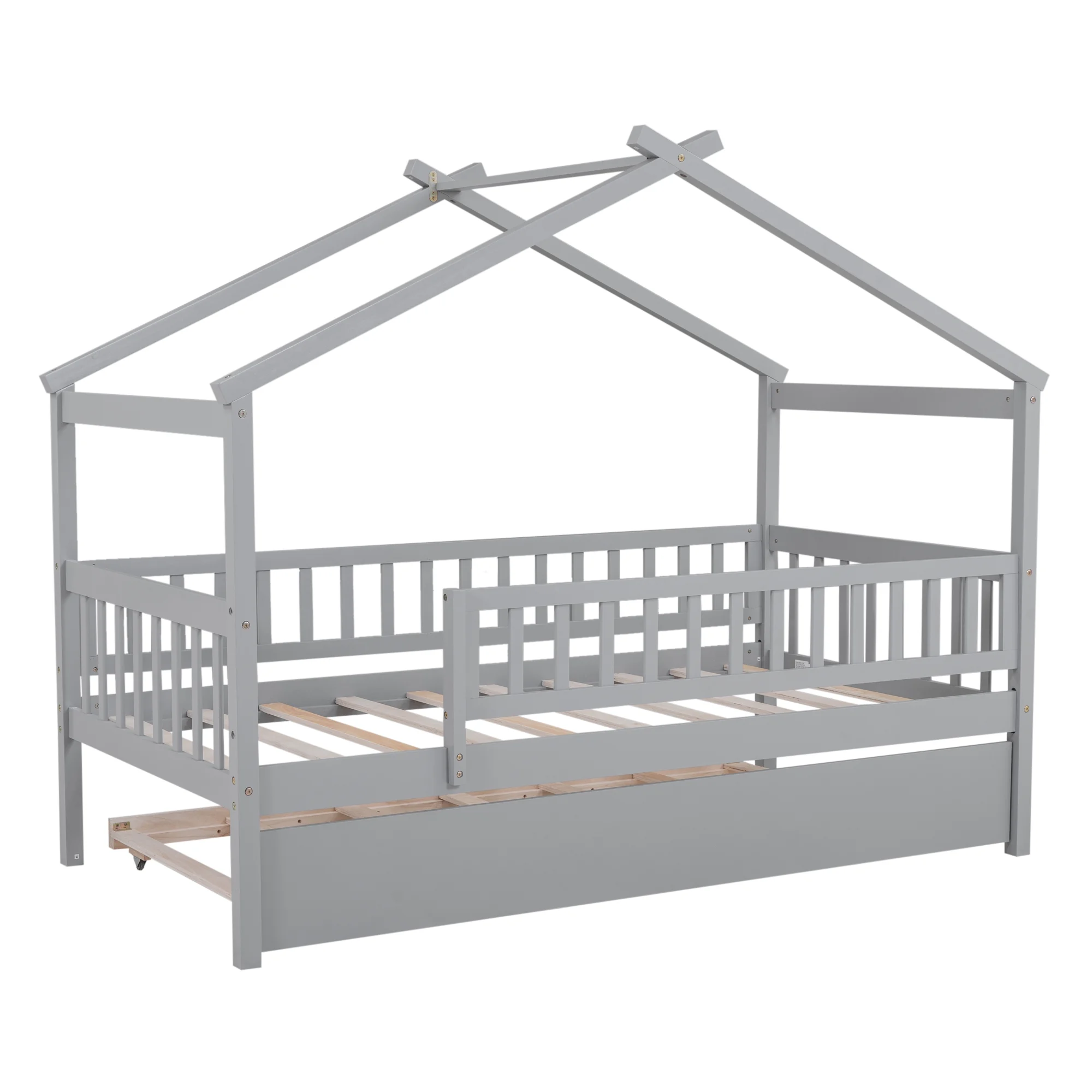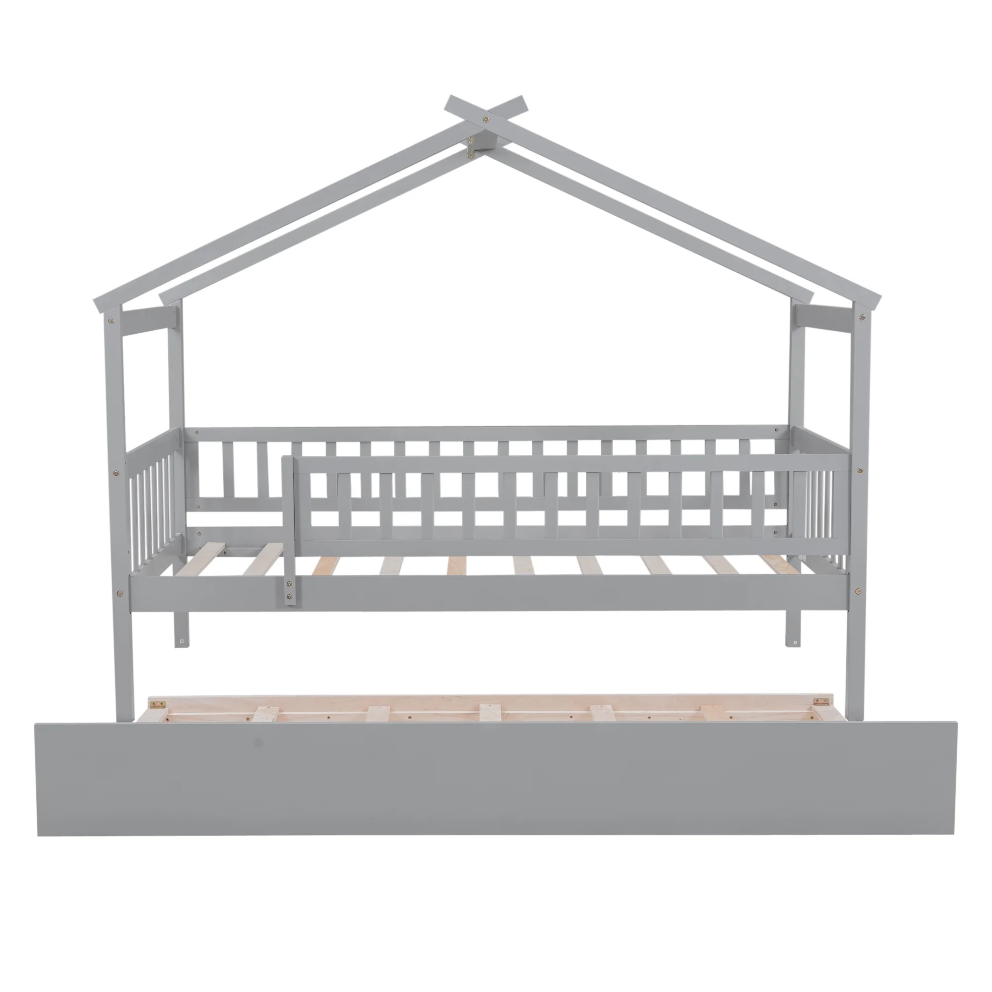 "Charming Twin-Size Wooden House Bed with Matching Twin Trundle in Elegant Gray - Ideal for Cozy Sleepovers"
