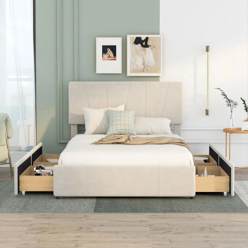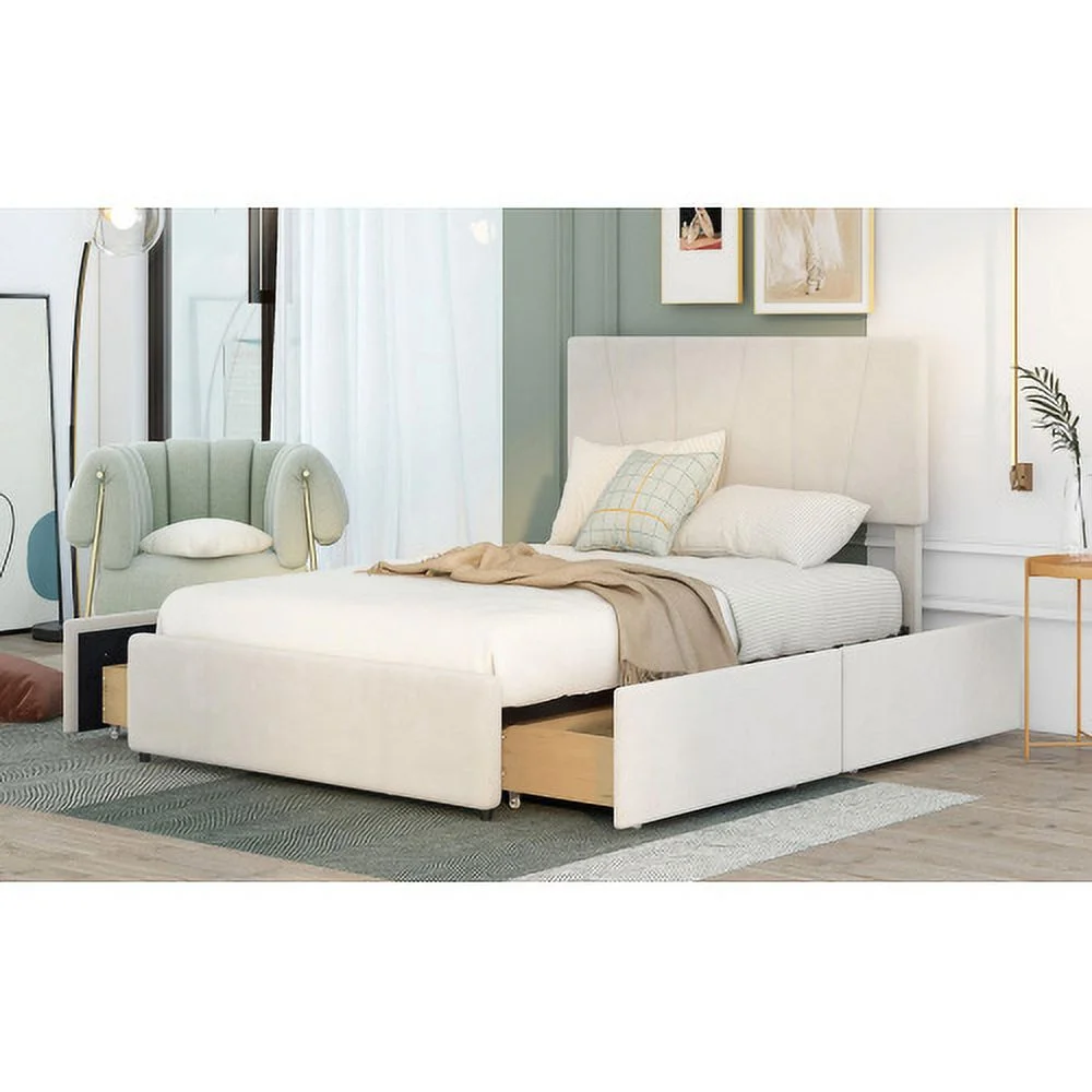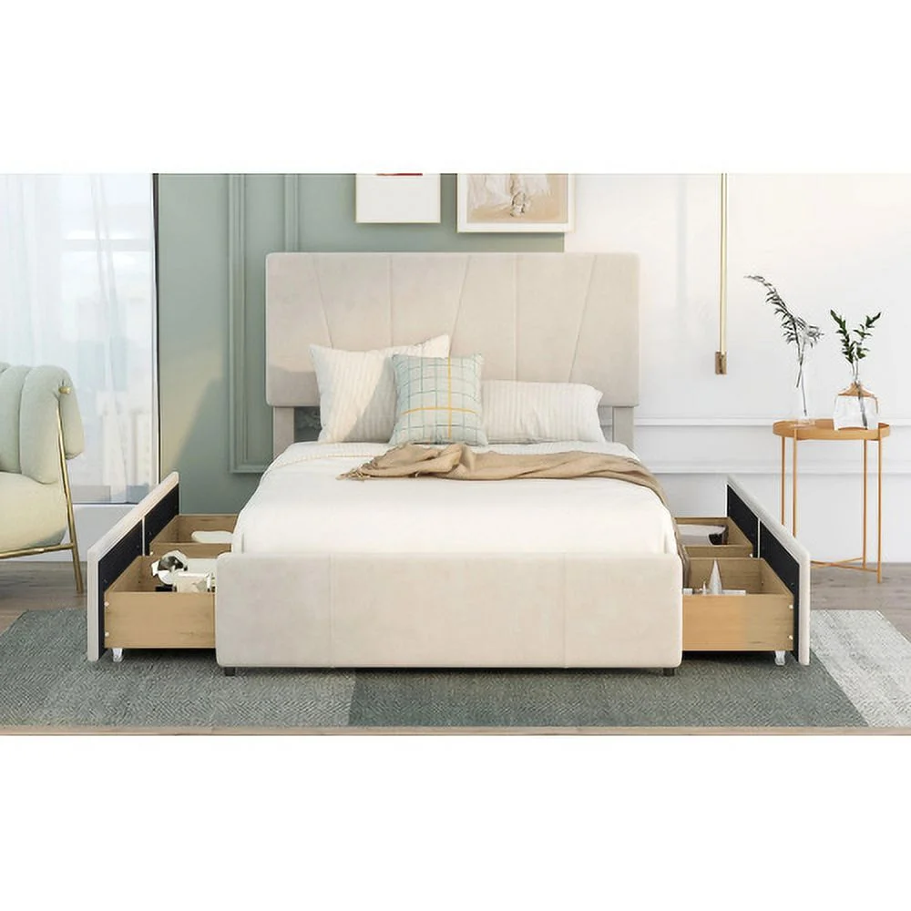 Full Size Upholstery Platform Bed with Four Drawers on Two Sides, Adjustable Headboard, Beige