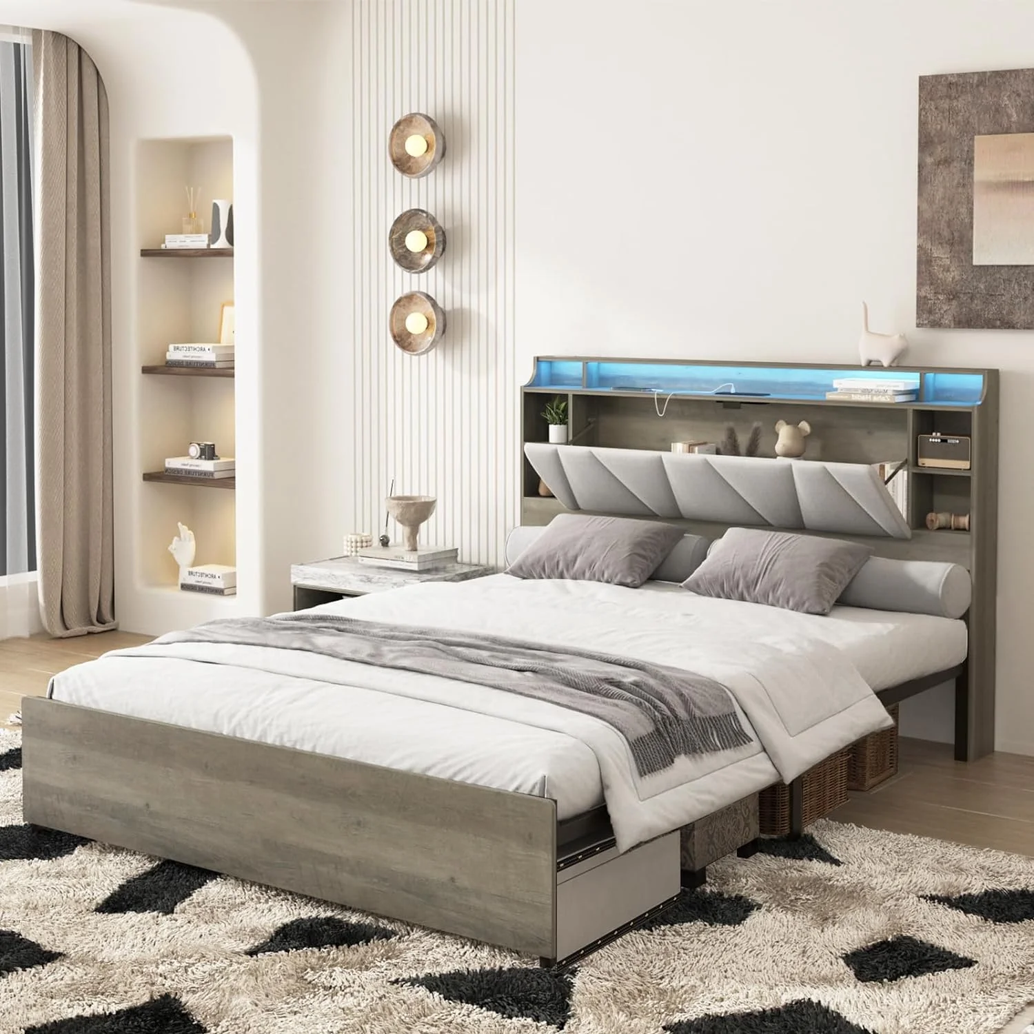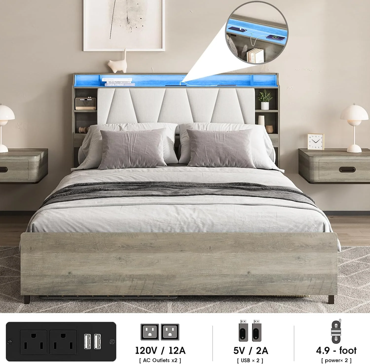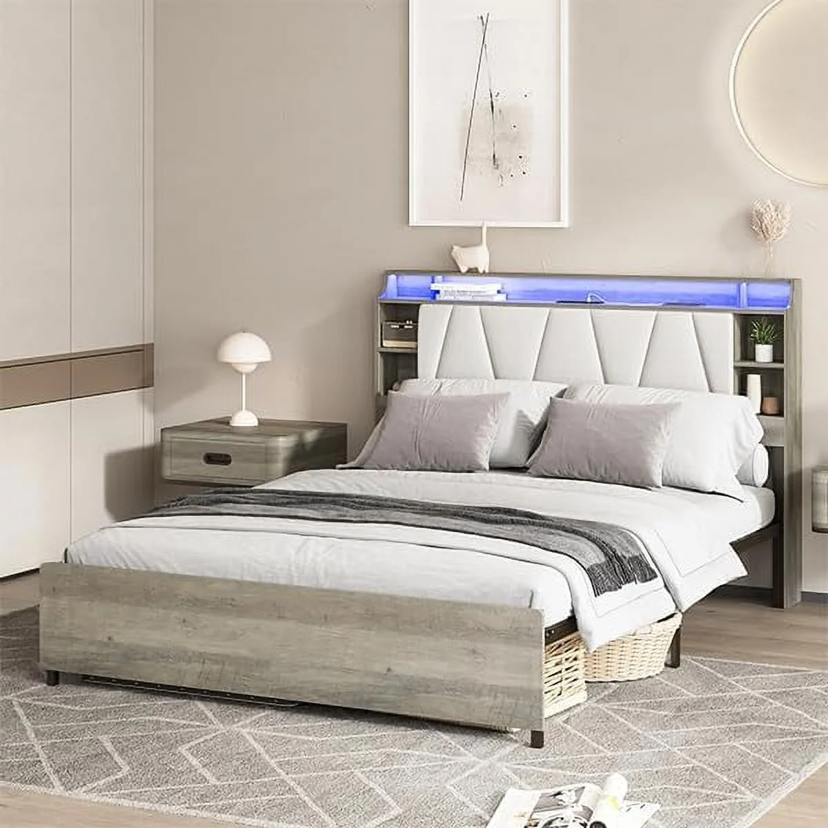 "Queen Size Wood Platform Bed in Natural Wood Color with Under-Bed Storage and 2 Built-In Drawers"
