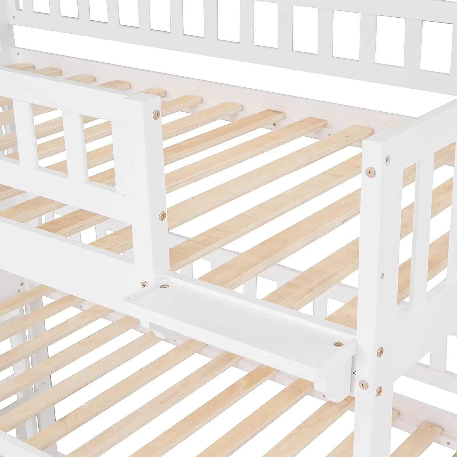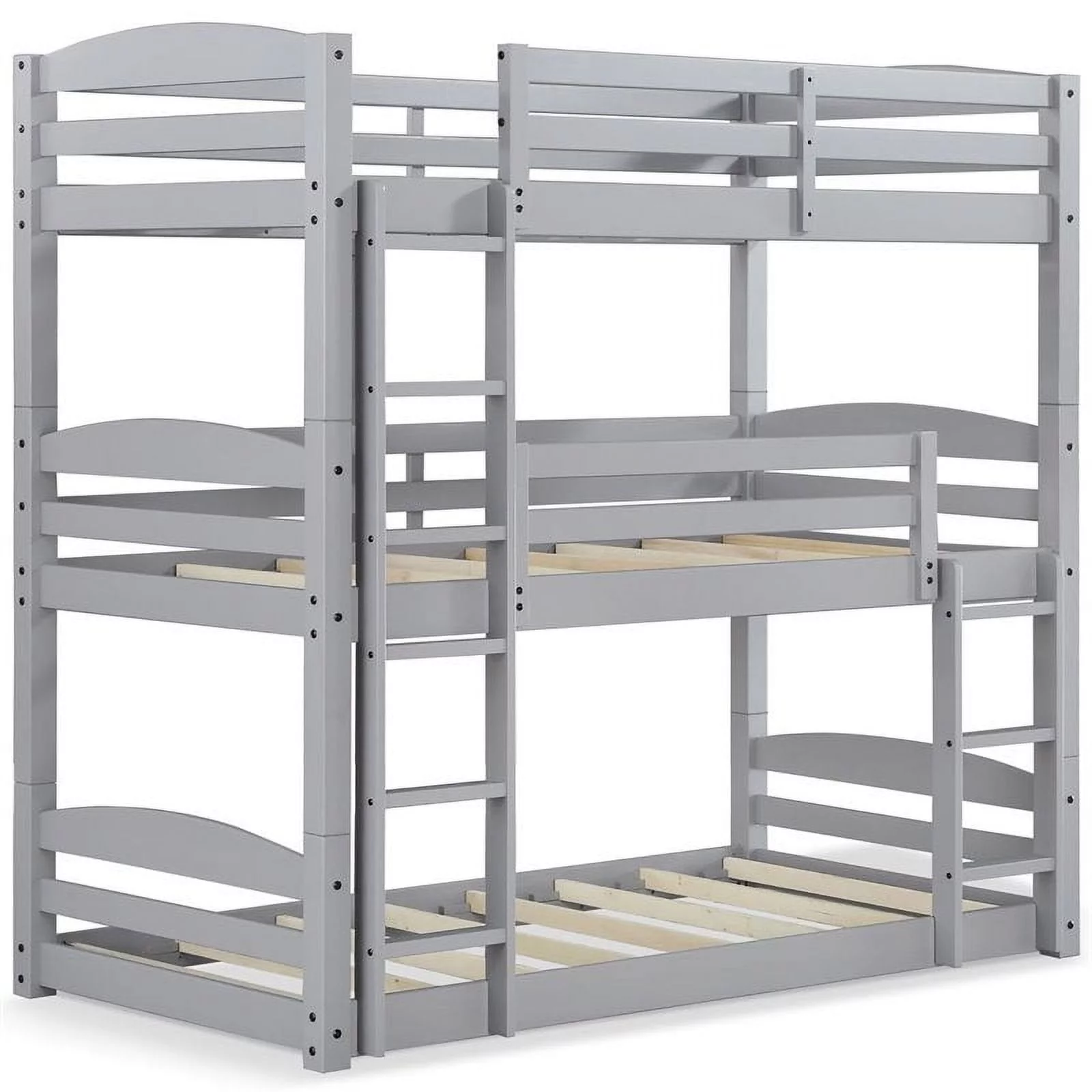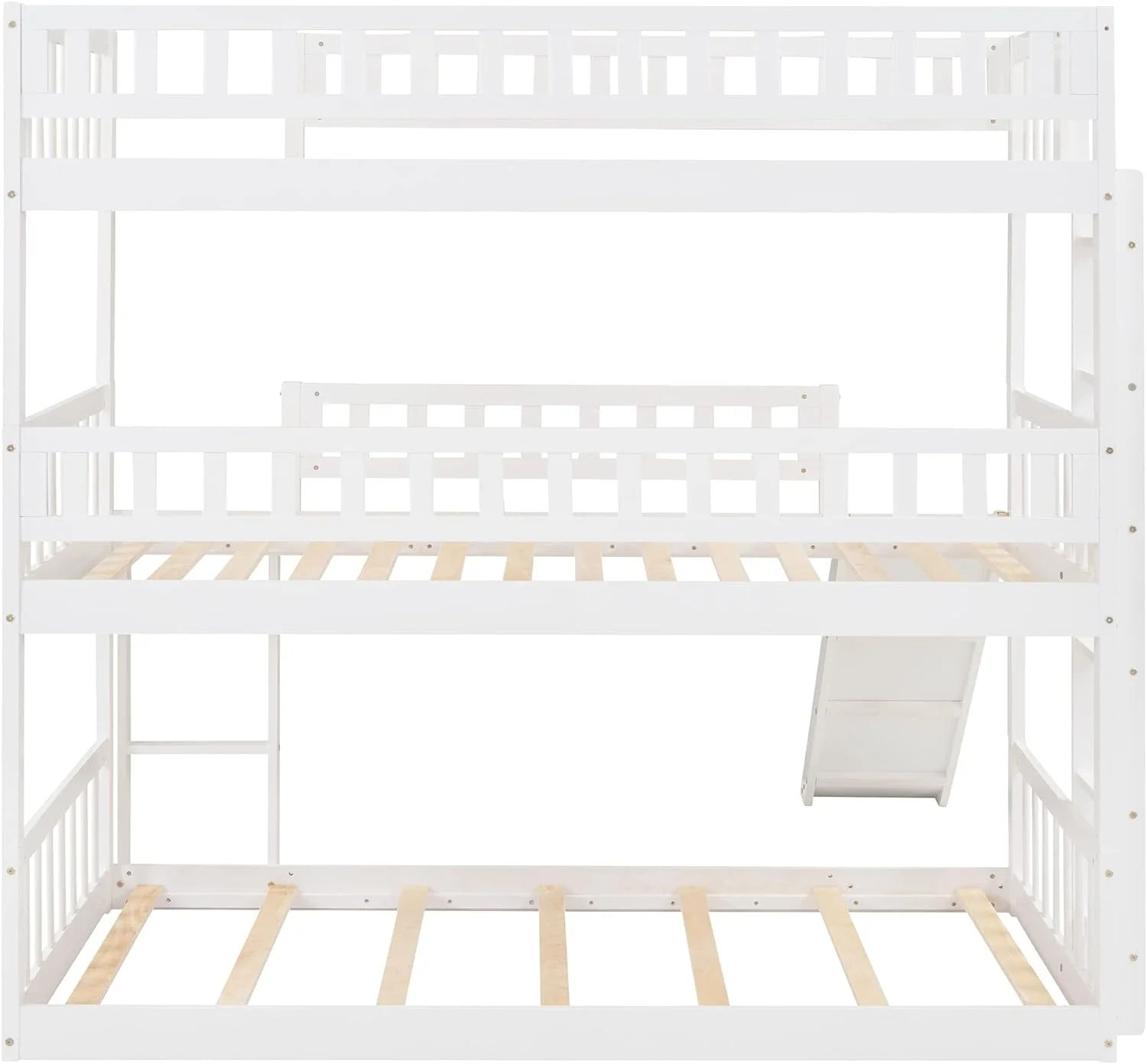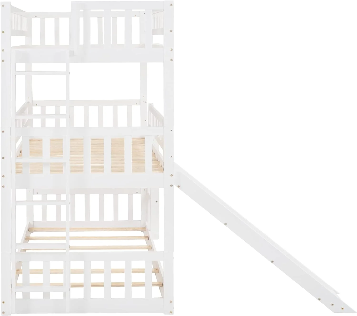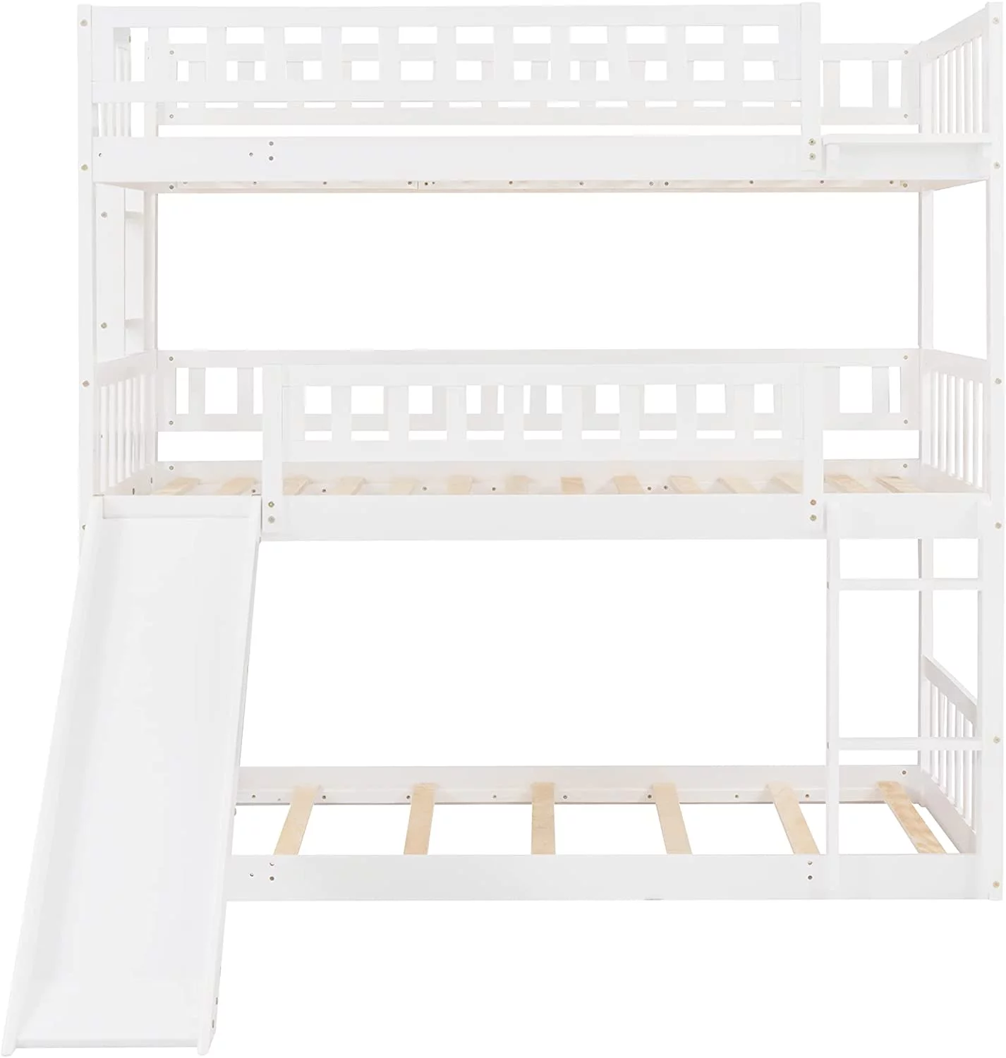Triple Bunk Bed With Slide, Wooden -Over--Over- Triple Bed With Built-In Ladder And Guardrails, For Kids Girls Boys – White
