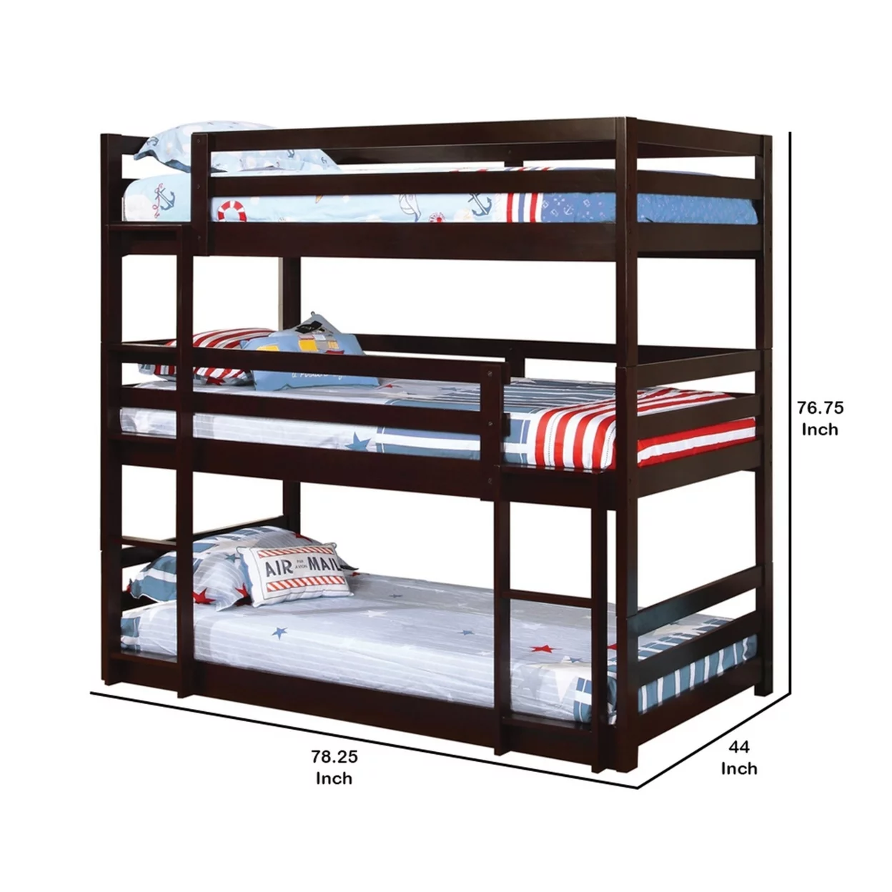 Transitional Style Wooden Triple Twin Size Bunk Bed with Guard Rails, Brown - 76.75 x 78.25 x 44 in.