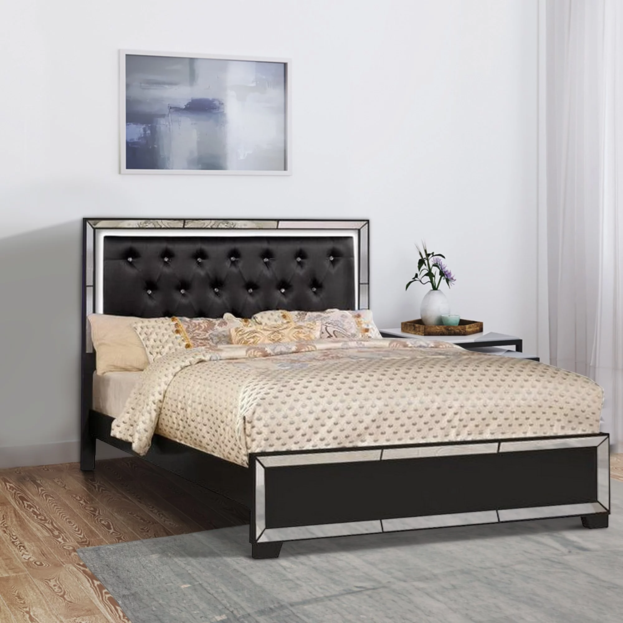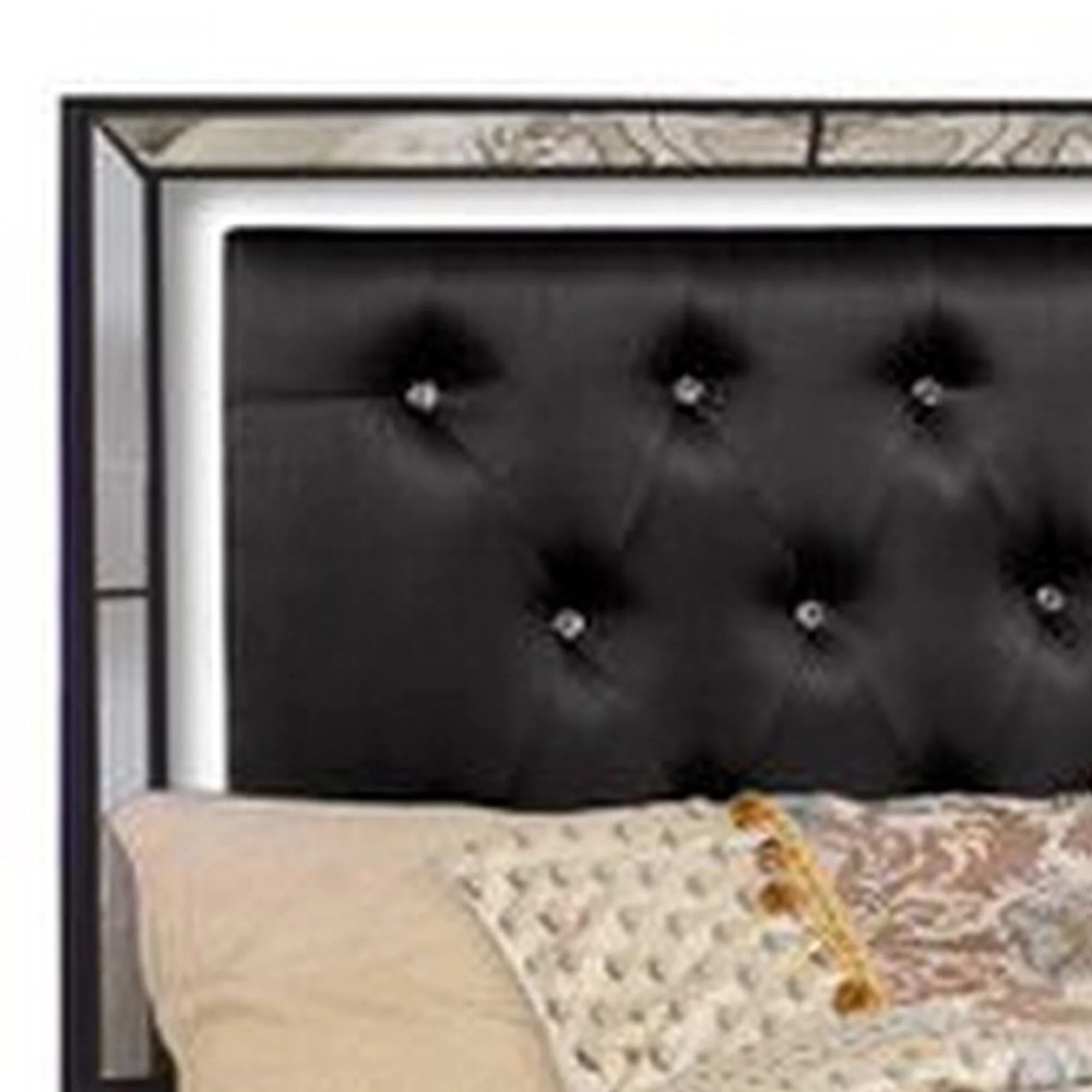 Eli Crystal Tufted Queen Bed, LED, Mirrored Inlays, Wood, Velvet, Black