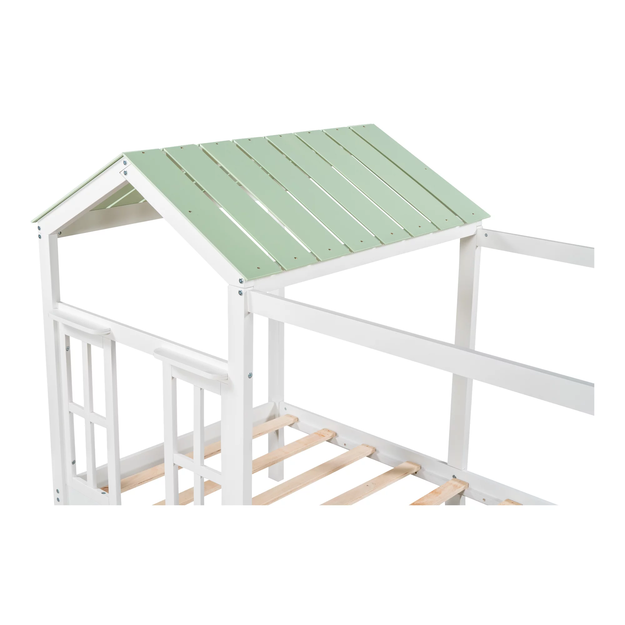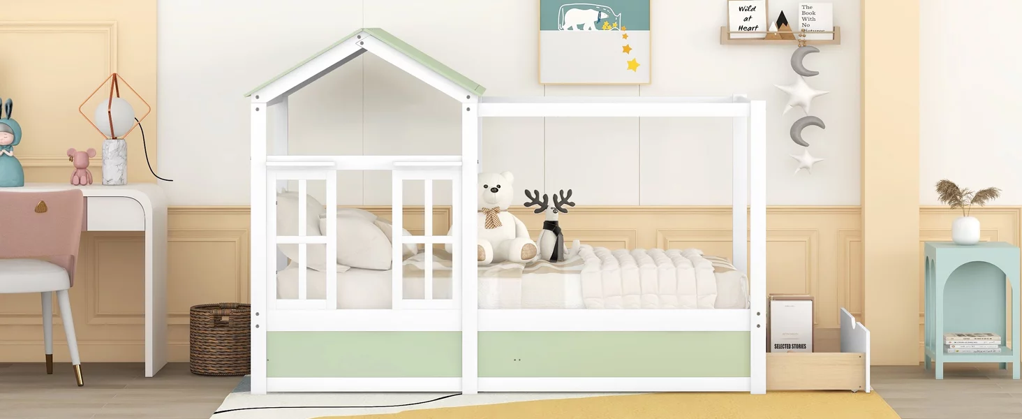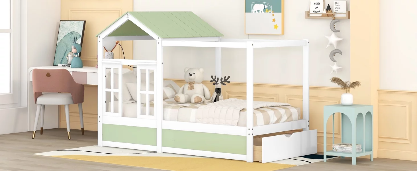 Mino Kesper House-Shaped Bed with Roof and Drawer for Kids, Twin, Green