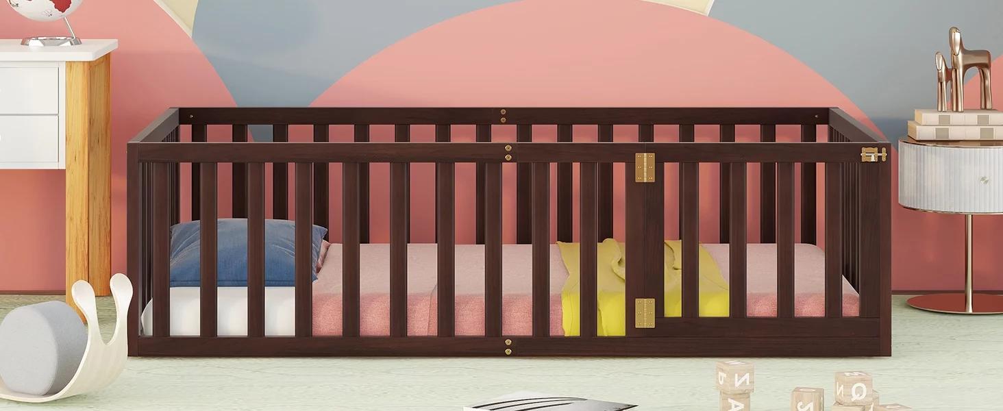 Twin Size Wood Floor Bed Frame with Fence and Door, Walnut(OLD SKU :WF289661AAL)