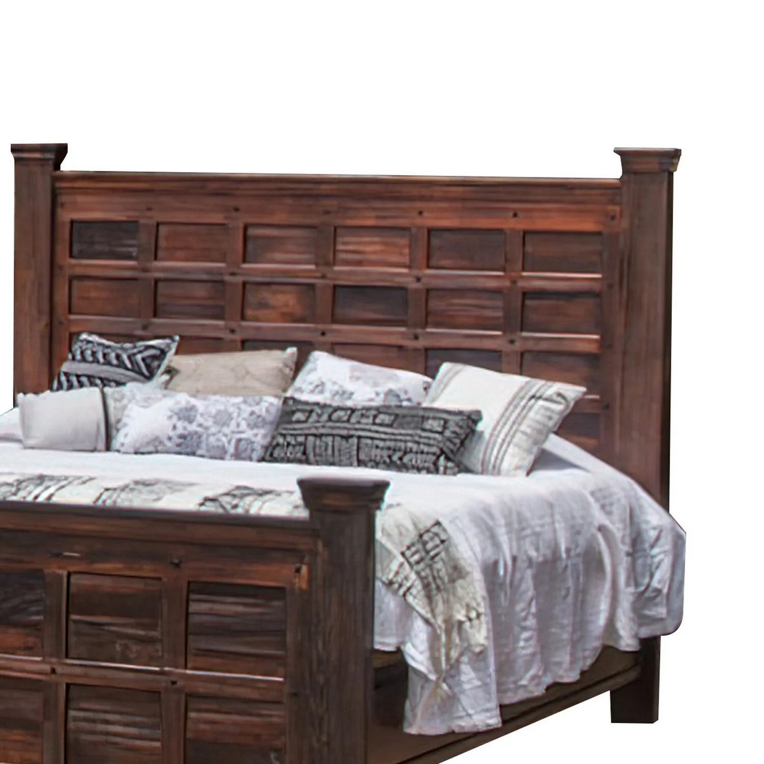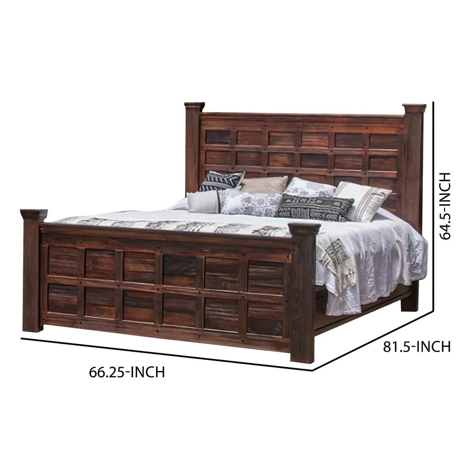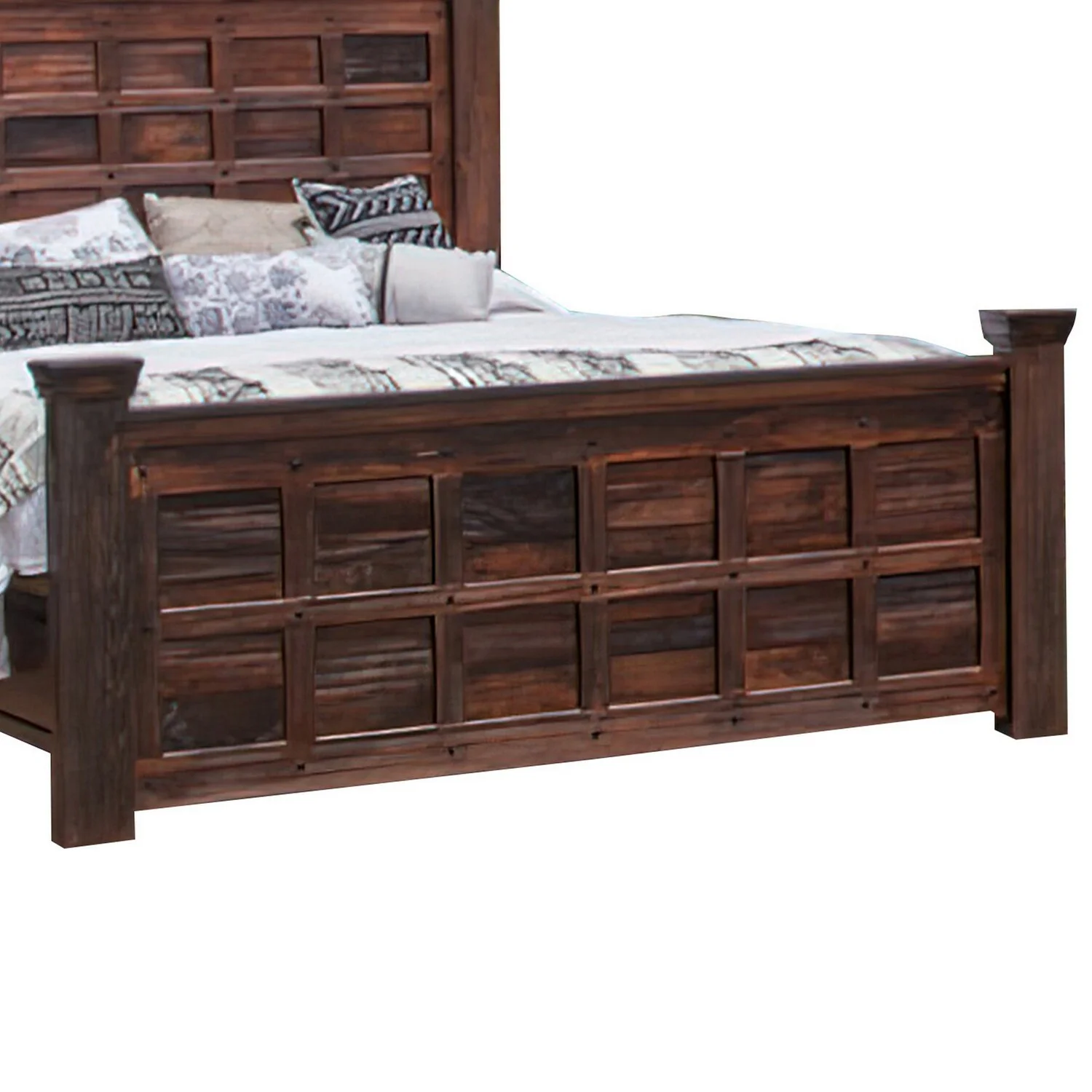 Benjara Exo Queen Size Bed, Square Block Style Headboard and Footboard, Brown Wood