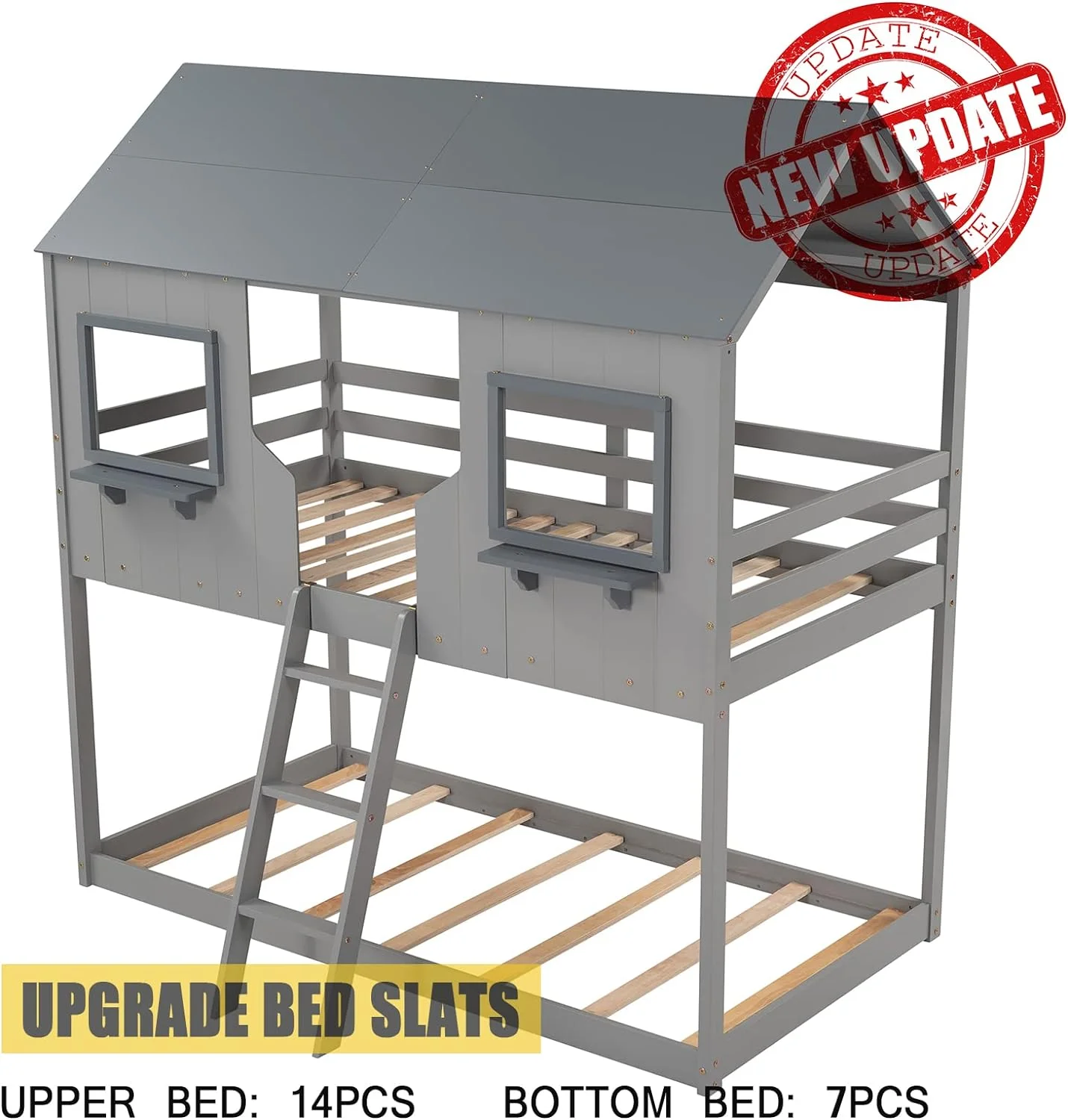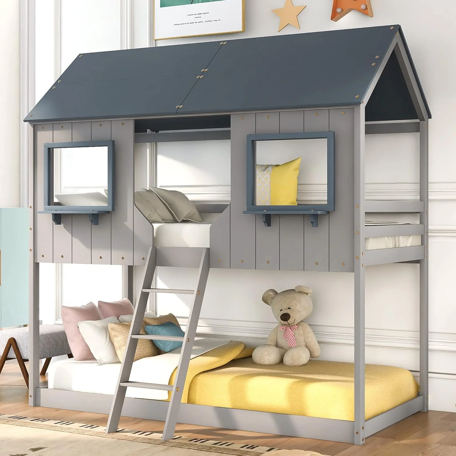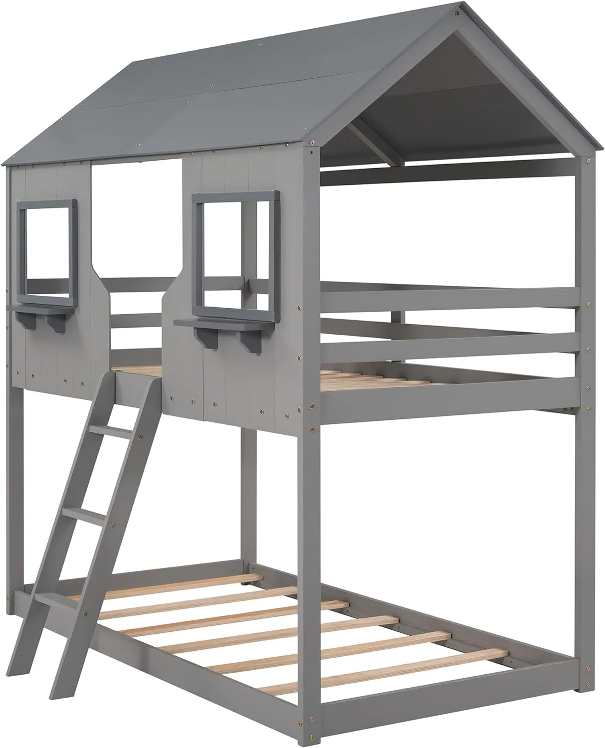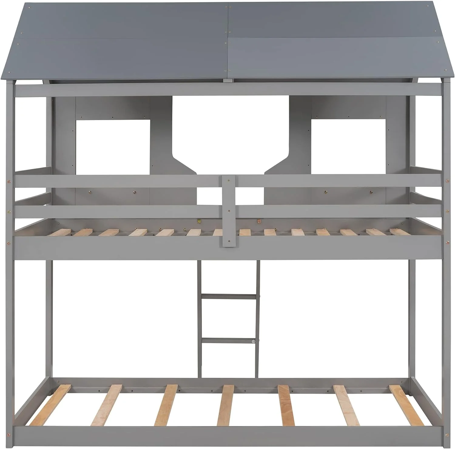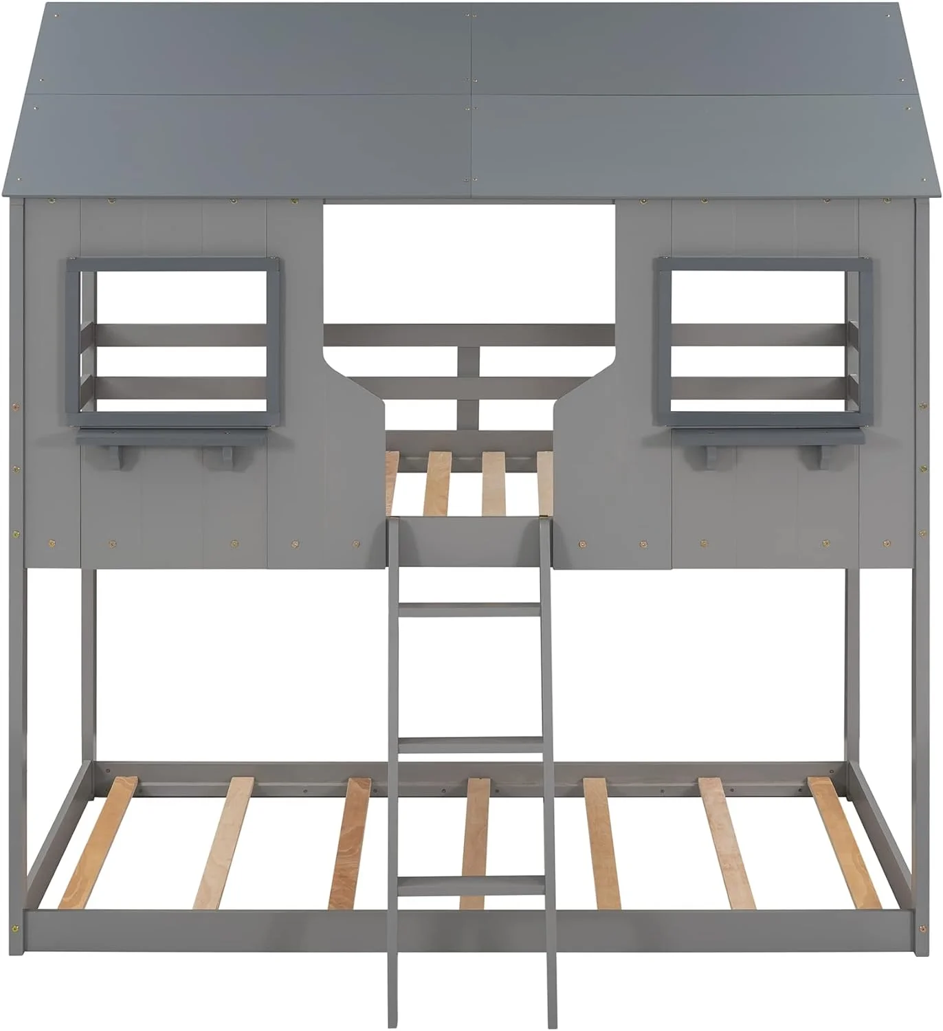 House Bunk Bed Over , Kids Bunk Beds With Roof And Windows, Wood Low Bunk Beds For Girls Boys,No Box Spring Needed,Grey