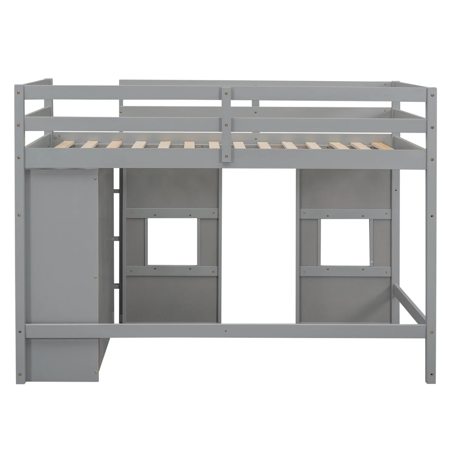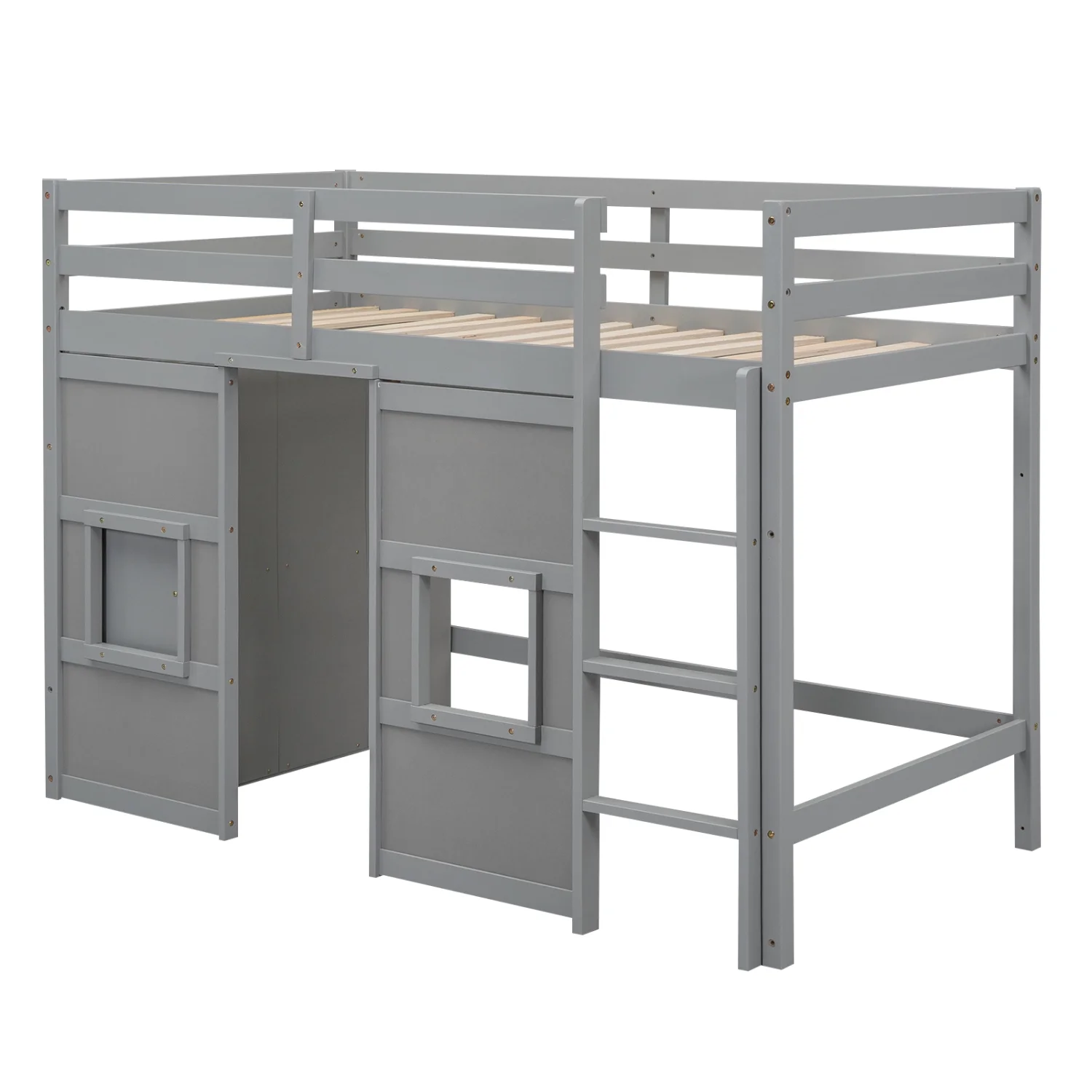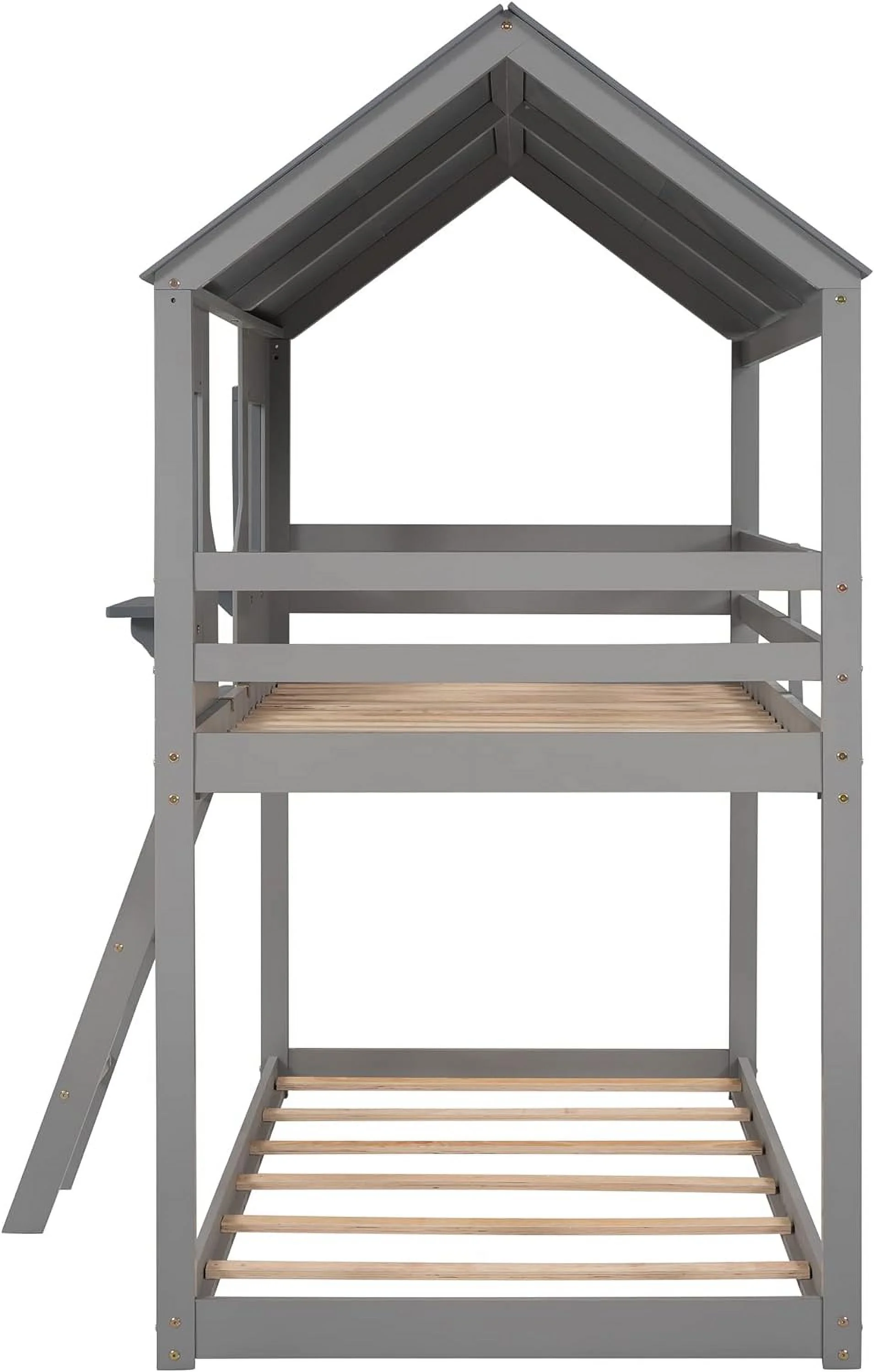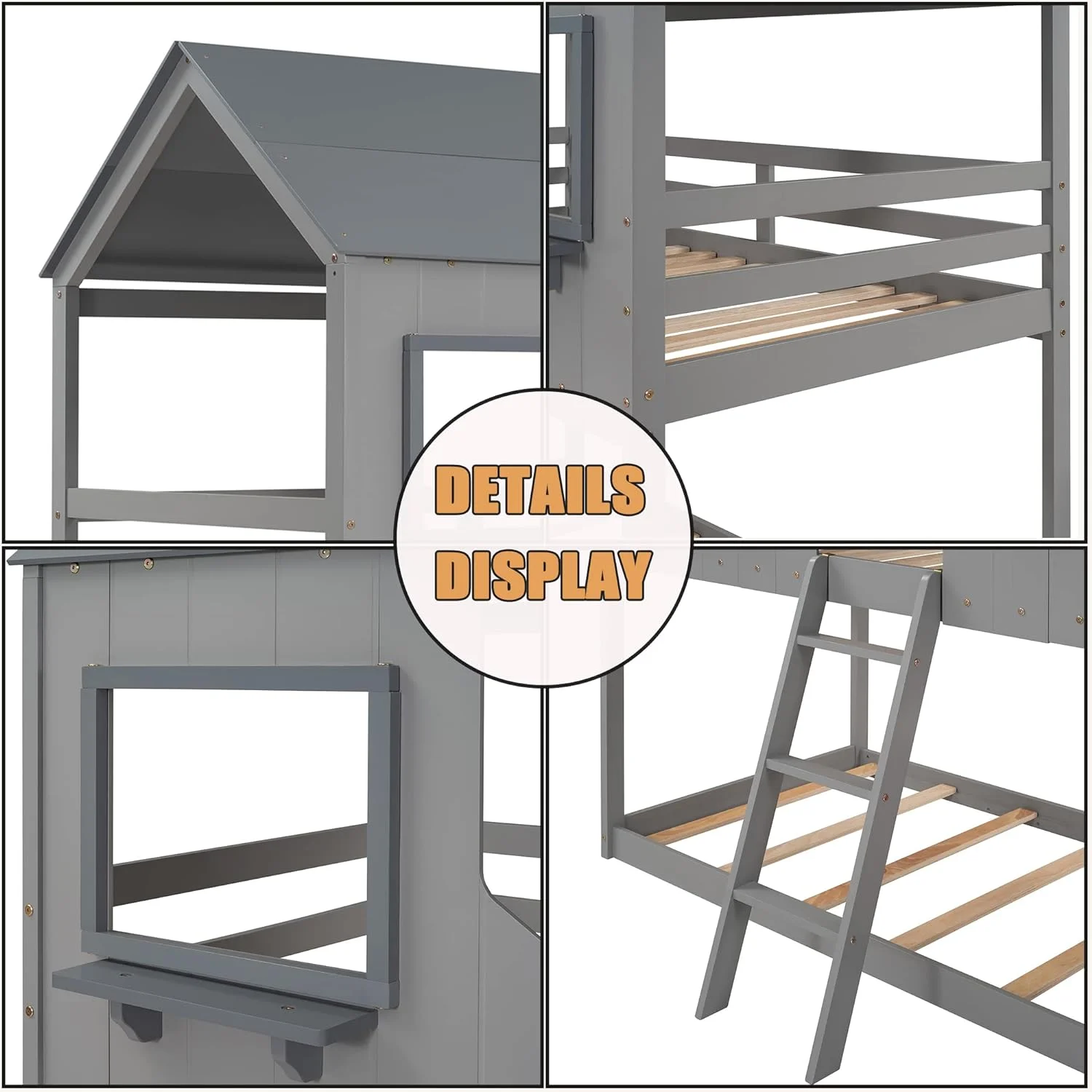 House Bunk Bed Over , Kids Bunk Beds With Roof And Windows, Wood Low Bunk Beds For Girls Boys,No Box Spring Needed,Grey