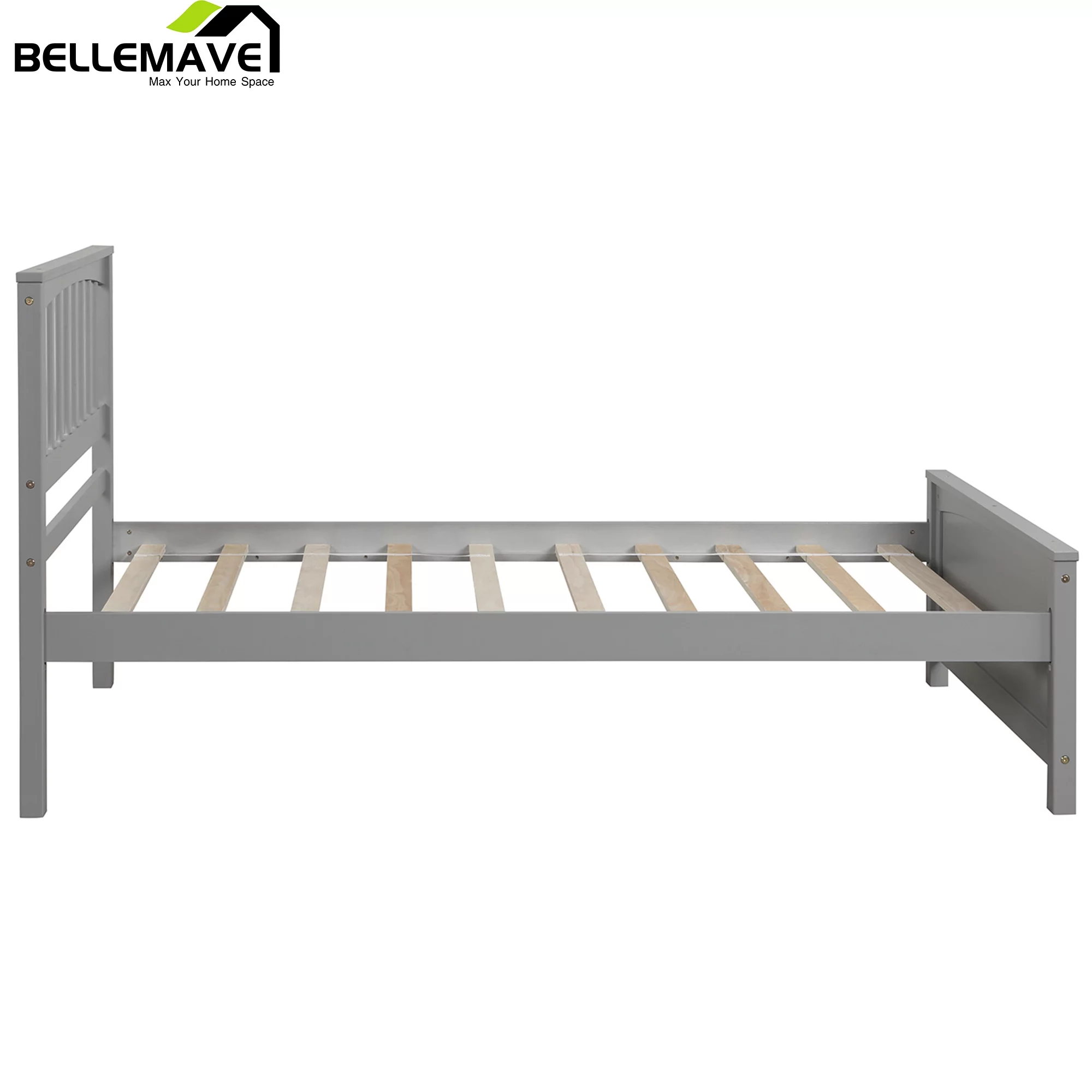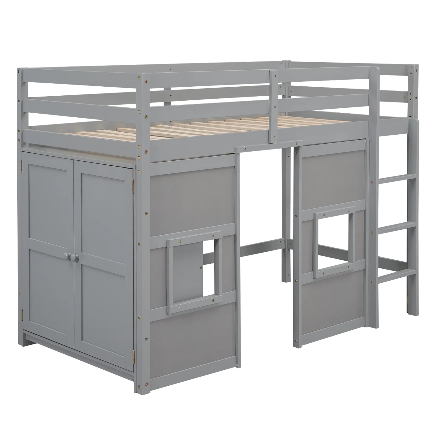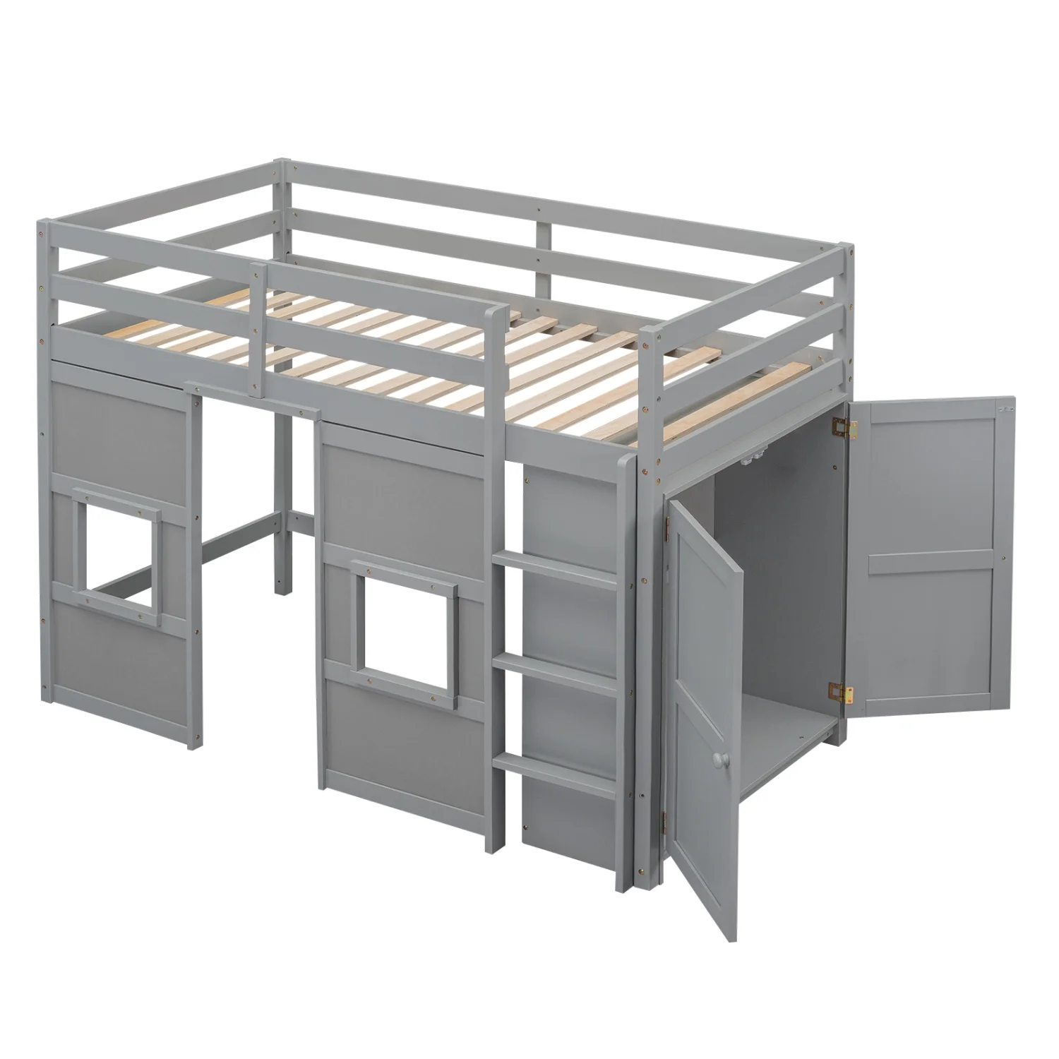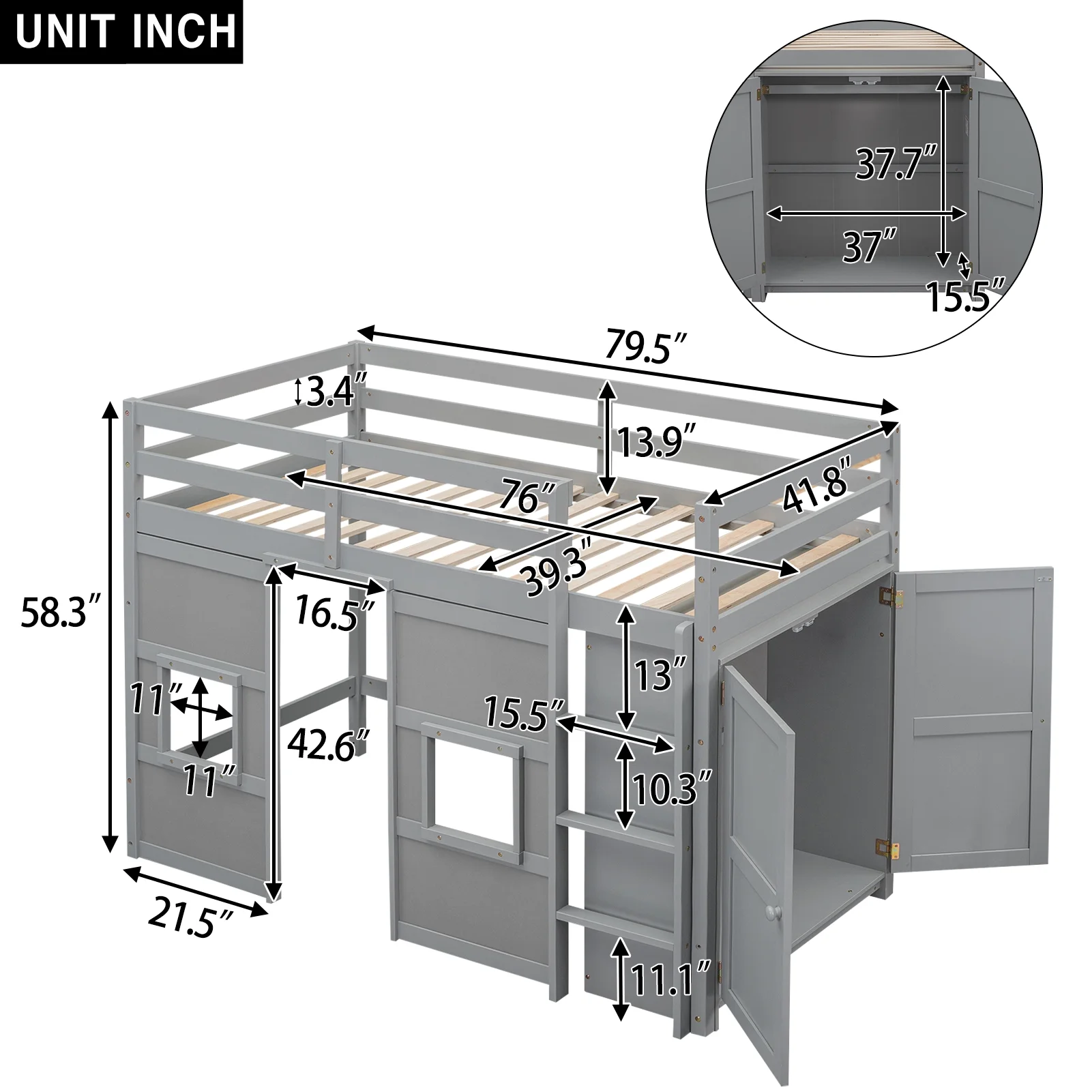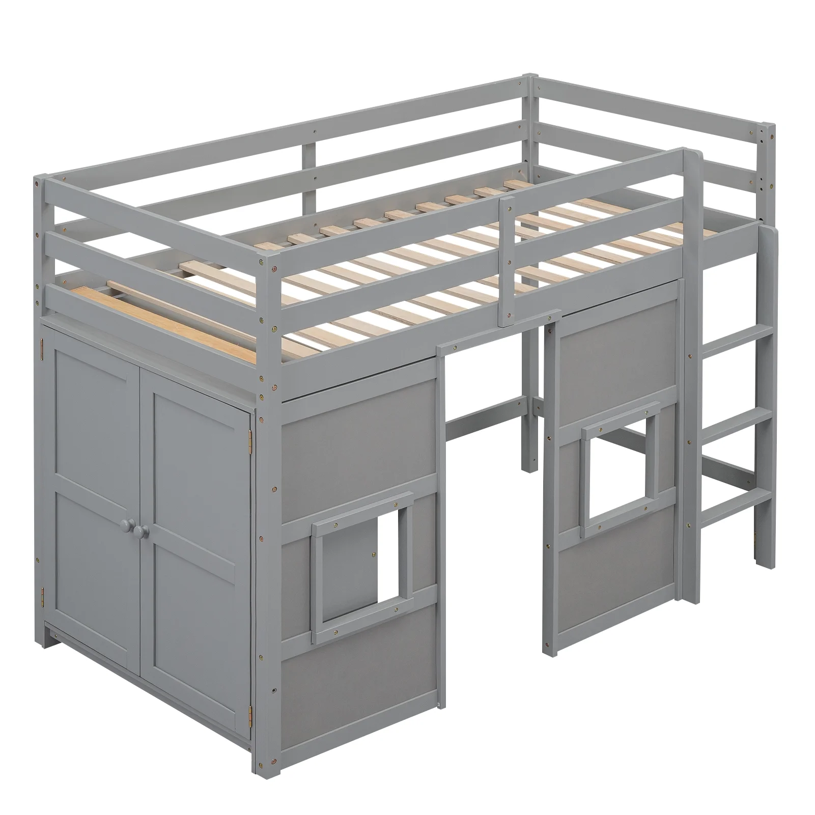 House Bunk Bed Over , Kids Bunk Beds With Roof And Windows, Wood Low Bunk Beds For Girls Boys,No Box Spring Needed,Grey