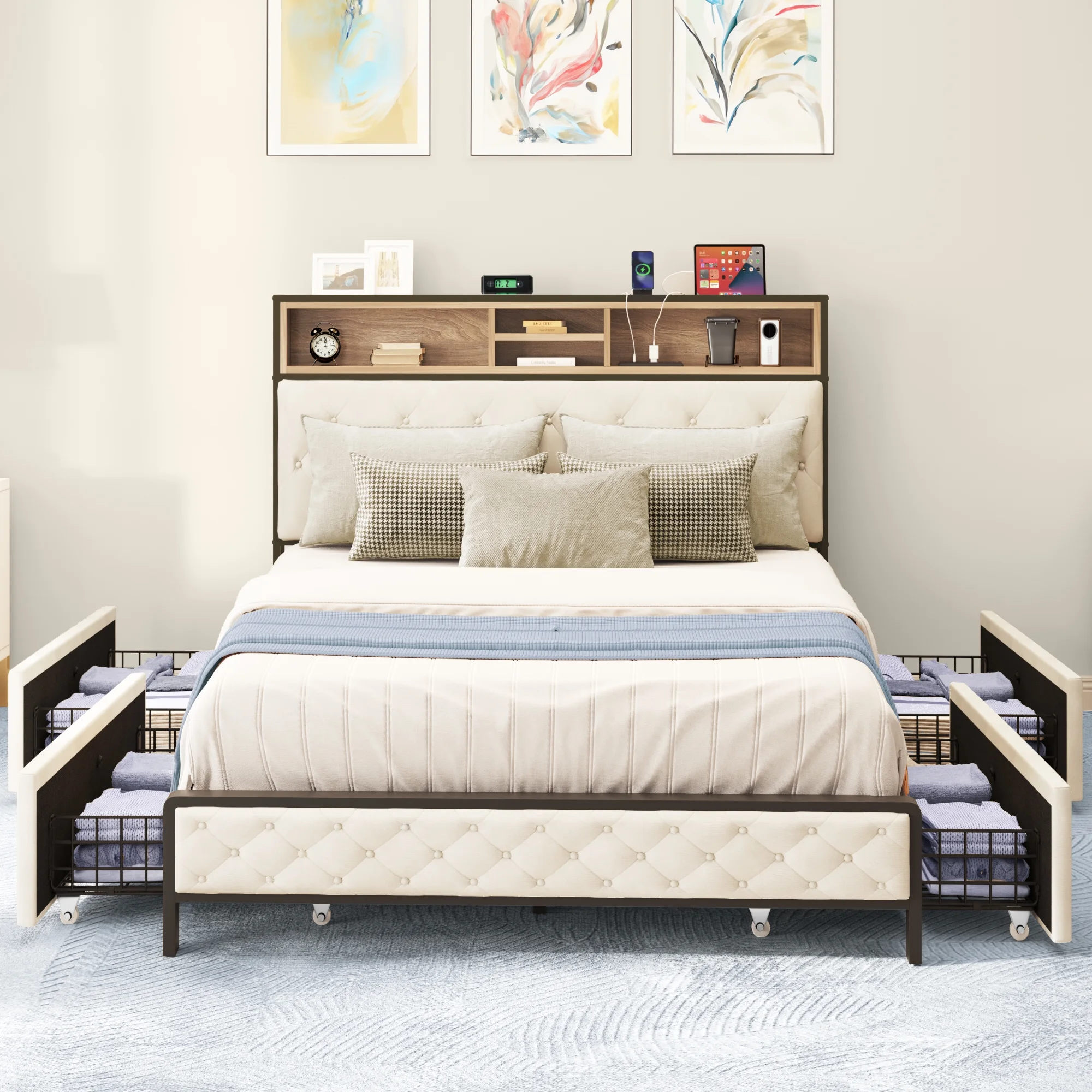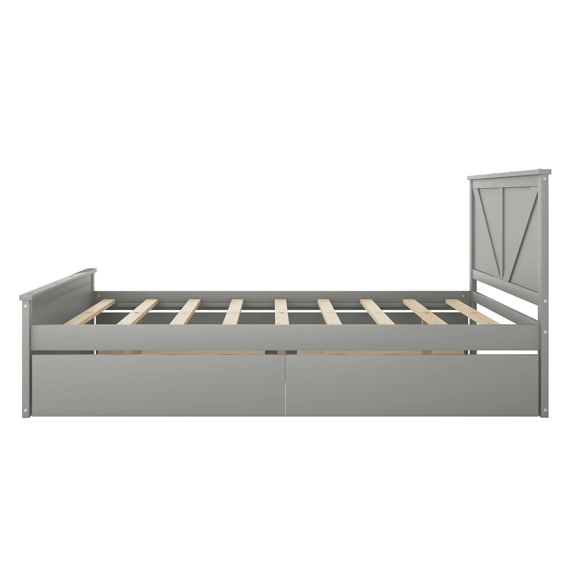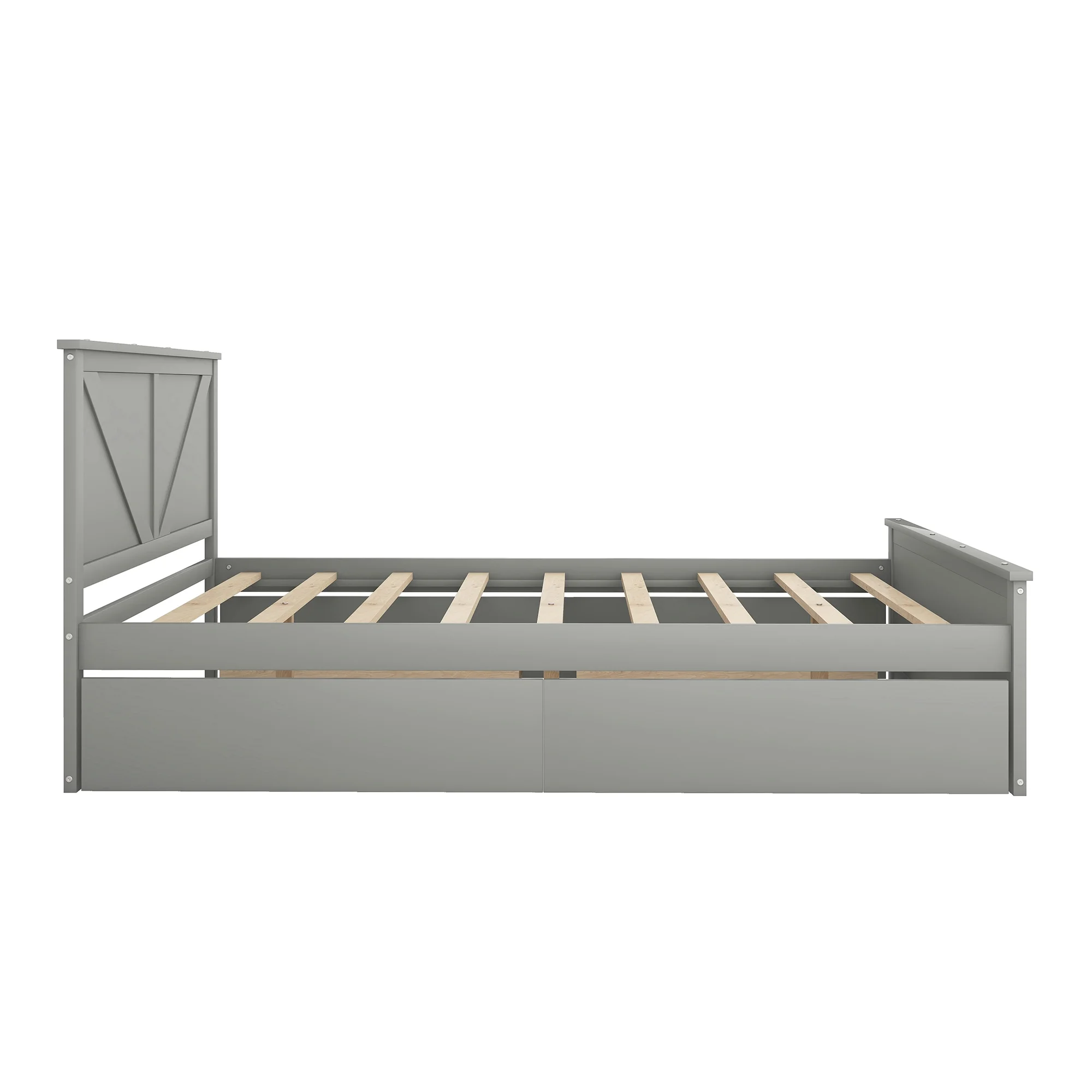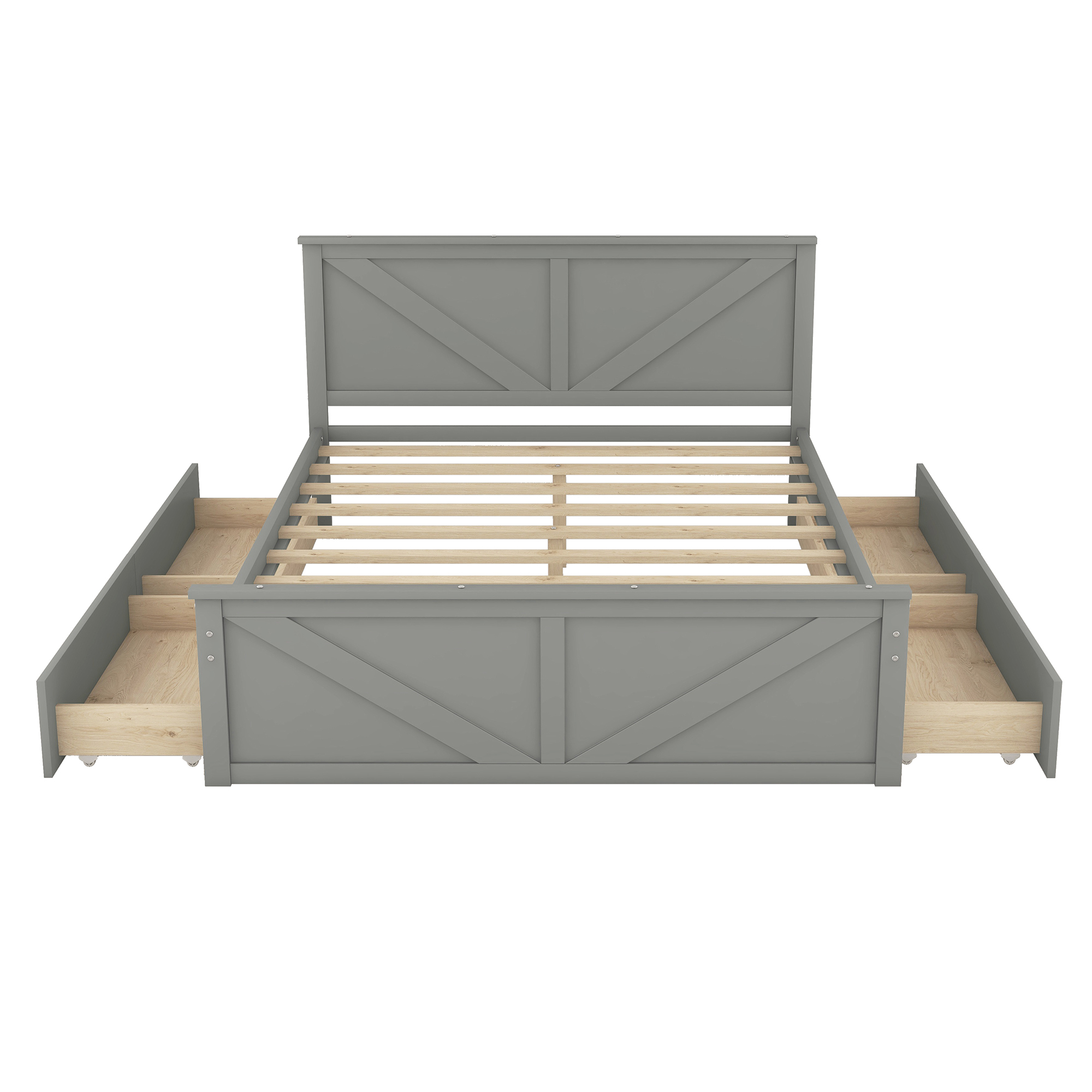 Queen Size Wooden Platform Bed with Four Storage Drawers and Support Legs, Gray
