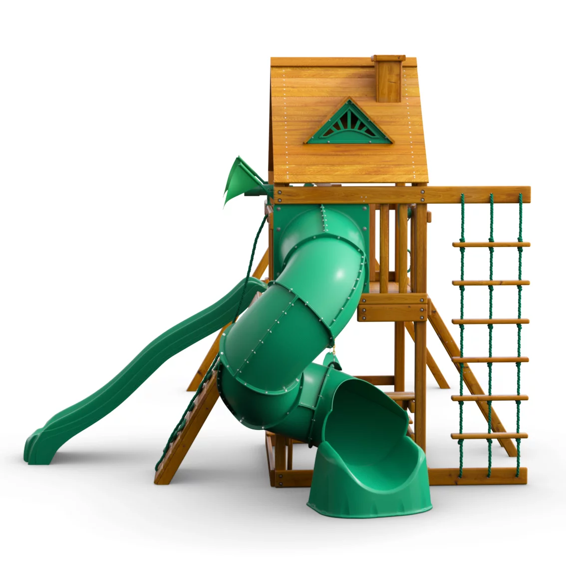 Gorilla Playsets Mountaineer Wooden Swing Set with Wood Roof, Extreme Tube Slide, and Built-in Picnic Table