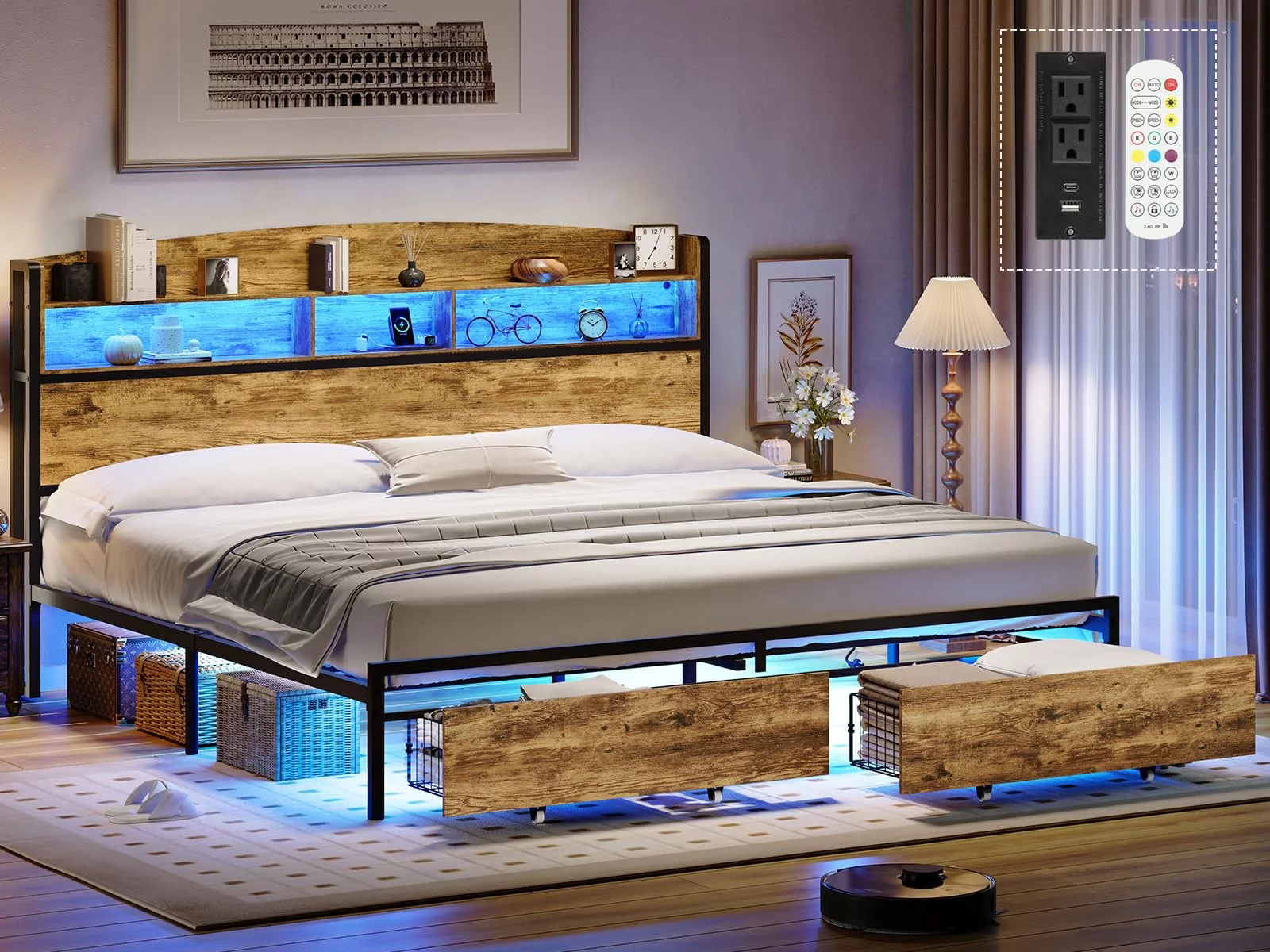 Traditional Style Eastern King Size Bed Dark Walnut Finish Bedroom Furniture Solid wood Floral Design HB Sturdy Bed Posts