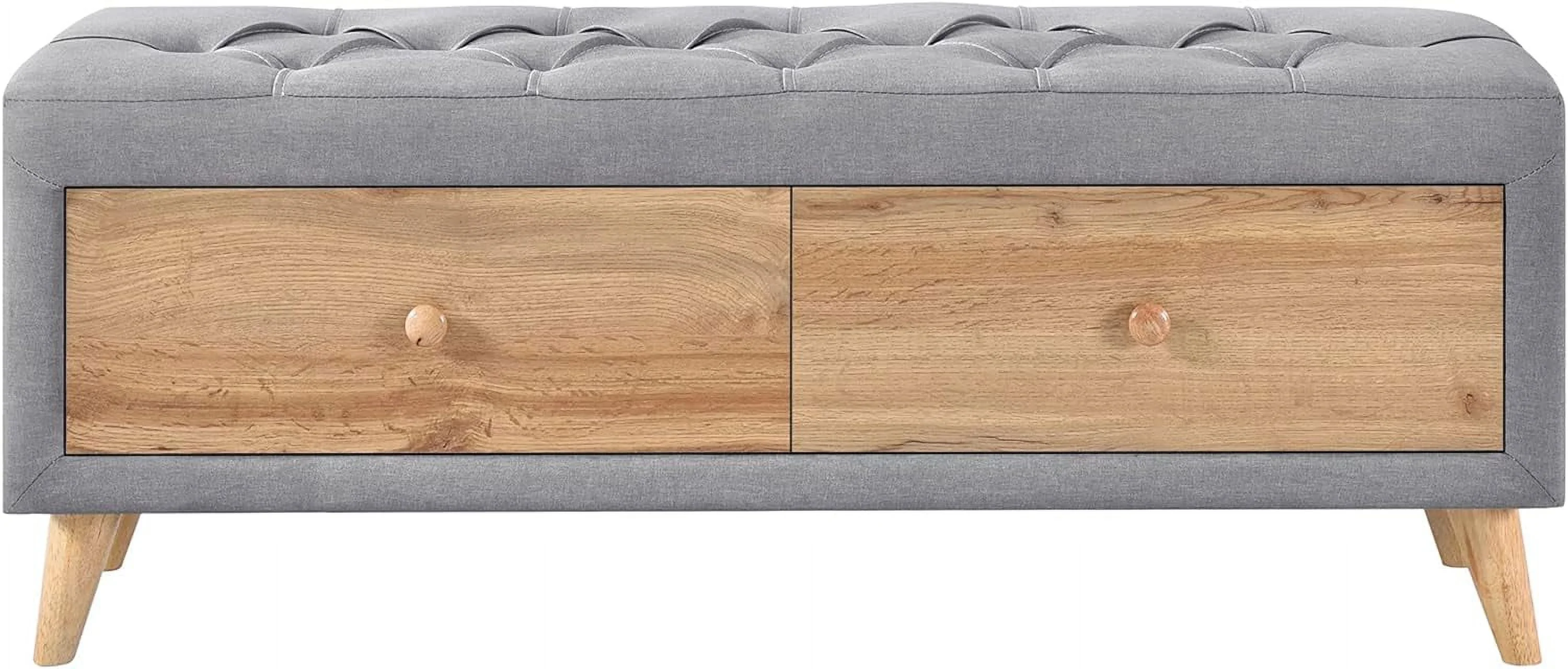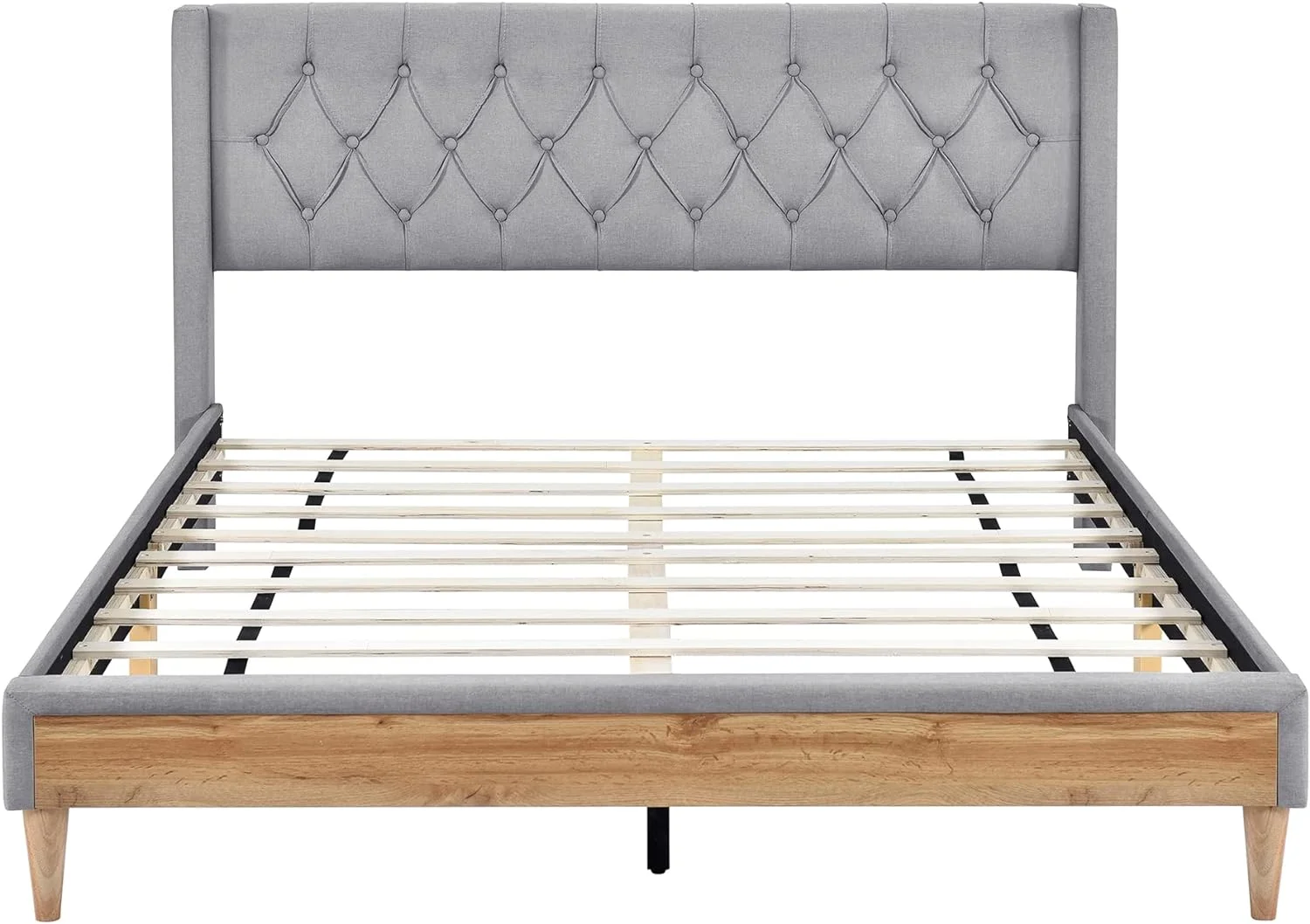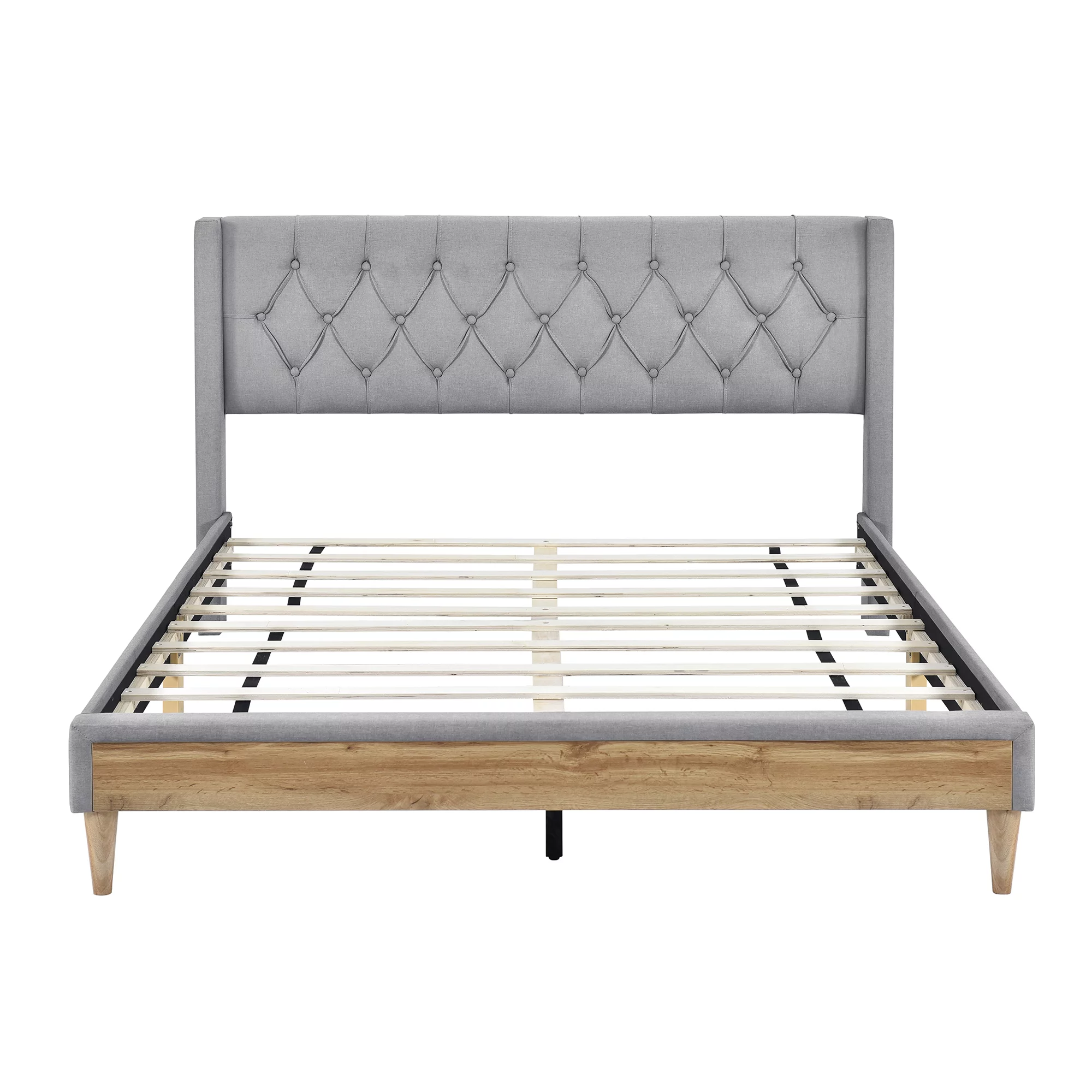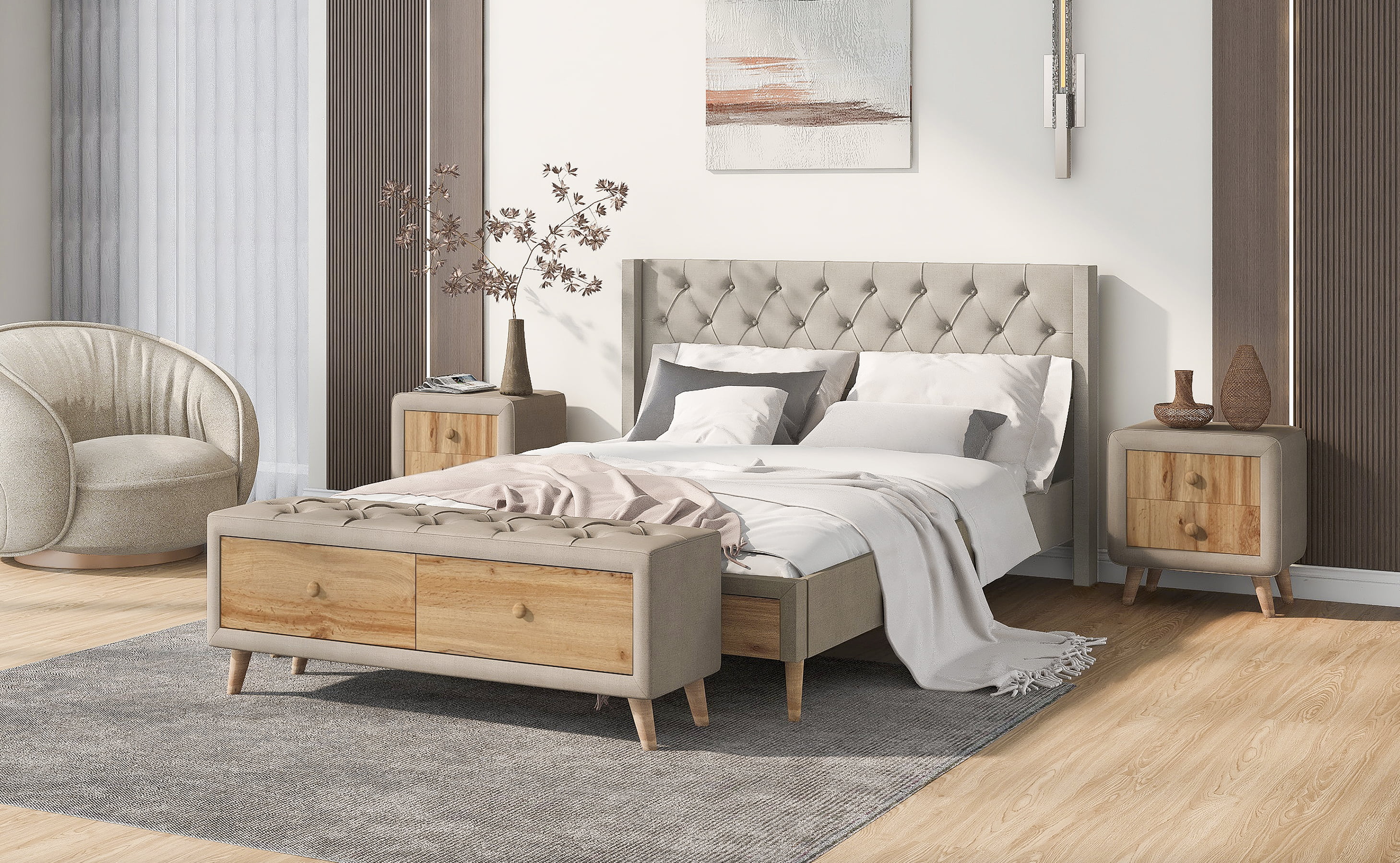 Royard Oaktree 4-Pieces Bedroom Sets Queen Size Upholstered Platform Bed with Two Nightstands and Storage Bench, Gray