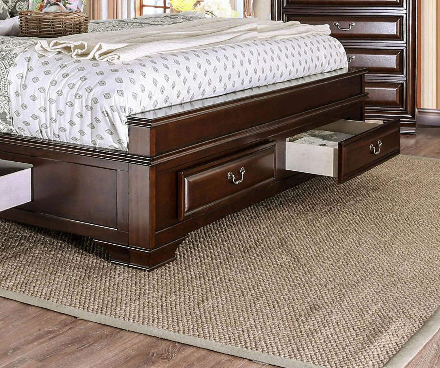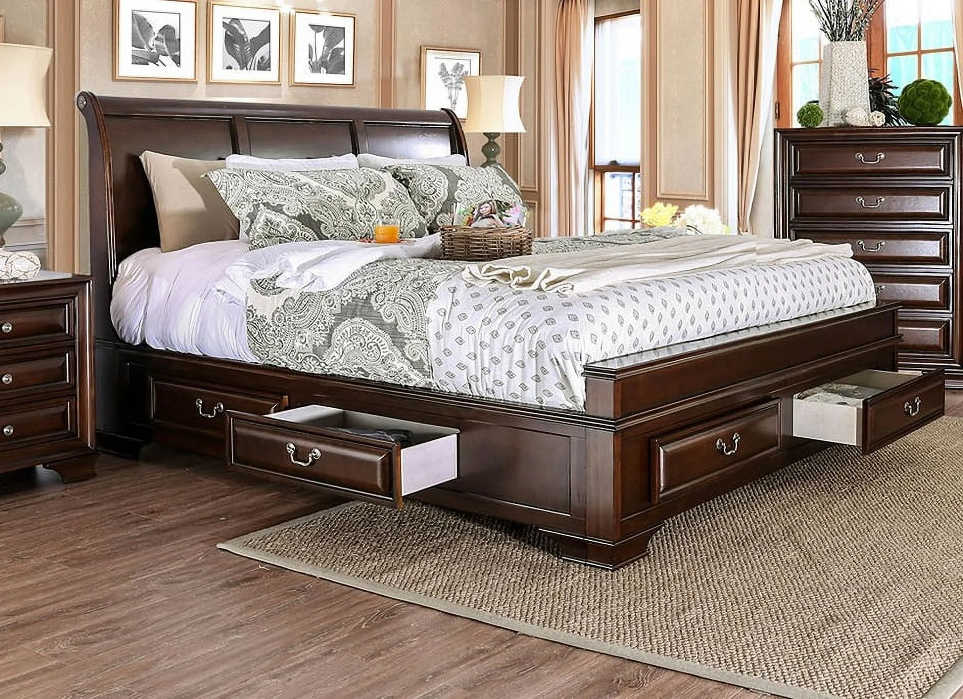 Brown Cherry Storage Queen Size Bed 1pc Set Bedroom Furniture Solid wood Rail Drawers Wood inlay Nickel Pulls Storage Drawers Bed