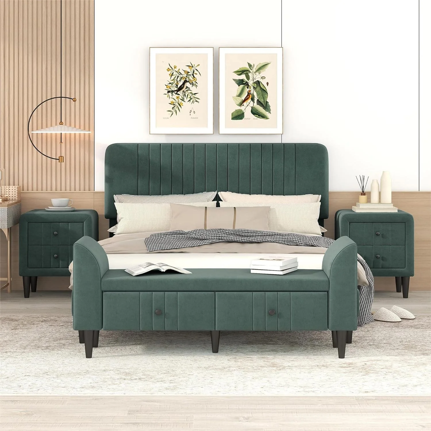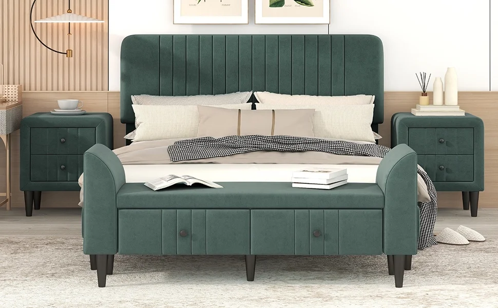 CoSoTower 4-Pieces Bedroom Sets Queen Size Upholstered Platform Bed with Two Nightstands and Storage Bench-Green