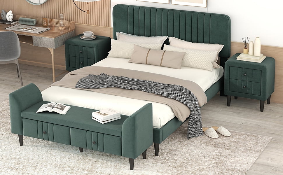 Bedroom Furniture Sets, 4-Pieces Bedroom Sets, Queen Size Upholstered Platform Bed With 2 Nightstands And Storage Bench, Green