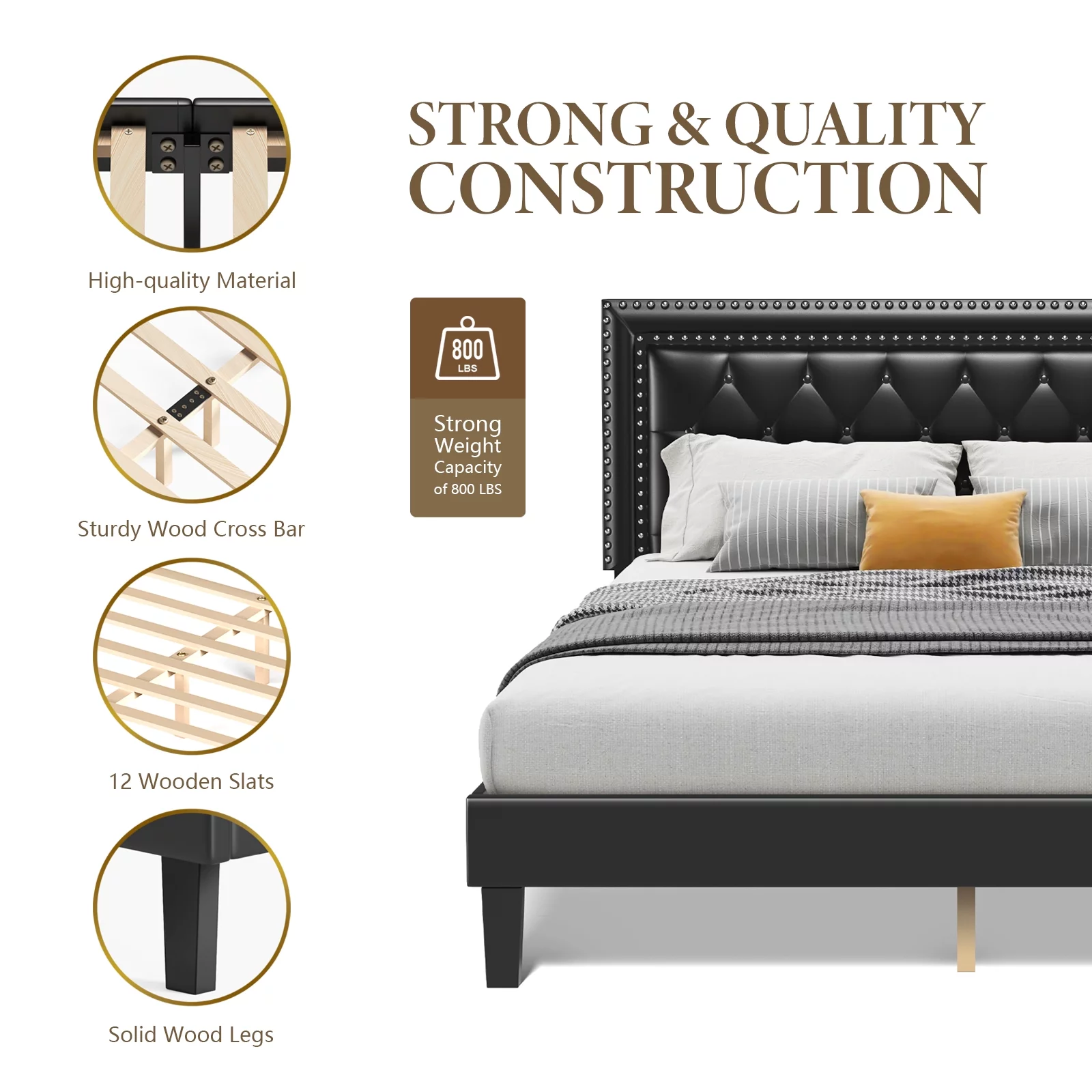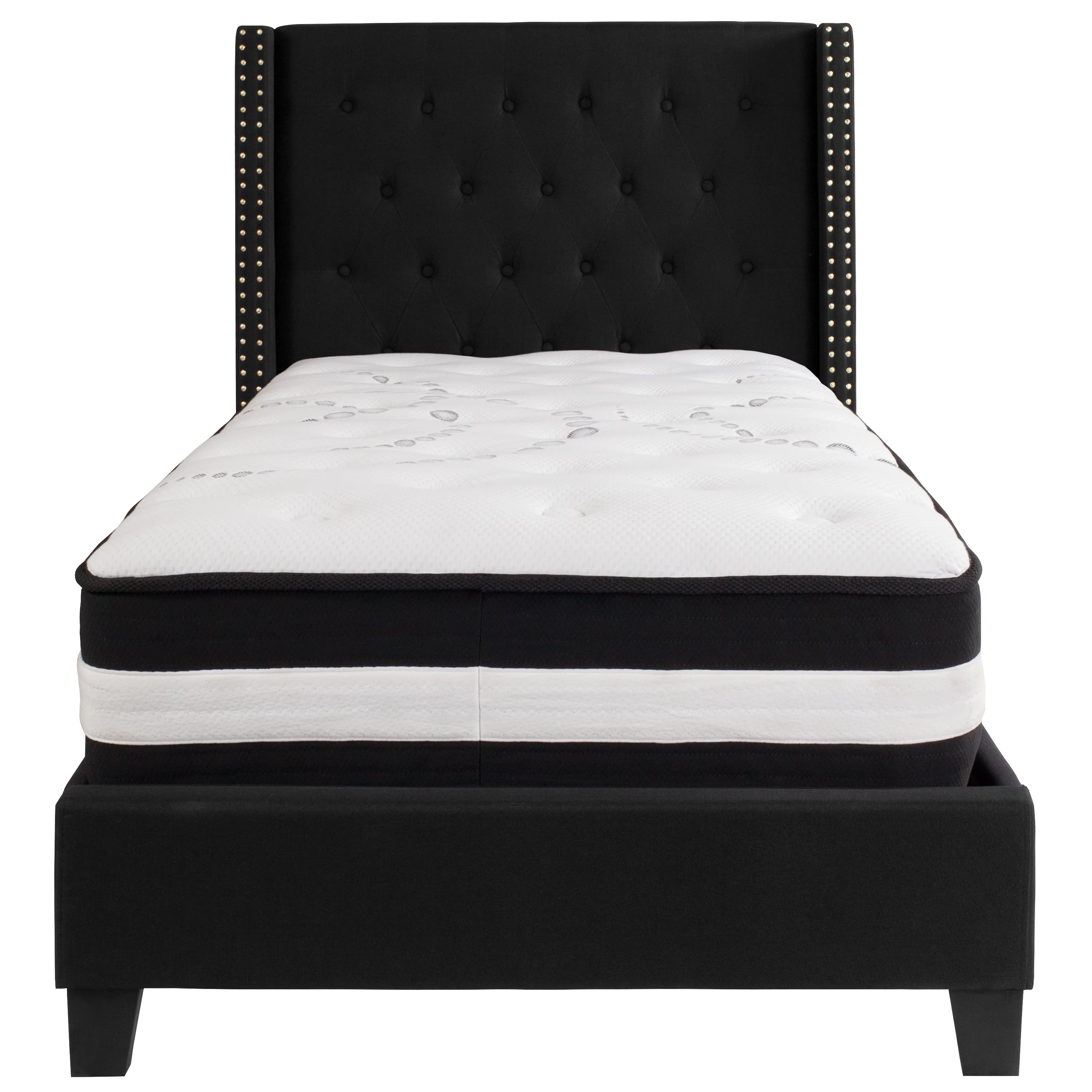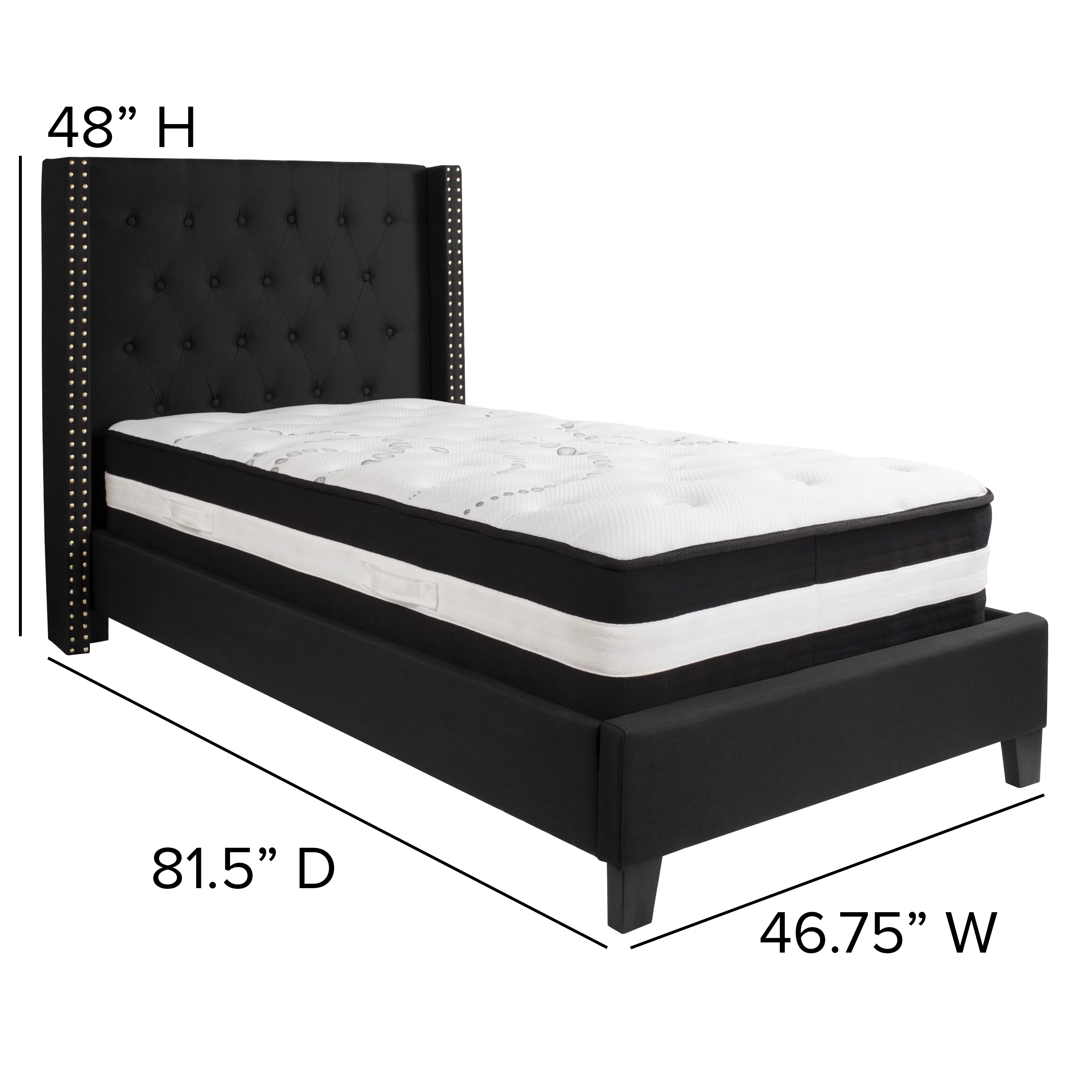 BizChair Twin Size Tufted Upholstered Platform Bed with Accent Nail Trimmed Extended Sides in Black Fabric with Mattress