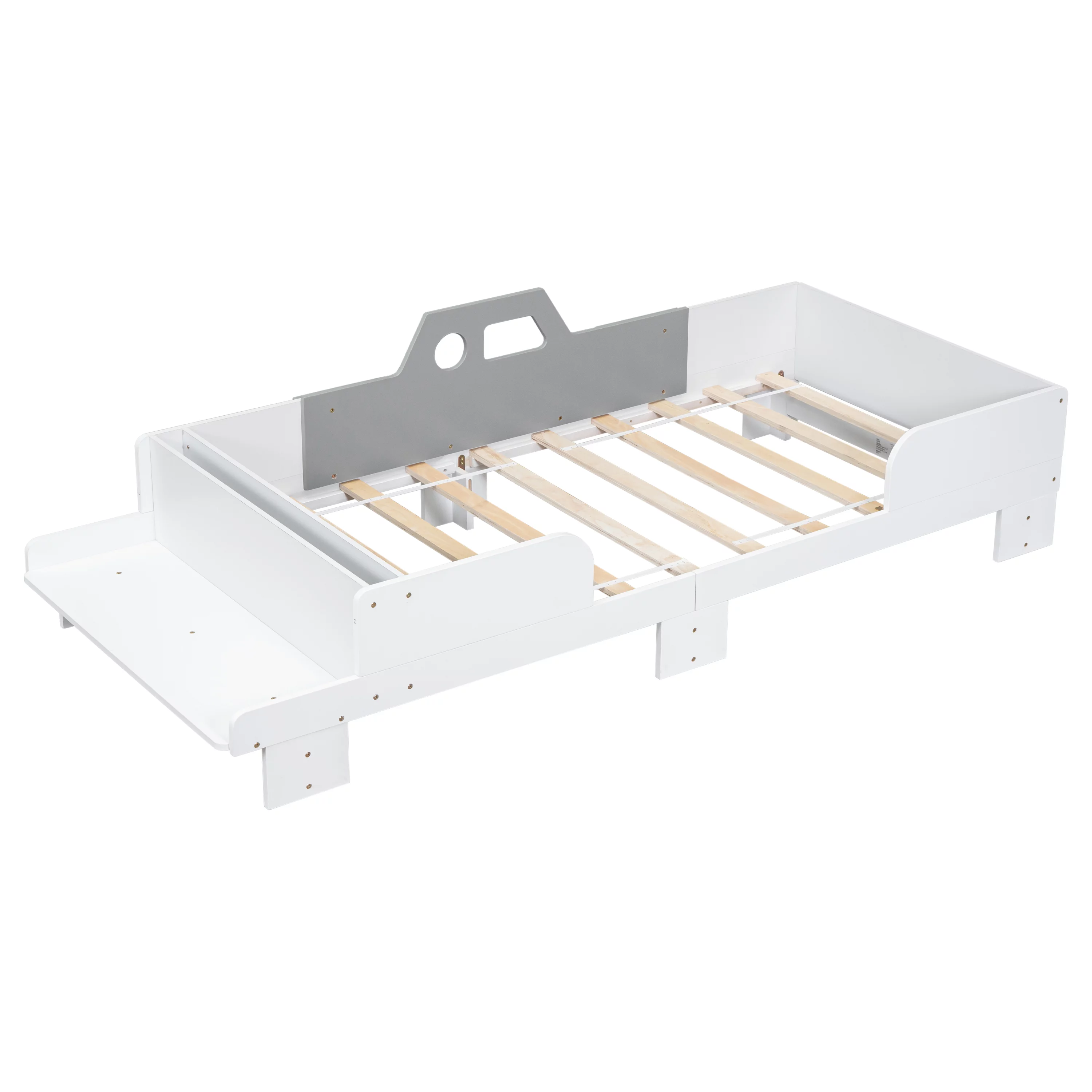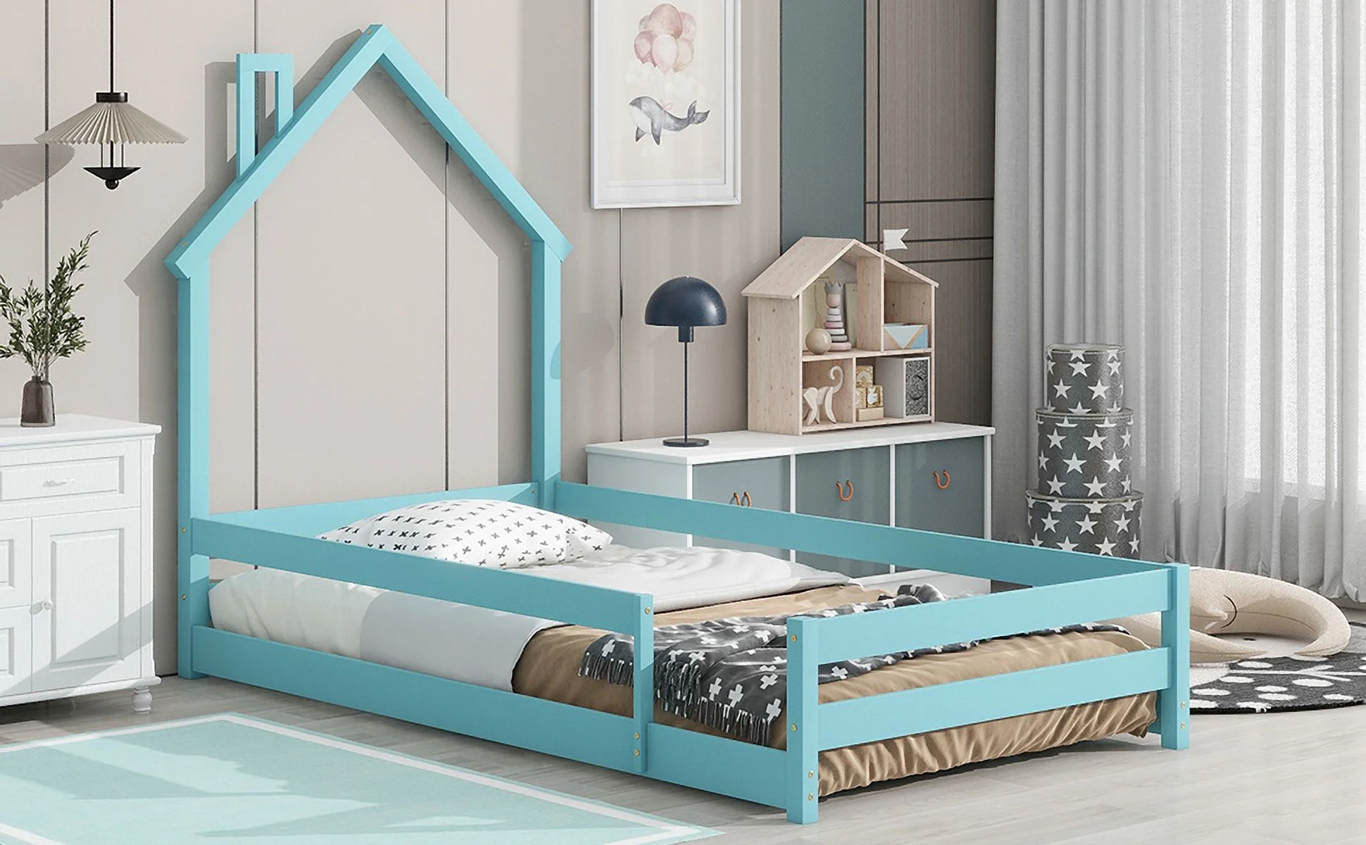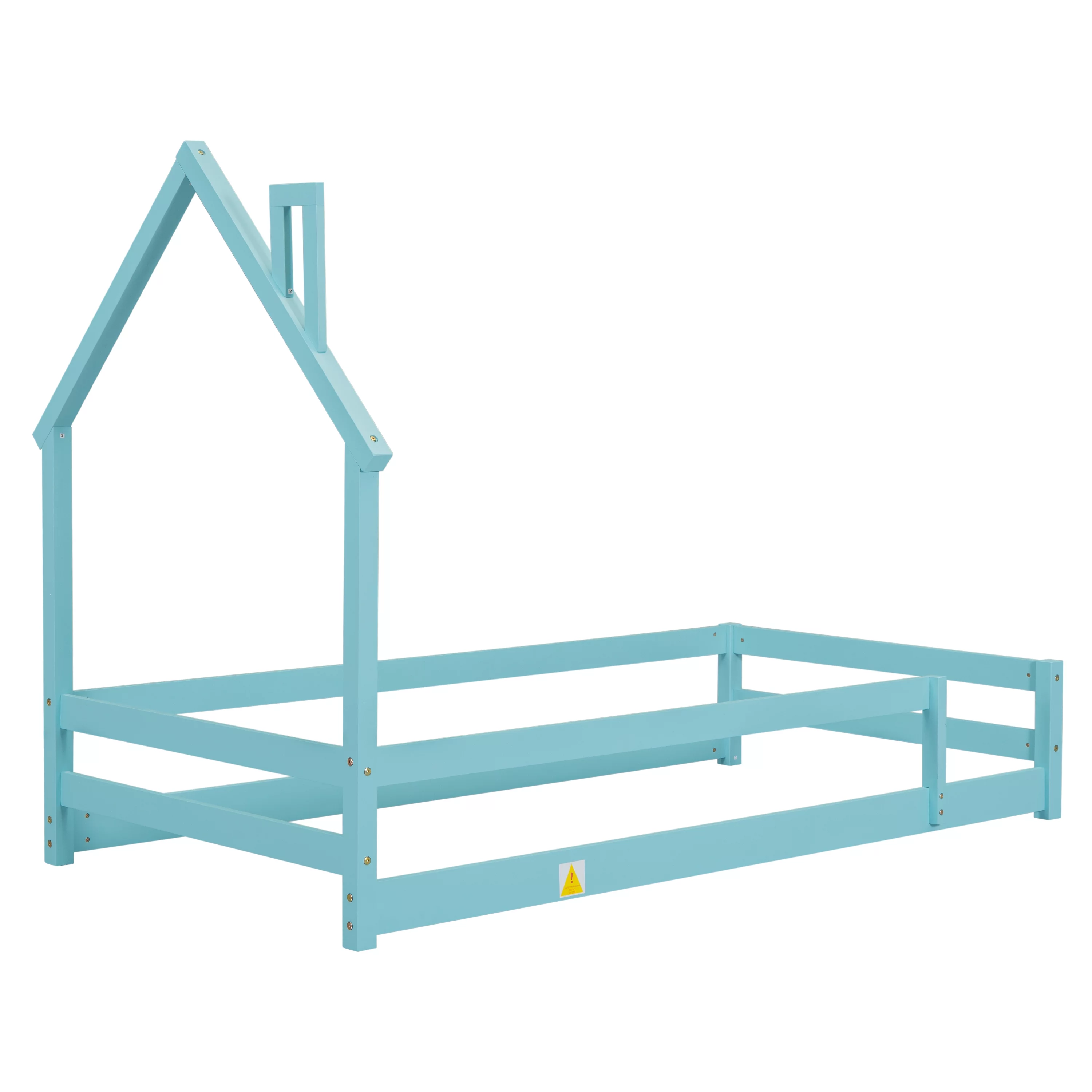 Child's cot ,Twin Size Wood bed with House-shaped Headboard Floor bed with Fences,Light Blue