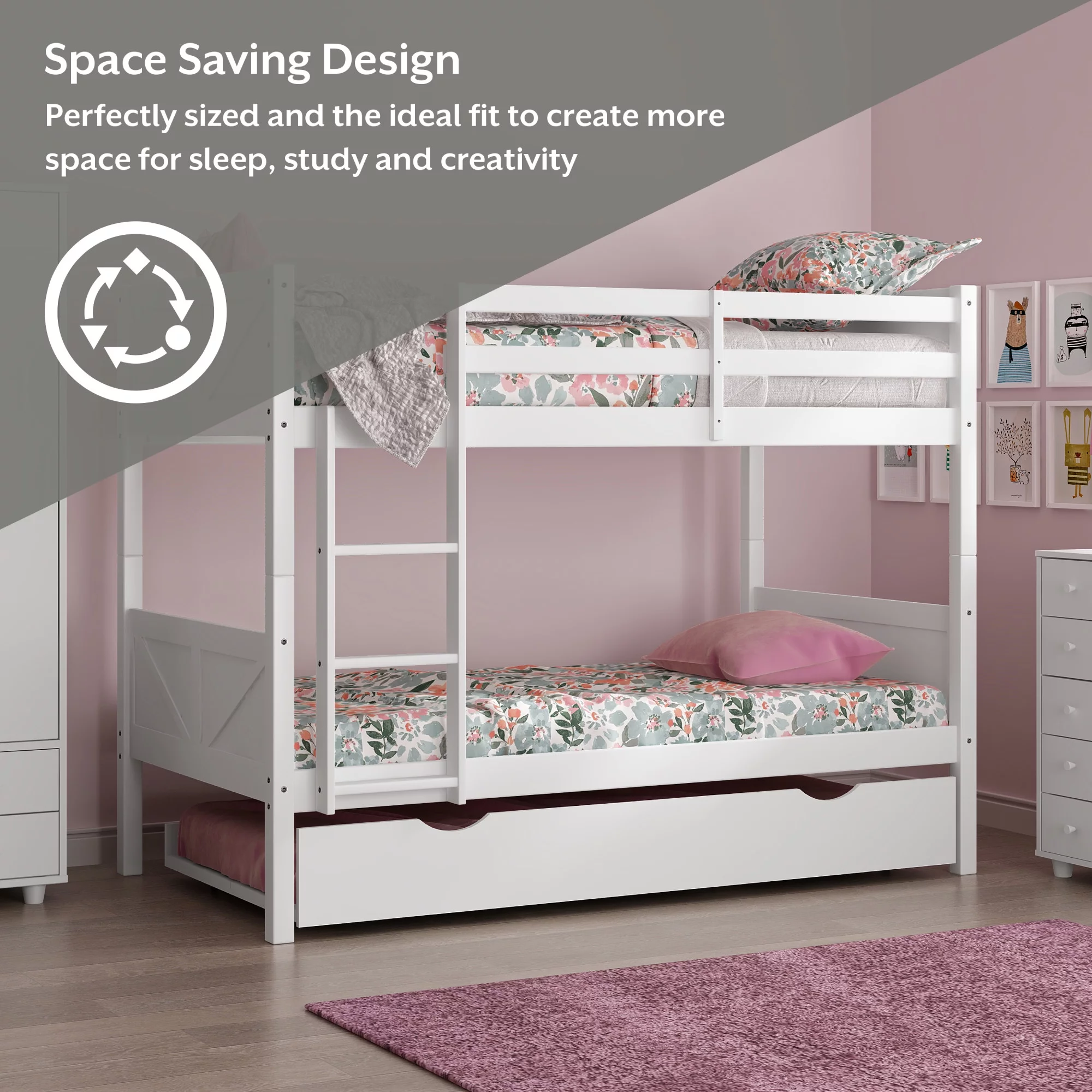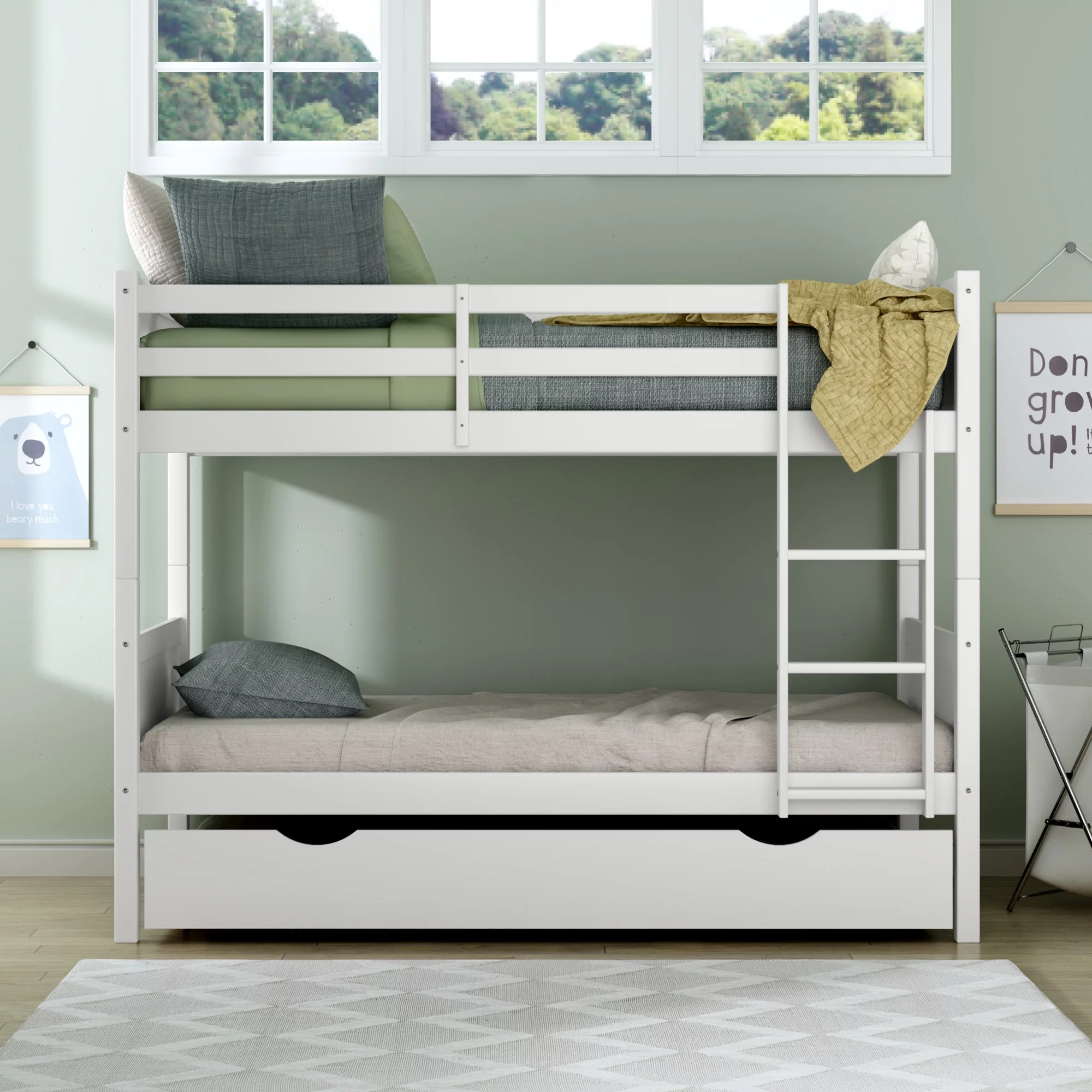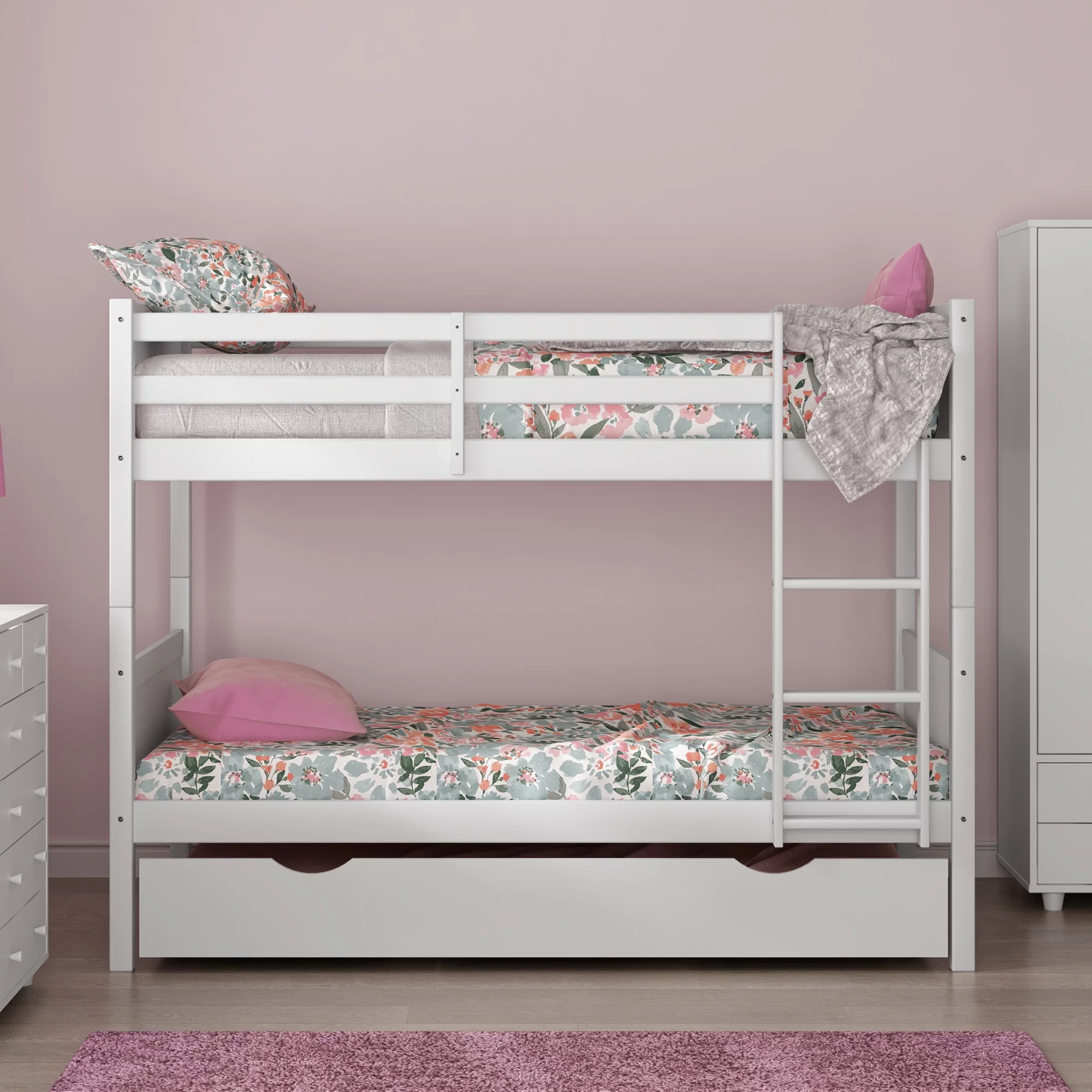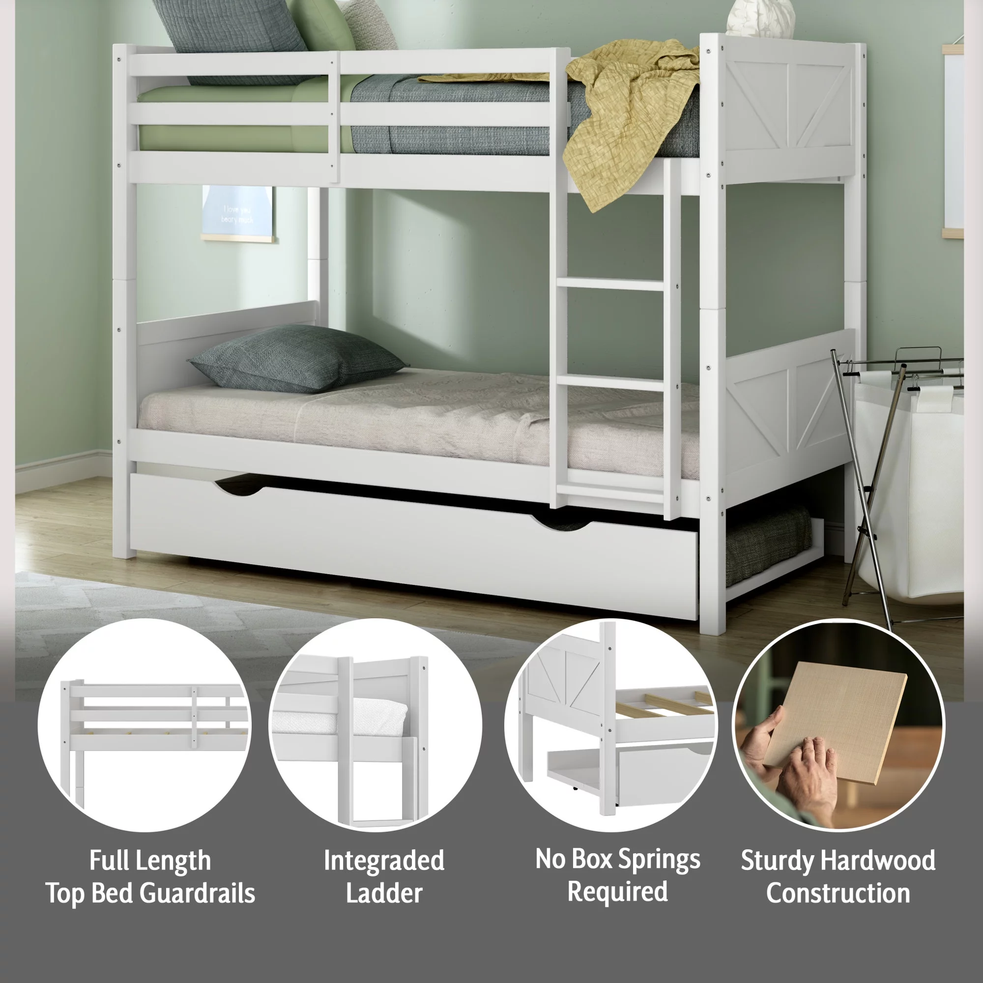 Rae Wood Twin Over Twin Bunk Bed with Trundle, White, by Hillsdale Living Essentials