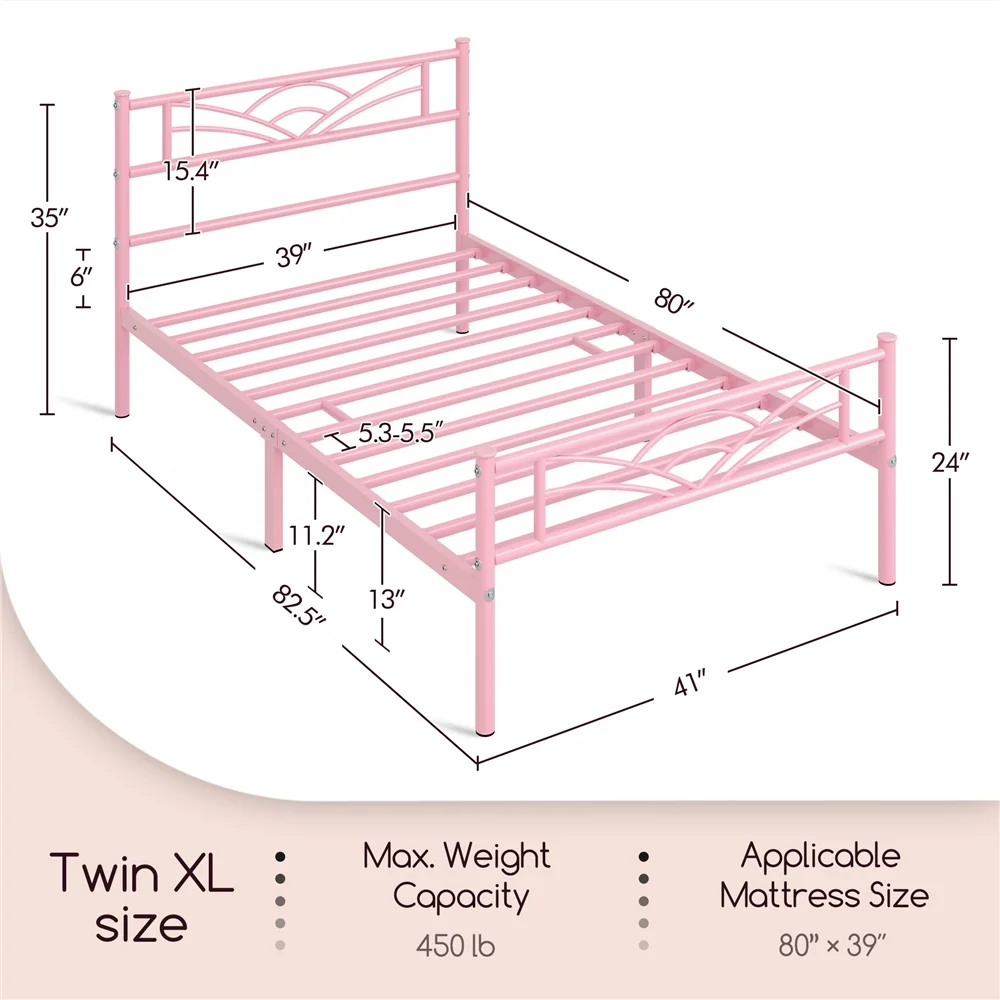 Smile Mart Metal Platform Bed with Vintage Headboard and Footboard, Twin XL, Pink