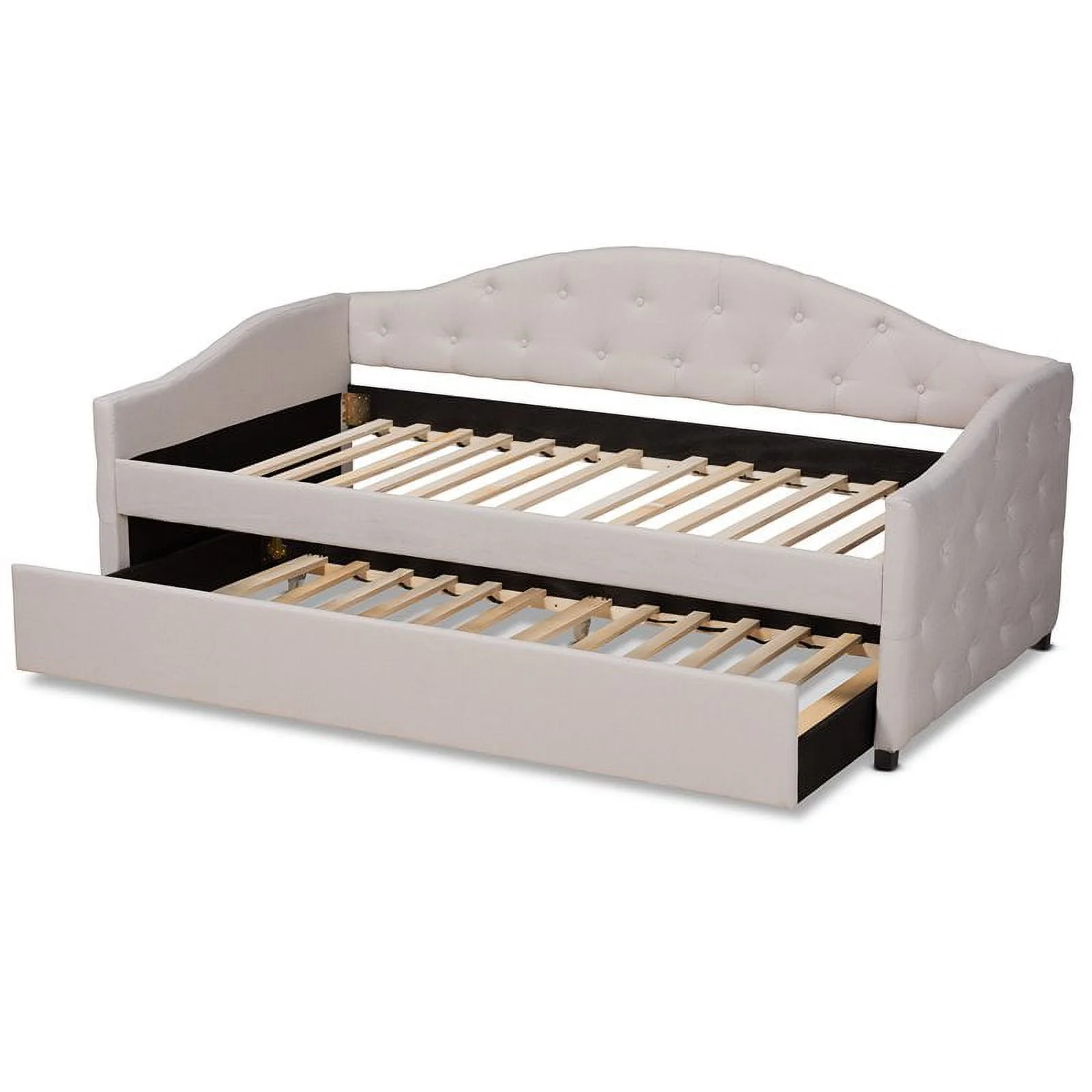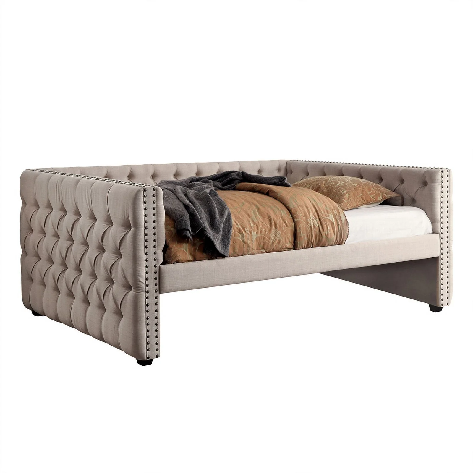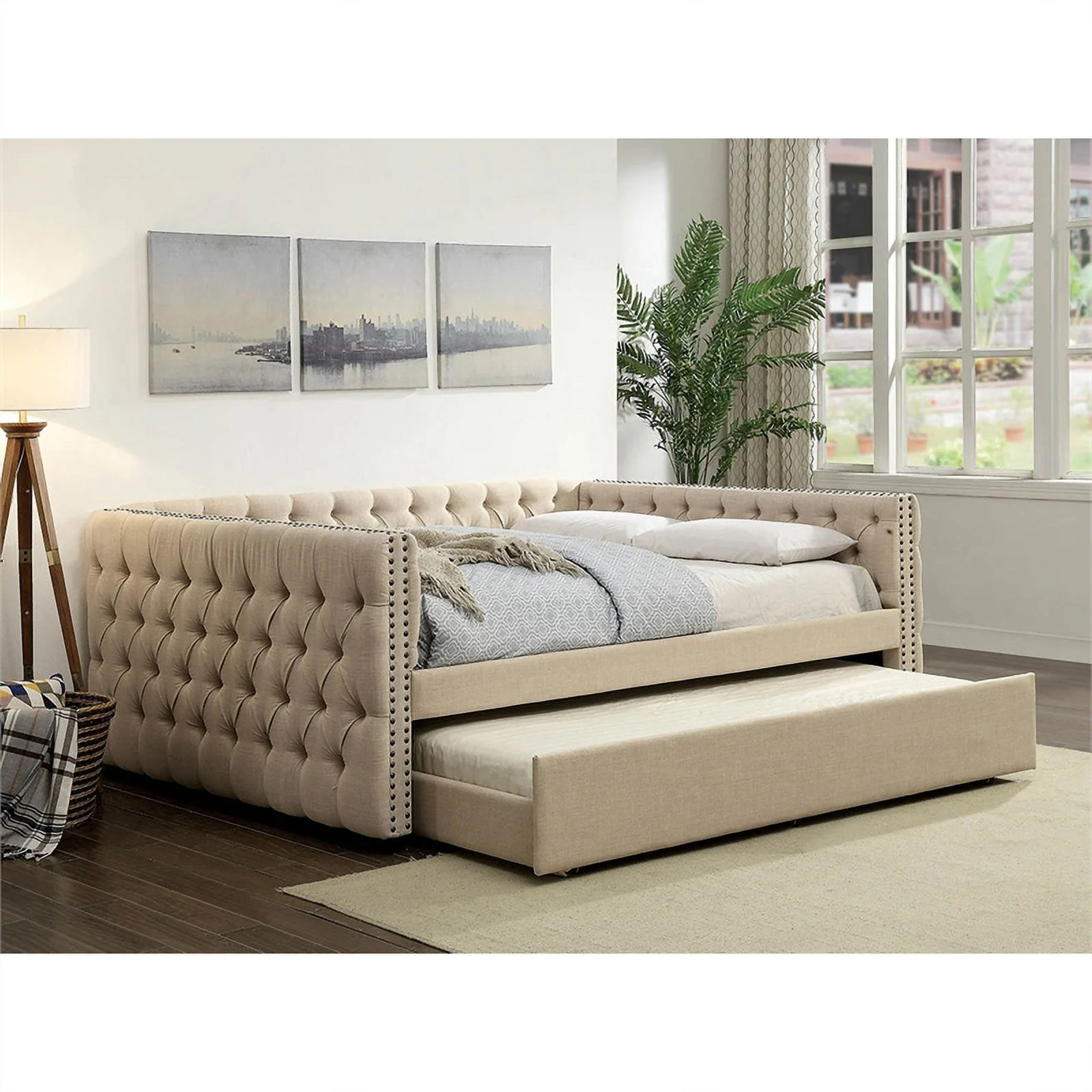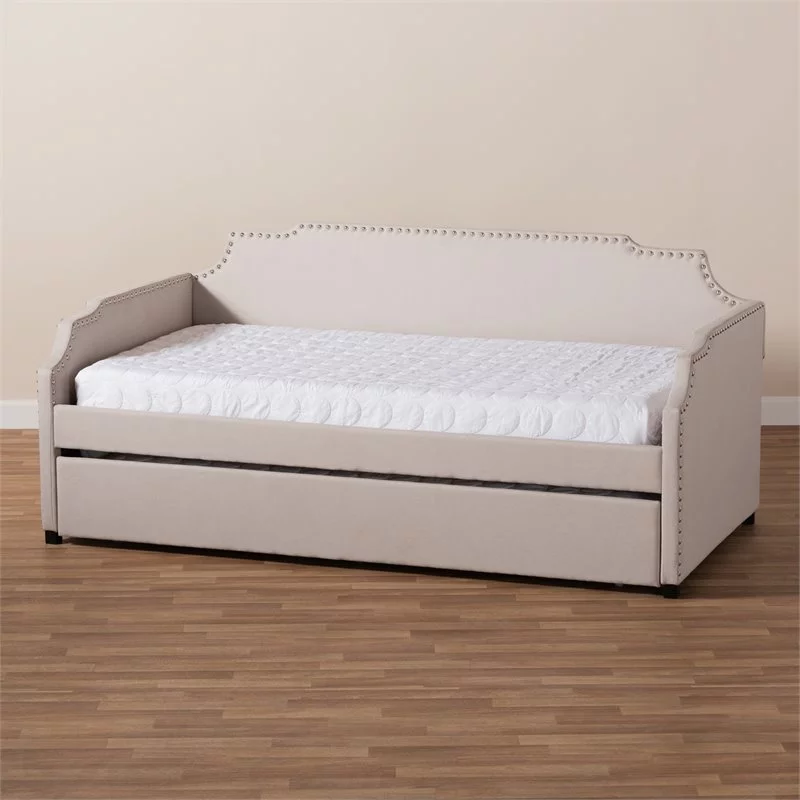 Bowery Hill Tufted Fabric with Nailhead Twin Daybed and Trundle in Trina Beige