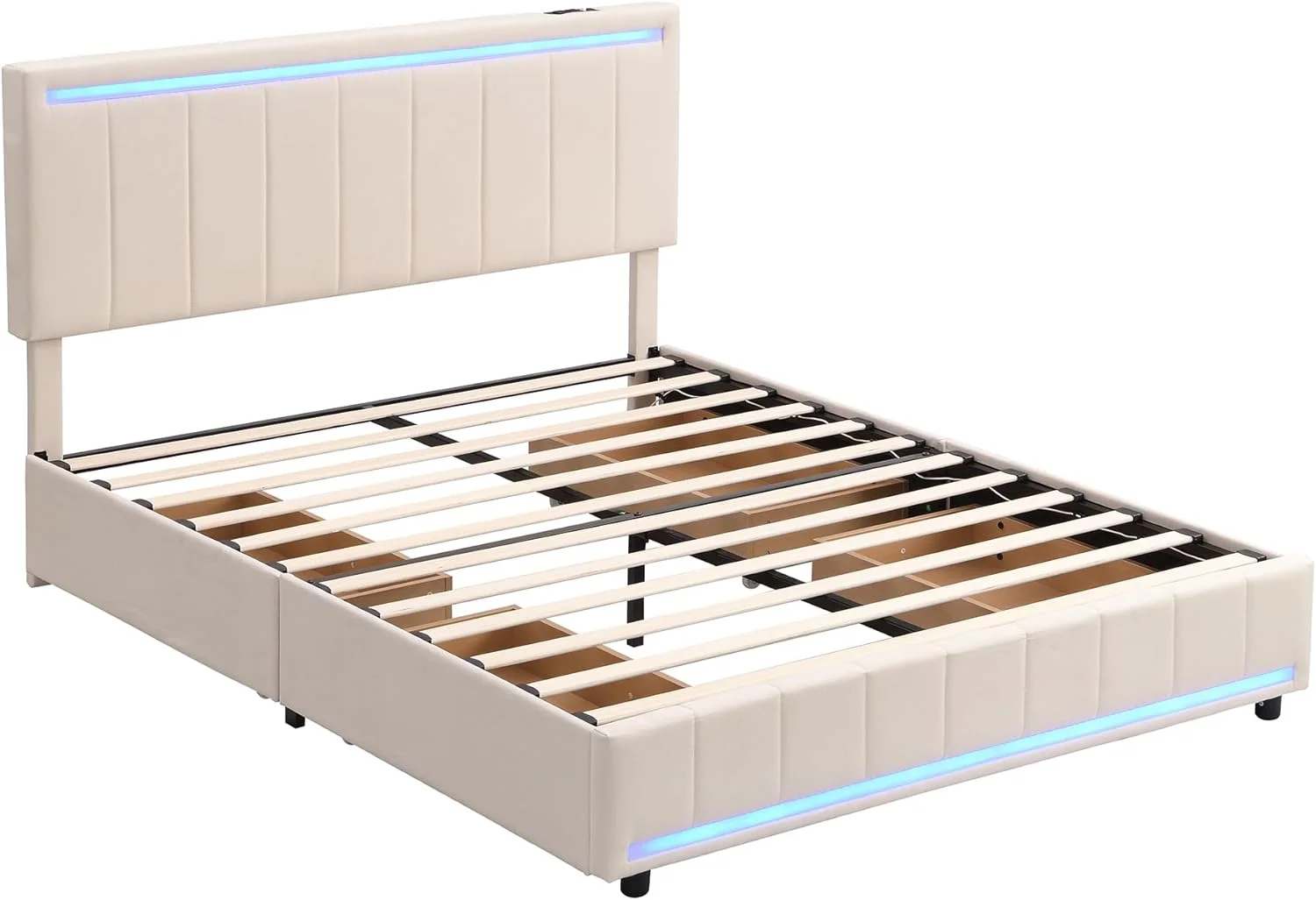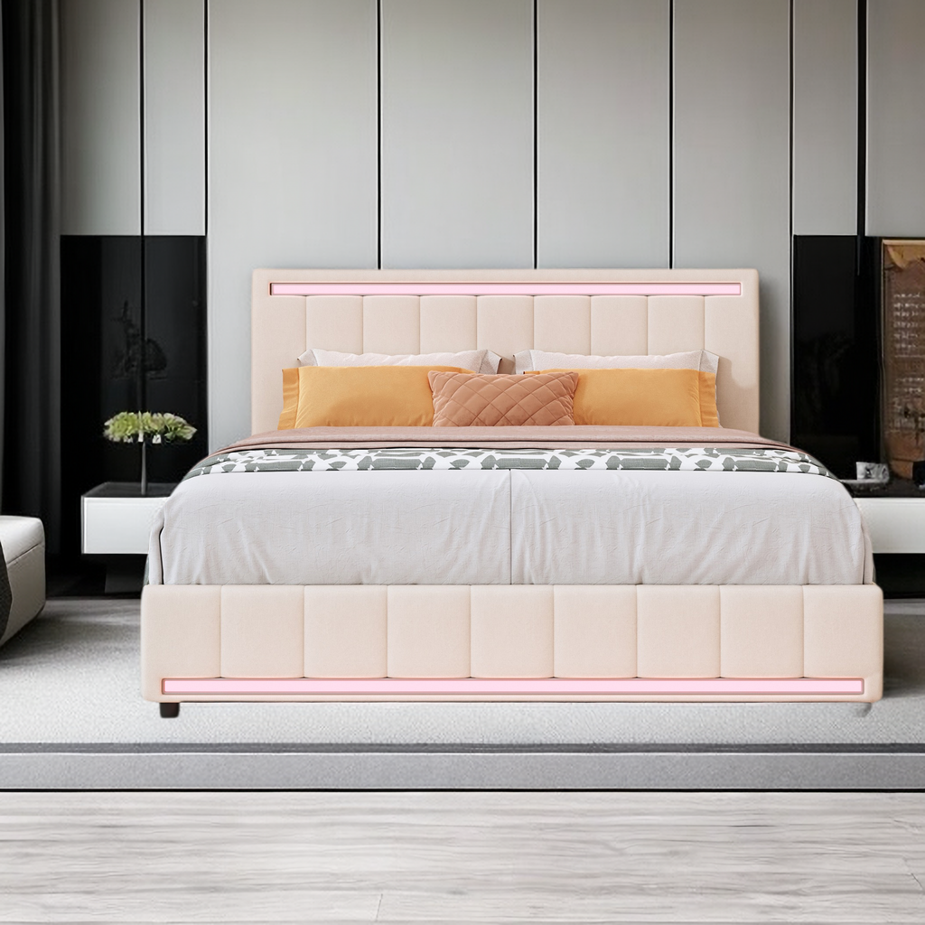 Queen Size Upholstered Platform Bed with LED Light and 4 Drawers, Linen Fabric Headboard w/A Set of Sockets & USB Ports