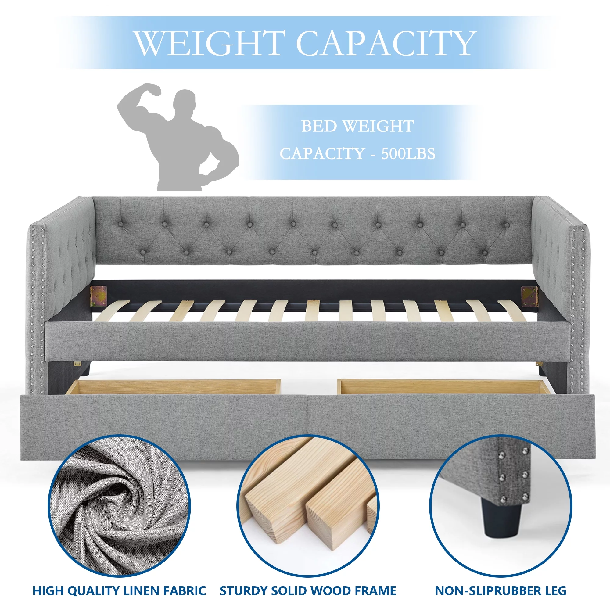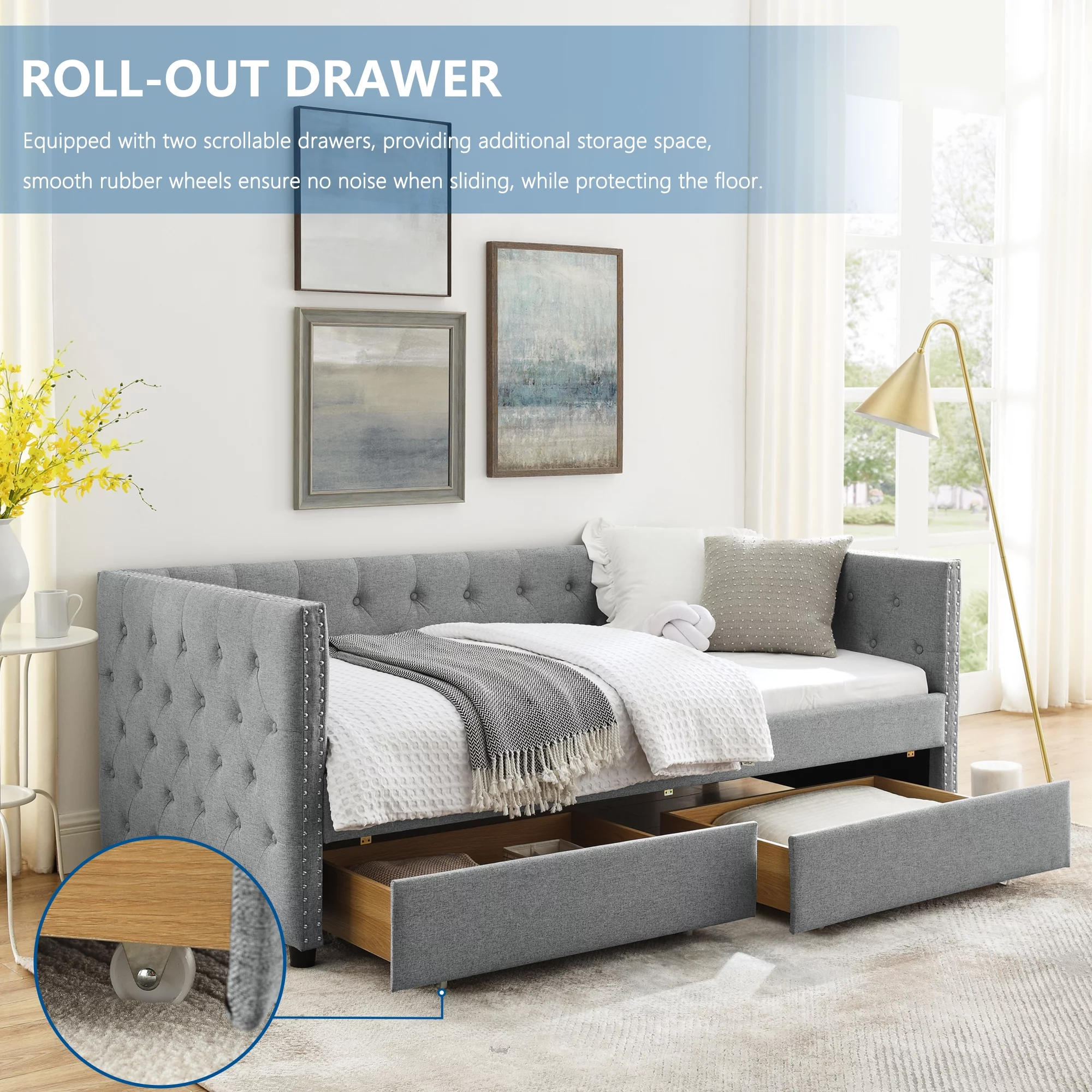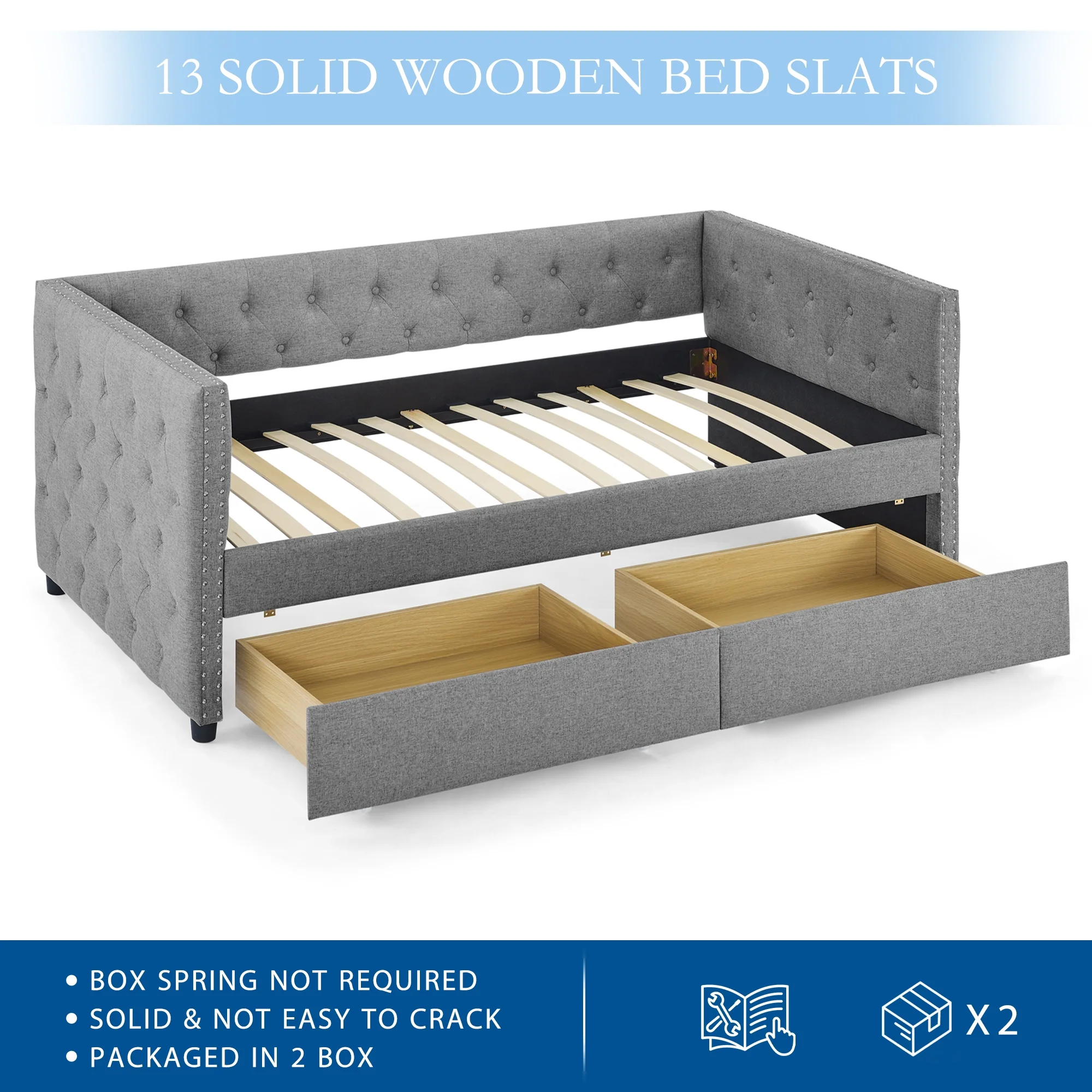 Muumblus Twin Size Daybed with Drawer, Upholstered Daybed with Button and Copper Nail, Gray