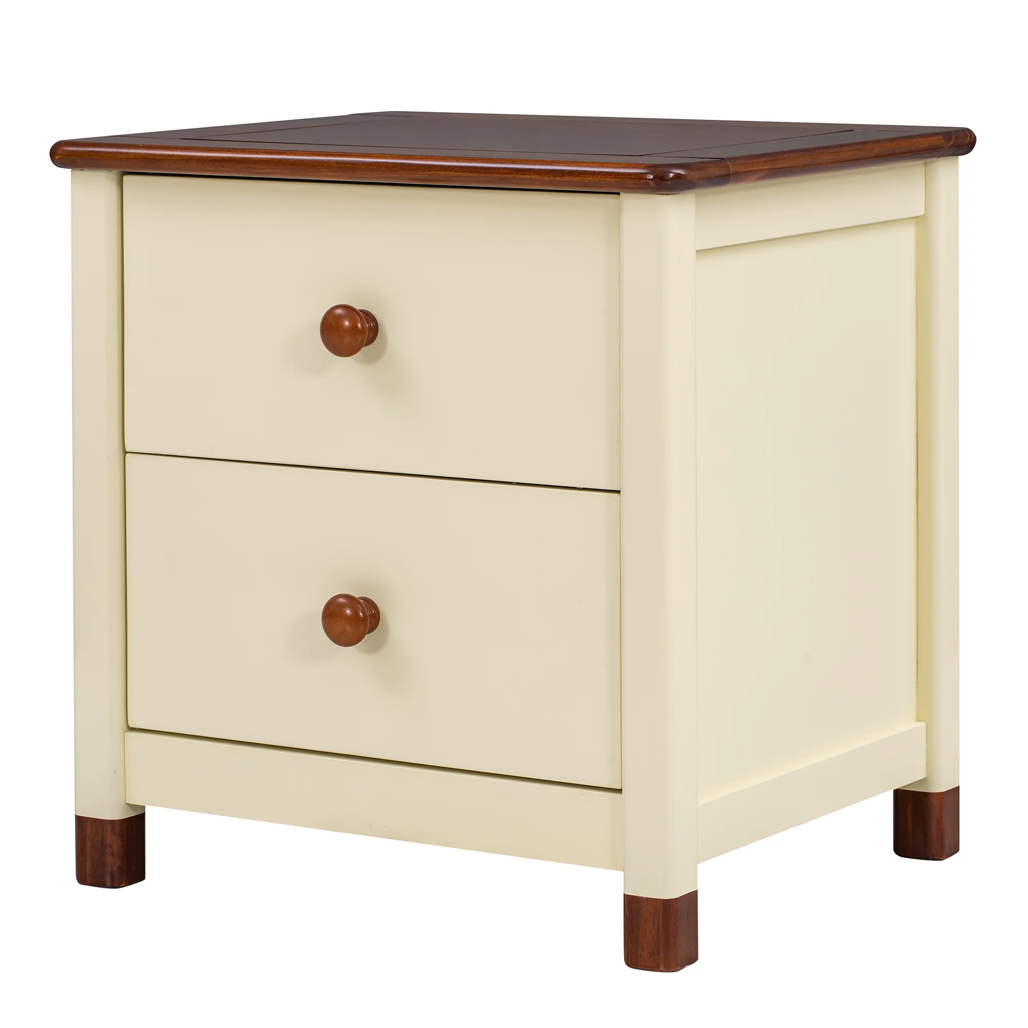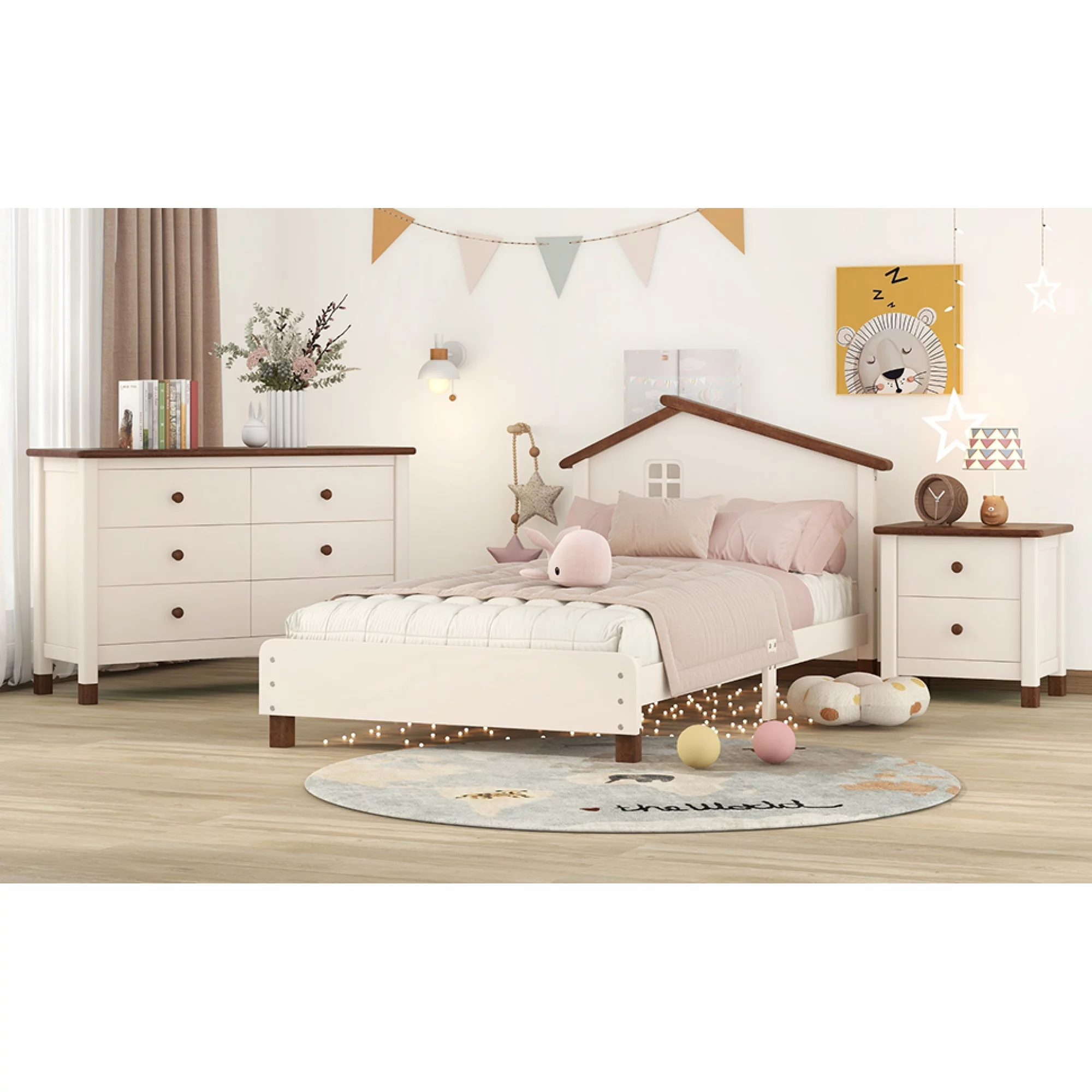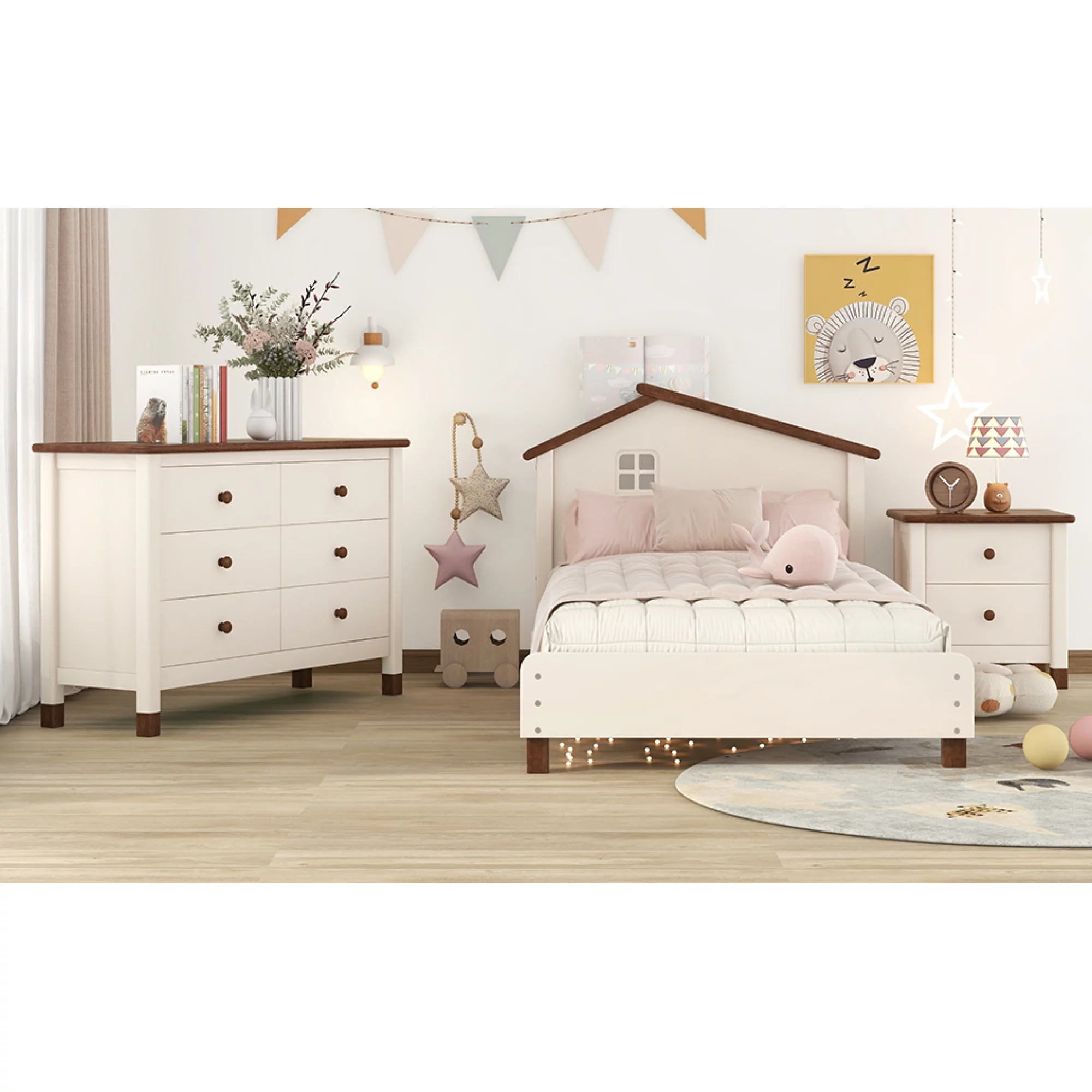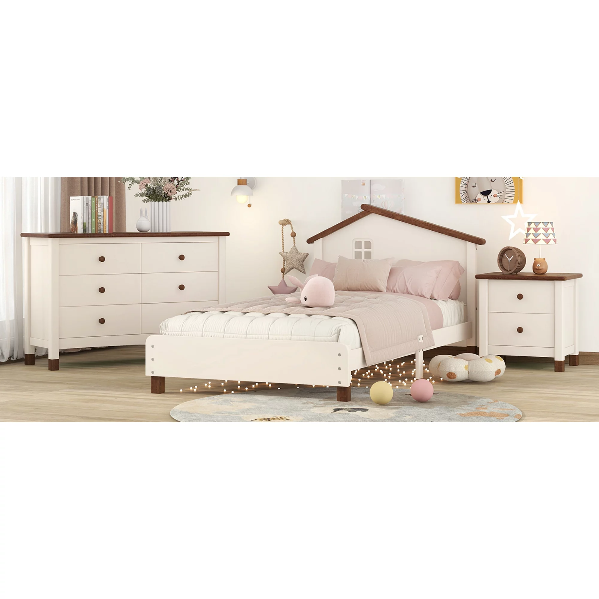 3-Pieces Bedroom Sets Twin Size Platform Bed with Nightstand and Storage dresser,Cream+Walnut
