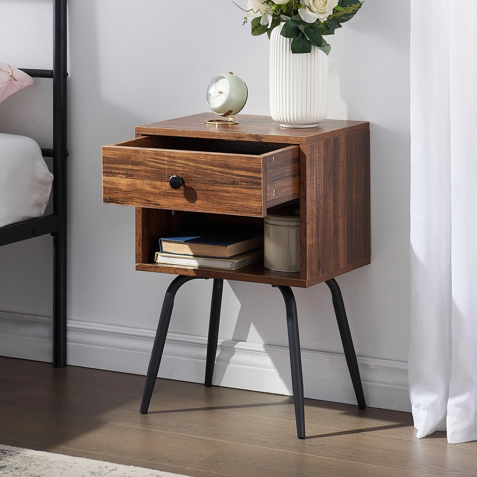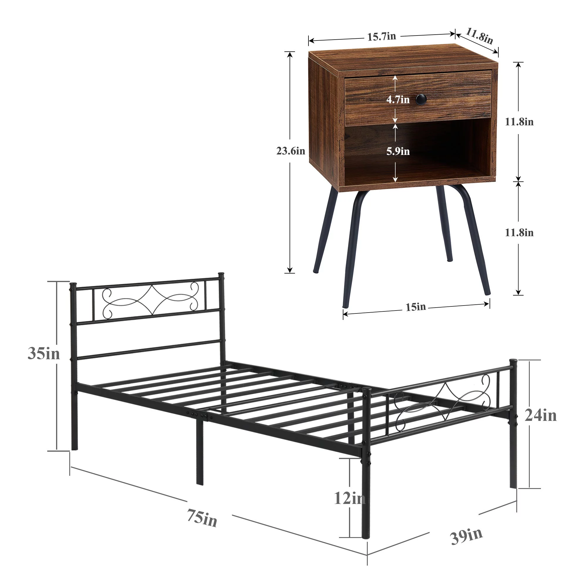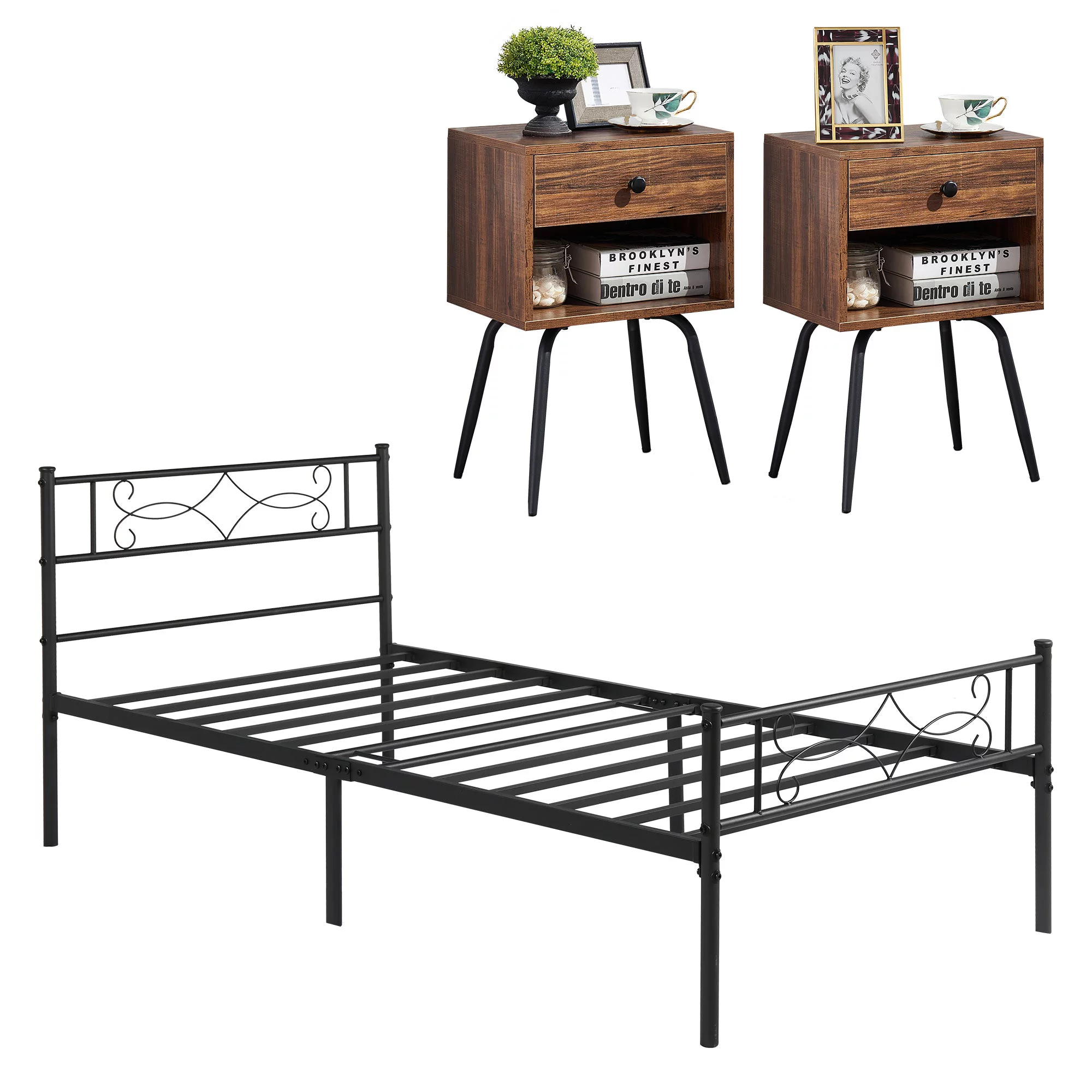 VECELO 3-Piece Bedroom Set, Twin Size Metal Bed Frame and 2 Brown Nightstand